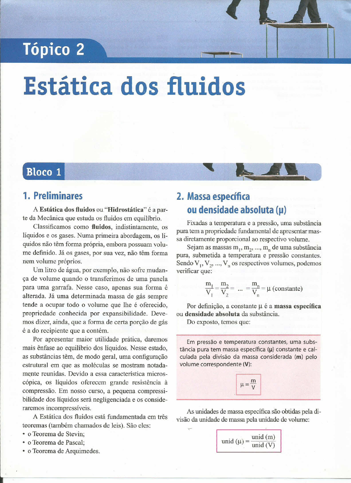 Tópico 2 Estática dos fluidos Bloco 1 1. Preliminares 2. Massa específica A Estática dos fluidos ou "Hidrostática" é a par- ou densidade absoluta (u) te da Mecânica que estuda os fluidos em equilíbrio. Fixadas a temperatura e a pressão, uma substância Classificamos como fluidos, indistintamente, os pura tem a propriedade fundamental de apresentar mas- líquidos e os gases. Numa primeira abordagem, os sa diretamente proporcional ao respectivo volume. quidos não têm forma própria, embora possuam volu- Sejam as massas de uma substância me definido. Já os gases, por sua vez, não têm forma pura, submetida a temperatura e pressão constantes. nem volume próprios. Sendo V, os respectivos volumes, podemos Um litro de água, por exemplo, não sofre mudan- verificar que: ça de volume quando o transferimos de uma panela para uma garrafa. Nesse caso, apenas sua forma é (constante) alterada. Já uma determinada massa de gás sempre tende a ocupar todo o volume que lhe é oferecido, Por definição, a constante u é a massa específica propriedade conhecida por expansibilidade. Deve- ou densidade absoluta da substância. mos dizer, ainda, que a forma de certa porção de gás Do exposto, temos que: é a do recipiente que a contém. Por apresentar maior utilidade prática, daremos Em pressão e temperatura constantes, uma subs- mais ênfase ao equilíbrio dos líquidos. Nesse estado, tância pura tem massa específica (u) constante e cal- as substâncias têm, de modo geral, uma configuração culada pela divisão da massa considerada (m) pelo estrutural em que as moléculas se mostram notada- volume correspondente (V): mente reunidas. Devido a essa característica micros- cópica, os líquidos oferecem grande resistência à m compressão. Em nosso curso, a pequena compressi- bilidade dos líquidos será negligenciada e os conside- raremos incompressíveis. As unidades de massa específica são obtidas pela di- A Estática dos fluidos está fundamentada em três visão da unidade de massa pela unidade de volume: teoremas (também chamados de leis). São eles: o Teorema de Stevin; unid (m) o Teorema de Pascal; unid (u) unid (V) o Teorema de Arquimedes.Tópico 2 Estática dos fluidos 407 No Sistema Internacional de Unidades (SI), a massa é medida em kg e o volume, em Assim: Outras unidades usuais: Água pura (1L) 1kg kg 10-3 kg kg Numa balança de travessão de braços iguais, 10-3 ou L L um litro de água contido em uma garrafa plástica de massa desprezível é equilibrado por um massor de um quilograma. kg = 3. Peso específico (p) Na tabela seguinte, fornecemos os valores usuais Consideremos várias porções de uma dada subs- das massas específicas de algumas substâncias. tância pura submetidas às mesmas condições de tem- peratura e pressão. Suponhamos, ainda, que todos esses corpos estejam em um mesmo local, em que a acelera- Material ção da gravidade é Sejam os pesos dos corpos e seus respectivos volumes. Alumínio 2,7 Latão 8,6 Cobre 8,9 Ouro 19,3 V1 V, Vn Gelo 0,92 Ferro 7,8 Chumbo 11,3 Platina 21,4 Podemos verificar que: Prata 10,5 Aço 7,8 = |P2| = = p (constante) Mercúrio 13,6 Por definição, a grandeza escalar constante p Álcool etílico 0,81 "rô") é o peso específico da substância nas condições Benzeno 0,90 de pressão e temperatura e no local considerados. Glicerina 1,26 Do exposto, temos que: Água 1,00 Sob pressão e temperatura constantes e num mes- mo local, uma substância pura tem peso específico (p) A água, à qual está subordinada a vida na Terra, é constante, calculado pela divisão do módulo do peso o líquido mais abundante do planeta, cobrindo prati- da porção considerada (P) pelo volume correspon- superfície terrestre. Por isso, o estudo da dente (V): Estática dos fluidos dá ênfase especial a essa substância. = V P É importante observar que, como a densidade ab- soluta da água é igual a 1 kg/L, existe paridade entre o número que mede a massa dessa substância em qui- Da definição, segue que: logramas e o número que mede seu volume em litros. Um quilograma de água, por exemplo, ocupa um vo- m = = lume de um litro408 PARTE III ESTÁTICA As unidades de peso específico são obtidas divi- 5. Densidade relativa dindo-se a unidade de peso (força) pela unidade de volume: Por definição, chama-se densidade de uma subs- tância A relativa a outra B o quociente das respectivas massas específicas das substâncias A e B quando à mesma temperatura e pressão: No SI, o peso é expresso em newton (N) e o volu- HA me, em Assim: Se os volumes das substâncias consideradas fo- rem iguais (VA = V), teremos: 4. Densidade de um corpo (d) Será que um corpo de ferro = 7,8 V pode ser menos denso que a água 1,0 V A resposta é sim. Para tanto, esse corpo deverá Nota: ser provido de descontinuidades internas (regiões A densidade relativa, por ser definida pelo quociente de de modo que sua massa total seja medida grandezas medidas nas mesmas unidades, é uma quanti- por um número, em gramas, menor que aquele que dade adimensional. mede, em o volume delimitado por sua super- fície externa. 6. 0 conceito de pressão Por definição, a densidade de um corpo (d) é o Suponha que você esteja comprimindo na palma quociente de sua massa (m) pelo volume delimitado de uma de suas mãos uma pelota de massa de modelar por sua superfície externa (Vext): com movimentos sucessivos de compressão e relaxa- mento. Cada vez que você aperta a pelota, seus dedos m exercem sobre ela certa pressão. A pressão é uma im- portante grandeza física que se destaca sobremaneira no estudo da Estática dos fluidos. F Gigante e flutuante! F Considere a ilustração acima, em que a superfície de área A, está sujeita a uma distribuição de forças cuja resultante é F é a componente de F tangencial a é a componente de F normal a Os navios modernos são metálicos, basicamente Por definição, a pressão média (pm) que F exer- construídos em aço. Por 