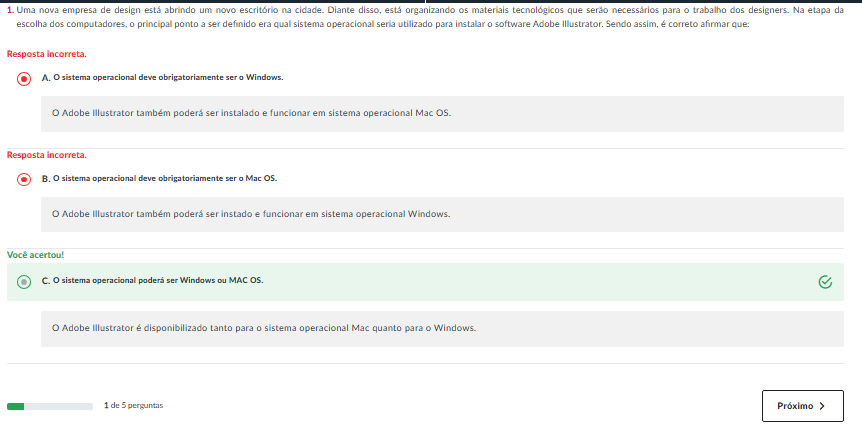 1. Uma nova empresa de design está abrindo um novo escritório na Diante organizando os tecnológicos que serão necessários para trabalho dos designers Na etapa da escolha dos principal ponto a ser definido era qual sistema operacional seria utilizado para instalar software Adobe Sendo é correto afirmar que: Resposta A. sistema operacional deve obrigatoriamente ser o Windows Adobe Illustrator também ser instalado e funcionar em sistema operacional Mac Resposta B. sistema operacional deve obrigatoriamente ser o Mac Adobe Illustrator também poderá ser instado e funcionar em sistema operacional Windows. Você acertou! o sistema operacional poderá ser Windows ou MAC Adobe Illustrator é disponibilizado tanto para sistema operacional Mac quanto para 1 de 5 perguntas Próximo
