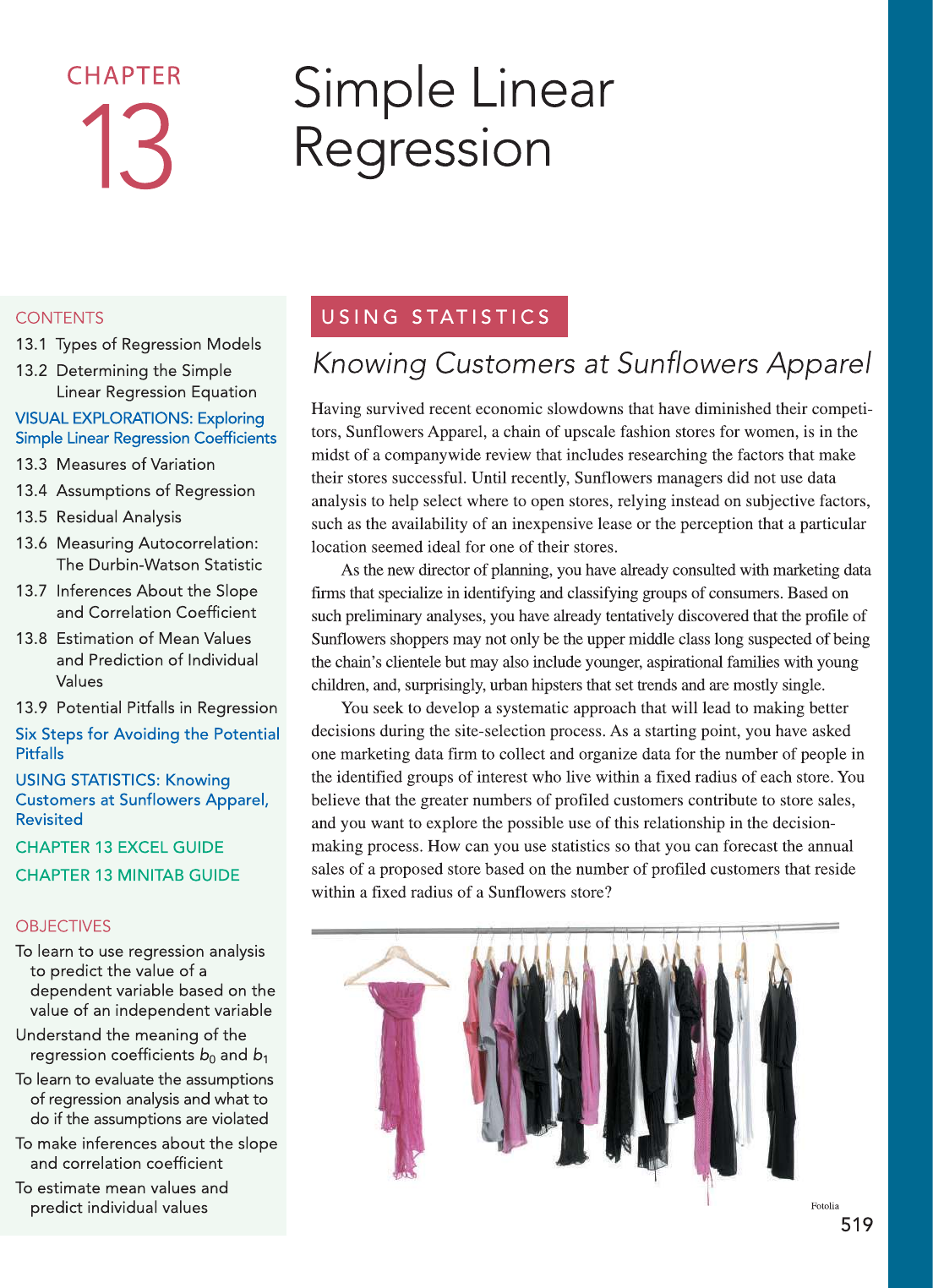 CHAPTER Simple Linear 13 Regression CONTENTS USING STATISTICS 13.1 Types of Regression Models 13.2 Determining the Simple Knowing Customers at Sunflowers Apparel Linear Regression Equation VISUAL EXPLORATIONS: Exploring Having survived recent economic slowdowns that have diminished their competi- Simple Linear Regression Coefficients tors, Sunflowers Apparel, a chain of upscale fashion stores for women, is in the 13.3 Measures of Variation midst of a companywide review that includes researching the factors that make their stores successful. Until recently, Sunflowers managers did not use data 13.4 Assumptions of Regression analysis to help select where to open stores, relying instead on subjective factors, 13.5 Residual Analysis such as the availability of an inexpensive lease or the perception that a particular 13.6 Measuring Autocorrelation: location seemed ideal for one of their stores. The Durbin-Watson Statistic As the new director of planning, you have already consulted with marketing data 13.7 Inferences About the Slope firms that specialize in identifying and classifying groups of consumers. Based on and Correlation Coefficient such preliminary analyses, you have already tentatively discovered that the profile of 13.8 Estimation of Mean Values Sunflowers shoppers may not only be the upper middle class long suspected of being and Prediction of Individual the chain's clientele but may also include younger, aspirational families with young Values children, and, surprisingly, urban hipsters that set trends and are mostly single. 13.9 Potential Pitfalls in Regression You seek to develop a systematic approach that will lead to making better Six Steps for Avoiding the Potential decisions during the site-selection process. As a starting point, you have asked Pitfalls one marketing data firm to collect and organize data for the number of people in USING STATISTICS: Knowing the identified groups of interest who live within a fixed radius of each store. You Customers at Sunflowers Apparel, believe that the greater numbers of profiled customers contribute to store sales, Revisited and you want to explore the possible use of this relationship in the decision- CHAPTER 13 EXCEL GUIDE making process. How can you use statistics SO that you can forecast the annual CHAPTER 13 MINITAB GUIDE sales of a proposed store based on the number of profiled customers that reside within a fixed radius of a Sunflowers store? OBJECTIVES To learn to use regression analysis to predict the value of a dependent variable based on the value of an independent variable Understand the meaning of the regression coefficients bo and b1 To learn to evaluate the assumptions of regression analysis and what to do if the assumptions are violated To make inferences about the slope and correlation coefficient To estimate mean values and predict individual values Fotolia 519520 CHAPTER 13 Simple Linear Regression I n this chapter and the next two chapters, you learn regression analysis techniques that help uncover relationships between variables. Regression analysis leads to selection of a model that expresses how one or more independent variables can be used to predict the value of another variable, called the dependent variable. Regression models identify the type of mathematical relationship that exists between a dependent variable and an independent vari- able, thereby enabling you to quantify the effect that a change in the independent variable has on the dependent variable. Models also help you identify unusual values that may be outliers (see page 606). This chapter discusses simple linear regression models that use a single numerical independent variable, X, to predict the numerical dependent variable, Y. (Chapters 14 and 15 discuss multiple regression models that use several independent variables to predict the dependent variable.) In the Sunflowers scenario, your initial belief reflects a possible sim- ple linear regression model in which the number of profiled customers would be the single numerical independent variable, X, being used to predict the annual sales of the store, the dependent variable, Y. 13.1 Types of Regression Models Using a scatter plot (also known as scatter diagram) to visualize the X and Y variables, a tech- nique introduced in Section 2.5 on page 93, can help suggest a starting point for regression analysis. The scatter plots in Figure 13.1 illustrates six possible relationships between an X and Y variable. FIGURE 13.1 Y Y Six types of relationships found in scatter plots X Panel A Panel B Positive linear relationship Negative linear relationship Y X Panel C Panel D Positive curvilinear relationship U-shaped curvilinear relationship Y Y X Panel E Panel F Negative curvilinear relationship No relationship between X and Y13.1 Types of Regression Models 521 In Panel A, values of Y are generally increasing linearly as X increases. This panel is simi- lar to Figure 13.3 on page 522, which illustrates the positive relationship between the num- ber of profiled customers of the store and the store's annual sales for the Sunflowers Apparel women's clothing store chain. Panel B is an example of a negative linear relationship. As X increases, the values of Y are generally decreasing. An example of this type of relationship might be the price of a particular product and the amount of sales. As the price charged for the product increases, the amount of sales may tend to decrease. Panel C shows a positive curvilinear relationship between X and Y. The values of Y increase as X increases, but this increase tapers off beyond certain values of X. An example of a positive curvi- linear relationship might be the age and maintenance cost of a machine. As a machine gets older, the maintenance cost may rise rapidly at first but then level off beyond a certain number of years. Panel D shows a U-shaped relationship between X and Y. As X increases, at first Y gener- ally decreases; but as X continues to increase, Y not only s