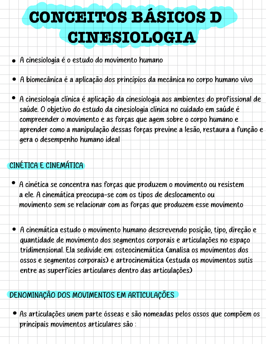 CONCEITOS BÁSICOS DE CINESIOLOGIA A cinesiologia é o estudo do movimento humano A biomecânica é a aplicação dos princípios da mecânica no corpo humano vivo A cinesiologia clínica é aplicação da cinesiologia aos ambientes do profissional de saúde. O objetivo do estudo da cinesiologia clínica no cuidado em saúde é compreender o movimento e as forças que agem sobre o corpo humano e aprender como a manipulação dessas forças previne a lesão, restaura a função e gera o desempenho humano ideal CINÉTICA E CINEMÁTICA A cinética se concentra nas forças que produzem o movimento ou resistem a ele. A cinemática preocupa-se com os tipos de deslocamento ou movimento sem se relacionar com as forças que produzem esse movimento A cinemática estudo o movimento humano descrevendo posição, tipo, direção e quantidade de movimento dos segmentos corporais e articulações no espaço tridimensional. Ela sedivide em: osteocinemática (analisa os movimentos dos ossos e segmentos corporais) e artrocinemática (estuda os movimentos sutis entre as superfícies articulares dentro das articulações) DENOMINAÇÃO DOS MOVIMENTOS EM ARTICULAÇÕES As articulações unem parte ósseas e são nomeadas pelos ossos que compõem os principais movimentos articulares são : S - s : Flexão: aproxima dois ossos, diminuindo o ângulo articular (plano sagital) Extensão : afasta os ossos, aumentando o ângulo articular Abdução: afasta o seguimento da linha medial Adução: aproxima da linha medial Flexão lateral : inclinação lateral do pescoço ou tronco (plano frontal) Rotação: giro em torno de um eixo longitudinal, pode ser medial (interna) ou lateral (externa) Pronação: rotação do antebraço com palmas para baixo Supinação: rotação do antebraço com palmas para cima Desvios do punho: desvio ulnar (adução) e desvio radial (abdução) Articulações específicas: umeroulnar (flexão do cotovelo) e talotibial (flexão do tornozelo) Protração e retração: movimentos para frente para trás no plano horizontal OSTEOCINEMÁTICA O movimento osteocinemático é aquele facilmente visualizado e sentido a medida que os ossos se movem durante a atividade funcionais Os osteocinemática se preocupa com os movimentos de nossas alavancas ósseas ao longo de suas amplitude de movimento S S - S S / S - T S S L ↑ A osteocinemática descreve o movimento que ocorre entre os corpos de dois adjacentes à medida que os dois segmentos corporais se movem um em relação ao outro Exemplos: flexão de antebraço em direção ao úmero no cotovelo e o aumento do ângulo da tíbia com fêmur durante a extensão do joelho · - Descrição dos tipos de movimento: Movimento translacional: no movimento translacional ou linear, o deslocamento ocorre ao longo de um eixo ou paralelamente a ele. O movimento linear significa que todos os pontos no objeto em movimento percorrem a mesma distância, na mesma direção, com a mesma velocidade e ao mesmo tempo. Exemplo de movimento translacional é um elevador, esse movimento acontece em linha reta e também é chamado de retilíneo. Curvelíneo é quando o objeto percorre um caminho em curva Movimento rotatório: no movimento rotatório ou angular, o deslocamento ocorre em um círculo em torno de um eixo. Os movimentos articulares ocorrem em torno de um eixo e são rotatórios, de um modo que cada ponto em um seguimento ósseo adjacente articulação seguirá o arco de um círculo cujo centro é o eixo articular. Exemplo, com o úmero estabilizado na flexão e a extensão do cotovelo, o antebraço faz rotação em torno do eixo da articulação do cotovelo. Quanto maior for a distância do eixo de movimento, maior será a velocidade do ponto Graus de liberdade: Os graus de liberdade indicam quantos planos uma articulação pode se mover. Articulações uniaxiais (como dobradiça e pivô) tem 1° de liberdade. As biaxiais (condioloide, elipsodal e sela) tem 2° e permitem movimentos em dois planos. As triaxiais (como ombro e quadril) tem 3° de liberdade e realizam movimentos mais complexos, incluindo a circundação. A combinação dos movimentos articulares permite ações corporais suaves e funcionais Sensação no final do movimento: : As sensações no final do movimento indica um tipo de limite que interrompe o movimento articular. A sensação óssea é rígida e ocorre com o contato entre os ossos, como na extensão do cotovelo. A sensação firme (capsular) vem da resistência de ligamentos ou cápsulas. A sensação suave acontece pelo contato entre tecidos moles, como músculos. Já em casos de disfunção, pode haver uma sensação vazia, marcada por dor ou falta de resistência, indicando lesão ou estabilidade articular S Cadeia cinemáticas: Cadeias cinemáticas são formadas por articulações que conectam segmentos do corpo. Nos movimentos humanos, a cadeias cinemáticas abertas e fechadas. Nas abertas, o seguimento distal se move livremente, e cada parte pode se mover independentemente. Já na fechada, o seguimento distal está fixo, e o movimento ocorre nos segmentos aproximais. A cadeia aberta permite movimentos mais rápidos, enquanto a cadeia fechada gera mais força e estabilidade. A caminhada combina as duas, o apoio no chão é cadeia fechada e o balanço da perna é cadeia aberta ARTROCINEMÁTICA Enquanto a osteocinemática se preocupa com o movimento dos ossos e se submete, sobretudo, ao controle voluntário, a artrocinemática estuda como duas superfícies articulares se movem uma sobre a outra Do ponto de vista funcional, alguns tipos de articulações são primariamente responsáveis pela geração da estabilidade, enquanto outras fornecem, sobretudo, mobilidade Estrutura articular: A artrologia é o estudo das articulações quanto à sua estrutura, função e classificação. Existem três tipos principais: Sinatrodiais: são articulações fixas e estáveis, unidas por ter sido fibroso, como as sindesmoses (entre rádio/ulna e tíbia