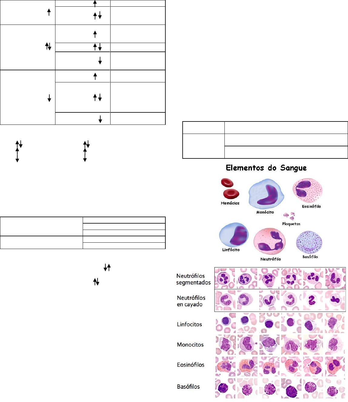 RESUMO: PATOLOGIA CLÍNICA VITÓRIA DAUDT HOFF ERITROGRAMA VALORES FISIOCOLÓGICOS DE PPT: GRAU DE DESIDRATAÇÃO CANINO/FELINO: 6 – 8 BOVINO: 7 – 8,5 OVINO: 6 – 7,5 EQUINO: 5,2 – 7,9 RELAÇÃO HEMATÓCRITO x PPT HEMATÓCRITO PPT Desidratação PPT Desidratação mascarada por hipoproteinemia, contração esplênica HEMATÓCRITO PPT Anemia mascarada por desidratação, aumento de globulinas PPT Normal PPT Perda proteica, produção diminuída (hepático) HEMATÓCRITO PPT Anemia associada a desidratação PPT Destruição de eritrócitos, diminuição da eritropoiese, perda crônica de sangue, Fe baixo PPT Fluidoterapia, perda de sangue ANEMIA: CLASSIFICAÇÃO MORFOLÓGICA VCM Normocítica CHCM Normocrômica VCM Macrocítica CHCM Hipercrômica VCM Microcític CHCM Hipocrômica ANEMIA: CLASSIFICAÇÃO QUANDO A MASSA GLOBAL RELATIVA: expansão plasmática (gestação, neonatos e fluidoterapia) ABSOLUTA: redução da massa eritrocitária (clínica) ANEMIA: CLASSIFICAÇÃO FISIOPATOLÓGICA POR PERDA DE SANGUE Hemólise aguda Hemorragia crônica Anemía hemolítica HIPOPROLIFERATIVA Deficiência nutricional Desordens orgânicas ANEMIA: CLASSIFICAÇÃO QUANTO A RESPOSTA MEDULAR NÃO-REGENERATIVA: eritropoetina eritrócitos REGENERATIVA: eritropoetina eritrócitos Perda sanguínea ou Hemólise; Caracterizada por: policromasia ou policromatofilia, presença de corpúsculos de Howell-jolly, presença de metarrubócitos, reticulócitos ALTERAÇÃO NO TAMANHO DOS ERITRÓCITOS MACROCITOSE: presença de reticulócitos e metarrubócitos MICROCITOSE: anemias crônicas, anemias ferropriva ou por deficiência de fatores de maturação ALTERAÇÕES NA COR DOS ERITRÓCITOS Policromasia ou policromatofilia são hemácias azuladas que possuem afinidade por corantes basofílicos. HIPOCROMIA: palidez pela diminuição de hemoglobina HIPERCROMIA: intensidade da cor pela presença de hemoglobina ALTERAÇÕES NA FORMA DOS ERITRÓCITOS ESFERÓCITOS: Sem área pálida central característica. Anemias auto-imunes. Diagnóstico para anemia imunomediada. ESQUISÓCITOS: Células deformadas ou fragmentos de eritrócitos. Doenças renais crônicas, esplênicas e anemias ferroprivas. EQUINÓCITOS: Eritrócitos estrelados. Problemas na confecção do esfregaço ou excesso de EDTA. CODÓCITOS: Área central densa de hemoglobina separada de área circular clara. Aumentos dos níveis de colesterol. ACANTÓCITOS: Forma irregular. Aumento das taxas de colesterol e ou fosfolipídeos. RETICULÓCITOS: Eritrócitos jovens não maturato, com azul de metileno RNA precipita. Normal ter 1-2%. Anemia regenerativa aumentado. Equino não tem. METARRUBÓCITOS: Último estágio nucleado das hemácias. Aumentado em resposta intensa a anemias graves ou problemas esplênicos. Normal 1/100 leucócitos. COSPÚSCULOS DE INCLUSÃO CORPÚSCULOS DE HOWELL-JOLLY: Pontos basofílicos, quase negros, restos nucleares. Anemias regenerativas. CORPÚSCULOS DE HEINZ: Hemoglobina desnaturada e precipitada, formato arredondado, pequeno e refrigente. Uso de drogas oxidantes, couve, cebola, e cães esplenectomizados CORPÚSCULOS DE LENTZ: Tamanho variável, de cinza pálido até rosa forte. Cinomose canina. PONTEADO BASOFÍLÍCO: Intensa eritropoiese ou intoxicação por chumbo POLICITEMIAS Aumento do número de eritrócitos, da taxa de hemoglobina e/ou do hematócrito. RELATIVA Redução do volume plasmático devido desidratação, ocorrendo Hemoconcentração ABSOLUTA PRIMÁRIA Doença miloproliferativa SECUNDÁRIA Elevada produção de eritropoetina hipóxia ou neoplasia LEUCOGRAMA: INTERPRETAÇÃO Citose ou filia valores acima do fisiológico Penia valores abaixo do fisiológico LEUCÓCITOS LEUCOCITOSE FISIOLÓGICA: medo, excitação, gestação, parto, exercício físico. PATOLÓGICA: infecções bacterianas, atos cirúrgicos, desordens linfoproliferativas e mieloproliferativas LEUCOPENIA Doenças virais, inf bac graves, drogas e produtos tóxicos, neoplasia de medula óssea, toxemia endógenam parasitas, transtornos físicos, deficiência de vit B12 e ácido fólico. NEUTRÓFILOS NEUTROFILIA FISIOLÓGICA: ação da epinefrina e estresse REATIVA DESVIO A ESQUERDA REGENERATIVO: Segmentados maior do que bastonetes. Inflamação aguda. DESVIO A ESQUERDA DEGENERATIVO: Bastonetes iguais ou maior que segmentados. Pode ter leucopenia. Septicemia. DESVIO A DIREITA: Hipersegmentados. Uremia ou corticoide. NEUTROPENIA Por decréscimo da sobrevida, diminuição na produção ou granulopoiese ineficaz. EOSINÓFILOS EOSINOFILIA Hipersensibilidade EOSINOPENIA Excesso de corticoide endógeno (hiperadrenocorticismo ou stress) ou exógeno BASÓFILOS BASOFILIA Dirofilariose, ancilostomose duodenal, hipersensibilidade, hipotireoidismo, leucemia basofílica BASOPENIA Normal LINFÓCITOS LINFOCITOSE Fisiológica: epinefrina ou vacinação Doença imunomediada, estimulação antigênica crônica, linfoma, leucemia viral bovina. LINFOPENIA Excesso de corticoide, perda de linfócitos, linfopoiese reduzida, estágio agudo de infecções virais. MONÓCITOS MONOCITOSE Inflamação e necrose tecidual, aumento dos níveis de glicocorticoides, supuração, distúrbios granulomatosos, leucemia monocítica ou mielomonocítica. MONOCITOPENI A Não significativa LECUCOGRAMA CANINO FELINO LEUCÓCITOS 6000 – 17000 5500 – 19500 BASTONETES 0 – 390 0 – 300 SEGMENTADOS 6000 – 9750 NEUTRÓFILOS 3000 – 11500 2500 – 12500 LINFÓCITOS 1000 – 4800 1500 – 7000 EOSINÍFILOS 150 – 1250 0 – 1500 MONÓCITOS 150 – 1350 0 – 850 BASÓFILOS Raros Raros FIBRINOGÊNIO 200 – 400 50 -300 PROTEÍNA TOTAL 6 – 8 6 – 8 PLAQUETAS 200 – 500 300 – 800 RETICULÓCITOS 0 – 1,5 0 – 0,4 ERITROGRAMA CANINO FELINO ERITRÓCITOS 5,5 – 8,5 5 – 10 HEMOGLOBINA 12 – 18 8 – 15 VG 37 – 55 24 – 45 HGM 19 – 23 13 – 17 VCM 60 – 77 39 – 55 CHCM 32 – 36 31 – 35 VALORES DE REFERÊNCIA BIOQUÍMICOS CANINO FELINO ÁCIDO ÚRICO 0 – 2 0 – 10 ALBUMINA 2,6 – 3.3 2,1 – 3