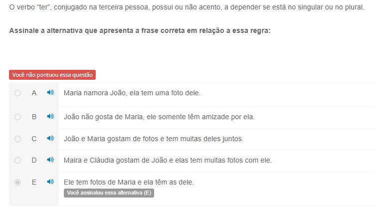verbo "ter", conjugado na terceira pessoa, possui ou não acento, a depender se está no singular ou no plural. Assinale a alternativa que apresenta a frase correta em relação a essa regra: Você não pontuou essa questão A Maria namora ela tem uma foto dele B João não gosta de Maria, ele somente têm amizade por ela. C João e Maria gostam de fotos e tem muitas deles juntos. D Maira e Cláudia gostam de João e elas tem muitas fotos com ele. E Ele tem fotos de Maria e ela têm as dele. Você assinalou essa alternativa (E)