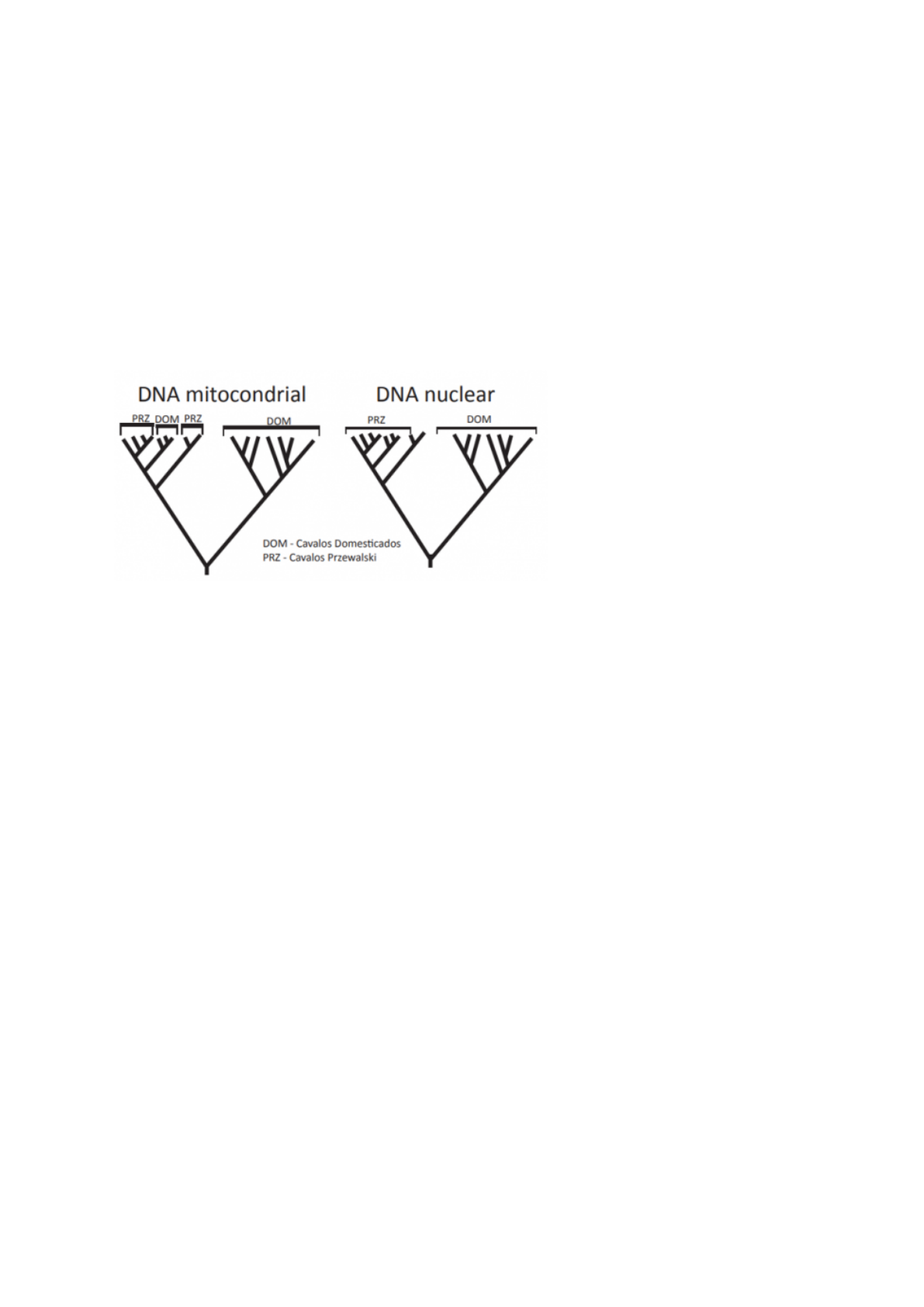 Um consultor ambiental preparou uma palestra sobre a importância de uma região em franco processo de desenvolvimento industrial na China, onde residem os últimos cavalos selvagens do planeta, os cavalos de Przewalski, que deram origem aos cavalos domesticados que vemos ao redor do planeta. Nesse contexto, foram propostas duas análises filogenéticas a fim de comparar as populações de cavalos domésticos e de cavalos de Przewalski. A primeira delas foi realizada usando o genoma mitocondrial, já a segunda utilizou o genoma nuclear. O resultado dessas análises está ilustrado nas figuras a seguir. Considerando as duas filogenias e as conclusões possíveis para essas análises, avalie as afirmações a seguir. I. A filogenia com DNA mitocondrial sugere que durante a história dessas linhagens ocorreu mais de um evento de domesticação, mas a filogenia com DNA nuclear indica que um único evento de domesticação é suficiente para explicar o padrão encontrado. II. Uma maior diversidade de fundadores machos do que de fundadores fêmeas das populações domesticadas explica a diferença entre as duas filogenias. III. A diferença entre o número de eventos de domesticação em cada filogenia poderia ser explicada por uma baixa amostragem com DNA nuclear e uma alta amostragem com DNA mitocondrial. É correto o que se afirma em: ● I, apenas. ● II, apenas. ● I e III apenas. ● II e III apenas. 5 As folhas são órgãos laterais que se inserem sobre o caule principal e os ramos e, devido à sua diversidade, podem ser importantes ferramentas dendrológicas na identificação de espécies. A respeito da morfologia das folhas, é correto afirmar que: ● Folhas bipinadas ou recompostas são aquelas em que os folíolos se dividem em folíolos. ● Folhas inseridas em dupla em um mesmo nó caracterizam a filotaxia verticilada. ● Folhas compostas digitadas se dividem em dois folíolos. ● Folhas compostas bifolioladas apresentam a raqui alada. 5 Sob o ponto de vista socioeconômico, a hidroponia é um sistema de produção agrícola considerado ecologicamente viável, devido à grande possibilidade de ser aplicado com êxito em condições e usos distintos. Por meio dessa técnica, plantas de interesse econômico, como verduras, frutas, flores, ervas aromáticas e plantas ornamentais, são cultivadas sem terra e, dessa forma, suas raízes ficam suspensas. Ao sistema é adicionado o líquido hidropônico, uma solução nutritiva contendo íons solubilizados, que é necessária para o desenvolvimento normal da planta. SARDARE, M. D; ADMANE, S. V.A Review on plant without soil “hydroponics. International Journal of Research in Engineering and Technology, 2, n. 3, p. 299-304, 2013 (adaptado). Considerando o texto, avalie as afirmações a seguir. I. A absorção de água pela raiz de uma planta hidropônica é consequência do transporte passivo de íons para o interior do floema desse órgão, que provoca aumento da pressão osmótica da raiz em relação ao líquido hidropônico. II. A concentração da solução nutritiva está relacionada com a produtividade agrícola das plantas cultivadas em um sistema hidropônico até o limite da capacidade de absorção de nutrientes pelas raízes. III. A condução da água por capilaridade das raízes em direção a outras partes da planta cultivada em um sistema hidropônico correlaciona os processos de absorção e transpiração. É correto o que se afirma em: ● I, apenas. ● II, apenas. ● I e II, apenas. ● II e III, apenas.