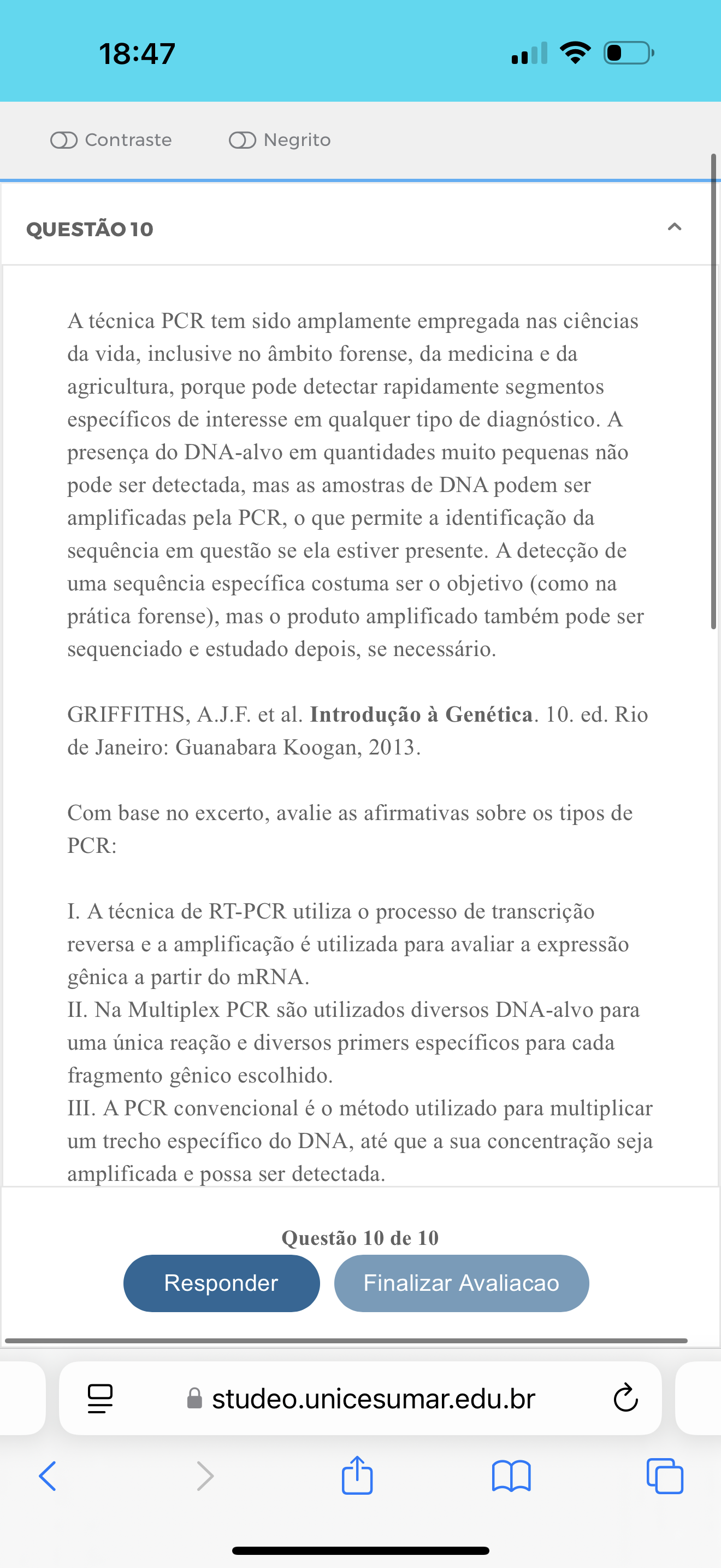 18:47 Contraste Negrito QUESTÃO 10 A técnica PCR tem sido amplamente empregada nas ciências da vida, inclusive no âmbito forense, da medicina e da agricultura, porque pode detectar rapidamente segmentos específicos de interesse em qualquer tipo de diagnóstico. A presença do DNA-alvo em quantidades muito pequenas não pode ser detectada, mas as amostras de DNA podem ser amplificadas pela PCR, o que permite a identificação da sequência em questão se ela estiver presente. A detecção de uma sequência específica costuma ser o objetivo (como na prática forense), mas o produto amplificado também pode ser sequenciado e estudado depois, se necessário. GRIFFITHS, A.J.F. et al. Introdução à Genética. 10. ed. Rio de Janeiro: Guanabara Koogan, 2013. Com base no excerto, avalie as afirmativas sobre os tipos de PCR: I. A técnica de RT-PCR utiliza o processo de transcrição reversa e a amplificação é utilizada para avaliar a expressão gênica a partir do mRNA. II. Na Multiplex PCR são utilizados diversos DNA-alvo para uma única reação e diversos primers específicos para cada fragmento gênico escolhido. III. A PCR convencional é o método utilizado para multiplicar um trecho específico do DNA, até que a sua concentração seja amplificada e possa ser detectada. Questão 10 de 10 Responder Finalizar Avaliacao studeo.unicesumar.edu.br