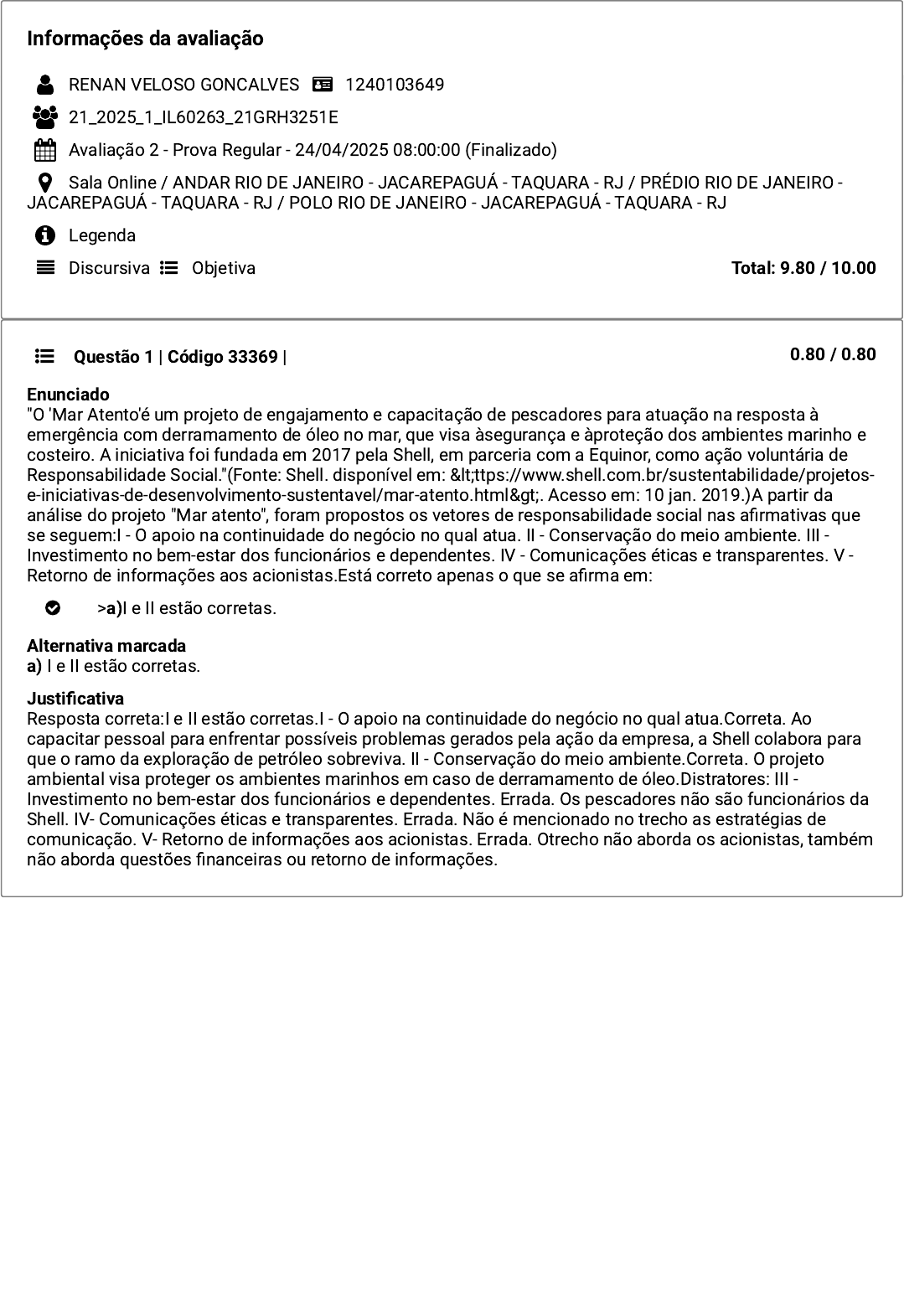 Informações da avaliação RENAN VELOSO GONCALVES 1240103649 21_2025_1_IL60263_21GRH3251E Avaliação 2 - Prova Regular - 24/04/2025 08:00:00 (Finalizado) Sala Online / ANDAR RIO DE JANEIRO - JACAREPAGUÁ - TAQUARA - RJ / PRÉDIO RIO DE JANEIRO - JACAREPAGUÁ - TAQUARA - RJ / POLO RIO DE JANEIRO - JACAREPAGUÁ - TAQUARA - RJ Total: 9.80 / 10.00 Legenda Discursiva Objetiva Questão 1 | Código 33369 | 0.80 / 0.80 Enunciado "O 'Mar Atento'é um projeto de engajamento e capacitação de pescadores para atuação na resposta à emergência com derramamento de óleo no mar, que visa àsegurança e àproteção dos ambientes marinho e costeiro. A iniciativa foi fundada em 2017 pela Shell, em parceria com a Equinor, como ação voluntária de Responsabilidade Social."(Fonte: Shell. disponível em: <ttps://www.shell.com.br/sustentabilidade/projetos- e-iniciativas-de-desenvolvimento-sustentavel/mar-atento.html>. Acesso em: 10 jan. 2019.)A partir da análise do projeto "Mar atento", foram propostos os vetores de responsabilidade social nas afirmativas que se seguem:I - O apoio na continuidade do negócio no qual atua. II - Conservação do meio ambiente. III - Investimento no bem-estar dos funcionários e dependentes. IV - Comunicações éticas e transparentes. V - Retorno de informações aos acionistas.Está correto apenas o que se afirma em: Justificativa Resposta correta:I e II estão corretas.I - O apoio na continuidade do negócio no qual atua.Correta. Ao capacitar pessoal para enfrentar possíveis problemas gerados pela ação da empresa, a Shell colabora para que o ramo da exploração de petróleo sobreviva. II - Conservação do meio ambiente.Correta. O projeto ambiental visa proteger os ambientes marinhos em caso de derramamento de óleo.Distratores: III - Investimento no bem-estar dos funcionários e dependentes. Errada. Os pescadores não são funcionários da Shell. IV- Comunicações éticas e transparentes. Errada. Não é mencionado no trecho as estratégias de comunicação. V- Retorno de informações aos acionistas. Errada. Otrecho não aborda os acionistas, também não aborda questões financeiras ou retorno de informações. >a)I e II estão corretas. Alternativa marcada a) I e II estão corretas. Questão 2 | Código 33771 | 0.80 / 0.80 Enunciado O investimento em educação é uma possibilidade de ação social para empresas que desejam configurar-se como socialmente responsáveis. Por isso, em uma reunião de gestores foi sugerido queuma determinada empresa ofereçabolsas de estudos para jovens de baixa renda.Diante desse cenário, segundo o princípio da equidade, podemos avaliar que:I.Devem-se oferecer bolsas para jovens de todas as classes sociais, de forma igual.PORQUEII.Todos são iguais, e equidade significa não fazer distinções.A respeito dessas afirmativas, assinale a opção correta. Justificativa Resposta correta:As afirmativas I e II são proposições falsas.A afirmativaI está incorreta. Pelo principio da equidade, devem ser oferecidas mais bolsas para os estudantes que são mais afetados pela desigualdade social. Equidade significa fazer justiça social, tentar corrigir as desigualdades.A afirmativaII também está incorreta.O principio da equidade não é o princípio da igualdade. Todos não são iguais, pois há uma série de fatores econômicos e políticos que colocam muitos em desvantagem, gerando a desigualdade social. Na equidade, é importante fazer essas distinções para tentar compensar ou corrigir os problemas causados pela desigualdade. >c)As afirmativas I e II são proposições falsas. Alternativa marcada c) As afirmativas I e II são proposições falsas. Questão 3 | Código 33787 | 0.80 / 0.80 Enunciado Para elaborarmos uma política de responsabilidade social corporativa, devemos conhecer as metas da Organização das Nações Unidas – ONUpara atingir a sustentabilidade. Diante disso,seguem alguns trechos da política de responsabilidade social de Furnas. Contribuir para a erradicação da fome e da pobreza. Promover a universalização do ensino básico de forma inclusiva, equitativa e de qualidade. Promover a equidade de gênero e a autonomia das mulheres. Promover a igualdade de oportunidades visando à redução das desigualdades sociais. Promover a saúde e o bem-estar de todos, em todas as idades. Marque a alternativa que engloba corretamente todos os trechos que estão em sintonia com as metas da ONU. Justificativa Resposta correta:I, II, III, IV e V.A afirmativa I está correta. O combate à pobreza, bem como a suas causas e consequências, estánas metas da ONU.E ocombate à fome é abordadode forma explícita no documento.A afirmativa II está correta. A educação para todos é uma meta da ONU.Aforma inclusiva dá condições a pessoas com deficiência, aos pobres, aos excluídos de forma geral, de fazerem parte da sociedade de forma mais efetiva, por meio da educação.A afirmativa III está correta. A equidade de gêneros é uma das metas da ONU, por issomais esforços devem ser investidos nas mulheres, pois estão em desvantagem histórica, e isso se torna explicito ao analisar emprego, renda, participação política.A afirmativa IV está correta. O combate às desigualdades é meta da ONU.A afirmativa V está correta. Saúde para todos também é meta da ONU. >e)I, II, III, IV e V. Alternativa marcada e) I, II, III, IV e V. Questão 4 | Código 33357 | 0.80 / 0.80 Enunciado "O Instituto Ethos de Empresas e Responsabilidade Social é uma Oscip cuja missão é mobilizar, sensibilizar e ajudar as empresas a gerir seus negócios de forma socialmente responsável, tornando-as parceiras na construção de uma sociedade justa e sustentável."(Fonte: Instituto Ethos. Disponível em: <https://www.ethos.org.br/conteudo/sobre-o-instituto/#.XD3aKlxKi00>. Acesso em: 10 jan. 2019.)Diante disso, analise as asserções a seguir e a relação proposta entre elas.I – A responsabilidade social se aplica a empresas de grande porte q