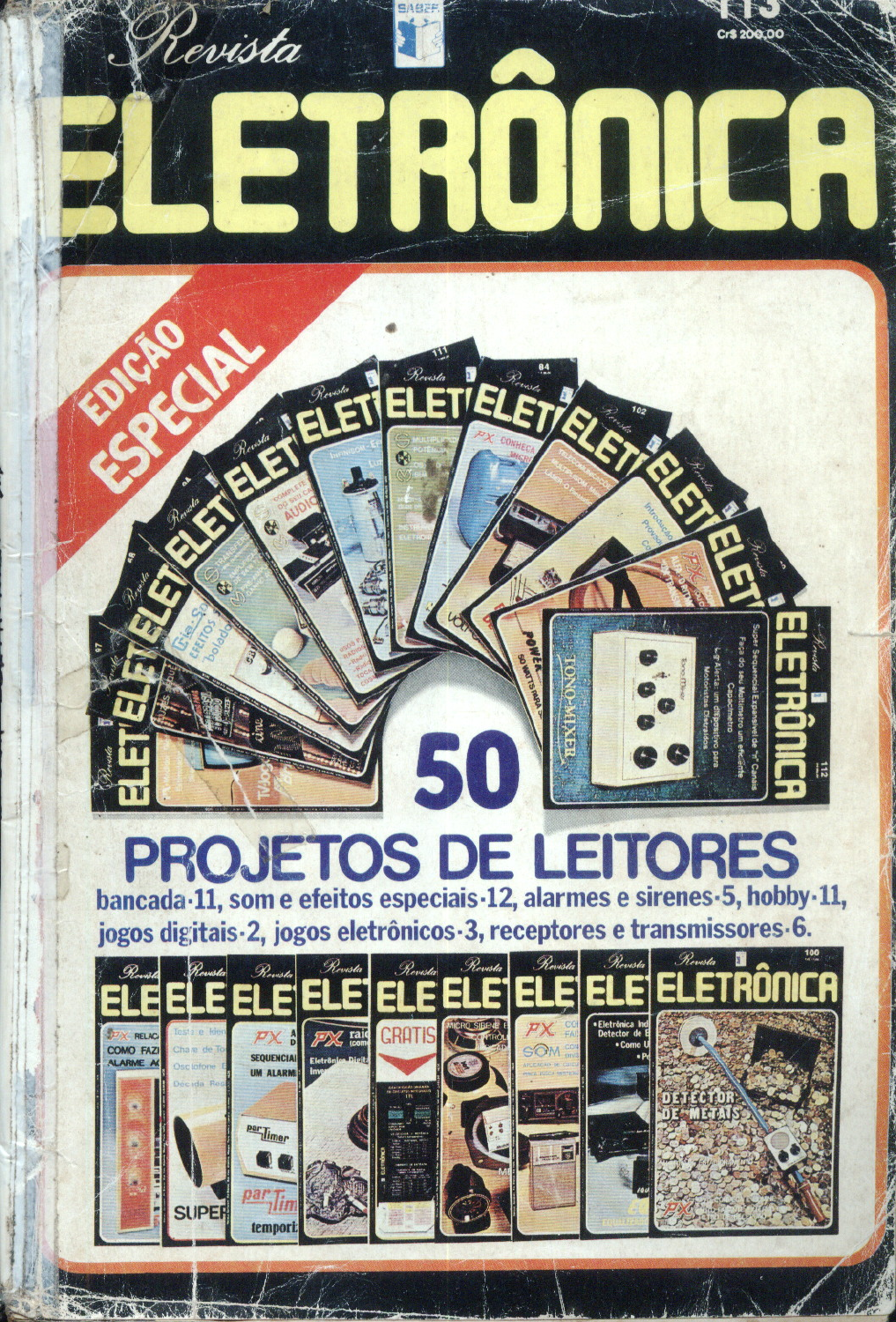 Revista Cr$ ELETRÔNICA 84 102 50 PROJETOS DE LEITORES bancada-11, som e efeitos especiais-12, alarmes e sirenes-5, hobby-11, jogos jogos receptores e Revista Rovista Revista 100 ELEELEELE ELE ELEELE ELE ELE ELETRÔNICA RELAC PX Ind PX GRATIS Detector de COMO FAZI SOM Como ALARME SEQUENCIA Osc UM ALARM par par SUPERRECEPTORZINHO DE FM ROBERTO CARLOS Brasília DF Receptores super-regenerativos podem para tornar o receptor utilizável efetiva- aliar uma grande sensibilidade a uma gran- mente. de simplicidade. Se bem que a seletividade e a qualidade de som deste tipo de recep- o CIRCUITO tor não possa ser considerada excelente, o transistor Q1 é a base do detector podemos dizer que para o caso de monta- super-regenerativo, cuja frequência de gens experimentais ou recreativas essas recepção é determinada por L1 e jun- características são suficientes. tamente com C3. Esta bobina L1 consta de o receptor que damos leva 4 transisto- 3 a 4 espiras de fio esmaltado 28 numa res e apresenta boa sensibilidade, poden- forma com diâmetro de 1 cm. o trimer é do ser sugerido como montagem experi- comum e o variável é do tipo miniatura mental para a captação de estações de FM para FM. o choque de RF consta de aproximada- Se a estação for forte e próxima, a quali- mente 50 voltas de fio esmaltado fino num dade de som pode ser boa o suficiente resistor de 100k 1/2W. BF494 R4 R5 R6 R7 R8 C3 470K 22K C5 220 15K TRIMER K COMUM C2 VARIAVEL DRIVER T2 PEQUENO SAIDA 1K C4 Q2 BC548 BC548 Q3 C6 100K R3 XRF 33K 04 BC548 9V T1 é o componente que faz a transferên- MONTAGEM cia do sinal da etapa super-regenerativa para a entrada da etapa de áudio. Trata-se o máximo de cuidado deve ser tomado de um transformador driver comum para com a montagem, principalmente dos transistores. componentes em torno de Sendo esta A etapa de áudio leva 3 transistores etapa de alta frequência, todas as ligações NPN para uso geral, fornecendo uma devem ser curtas e amplificação suficiente para excitar um Se bem que a montagem ideal deva alto-falante via T2, que é um transforma- fazer uso de placa de circuito impresso, os dor de saída. montadores mais habilidosos poderão ter A alimentação do circuito é feita com resultados satisfatórios mesmo com o uso uma tensão de 9V e a antena é do tipo de pontes de terminais. telescópico com aproximadamente 50 cm. o ajuste do ponto de funcionamento é Os capacitores eletrolíticos são para 12V obtido no trim-pot R2 e simultaneamente e os demais são cerâmicos ou de poliéster. nos trimers. Fevereiro/82 3caça níqueis eletrônico RICARDO JOSÉ BARBOSA SERRANO Olinda PE Para os que gostam dos jogos eletrôni- pode ganhar um prêmio que consiste na têm boa experiência no projeto de pla- devolução de uma certa quantidade de cas de circuito impresso e sabem trabalhar fichas. com integrados, eis aqui algo interessante. As figuras no final do processo páram Trata-se de uma versão eletrônica do em sequência, e para "ganhar" o prêmio tradicional jogo de Caça-Níqueis, muito devem ser todas iguais. comum nos cassinos. COMO FUNCIONA Neste jogo, temos uma "máquina" em o circuito de entrada leva um oscilador, que o jogador em primeiro lugar introduz que usa um único integrado 555. uma ficha. Depois, este mesmo jogador Temos em seguida um circuito sequen- puxa uma alavanca que dá início a um pro- ciador, que faz a contagem dos pulsos do cesso aleatório em que figuras de frutas se oscilador, mas de tal modo a haver a para- sucedem em um visor. da também em sequência. Para a parada Conforme a combinação de figuras que em sequência são usados monoestáveis se obtém no final do processo, o jogador com tempos programados. C3 C2 220uf P1 R3 47K R4 22K 33K CH-1 47K 14 10 11 9 9 11 10 14 4 8 3 3 5 7 2 74121 74121 R2 555 C4 CI-3 22K CI-1 CI-2 5 4 4 6 5 7 6 7 6 + 3 C1 10 9 4 5 2 1/4 CI-4 7408 1/4 CI-4 7408 7408 14 7 8 6 3 5 1/4 CI-7 2 7432 14 1/4 7 7432 6 3 R15 2 3 12 11 220.0 2 3 12 11 2 3 12 11 7474 7474 7 14 7474 7 14 CI-10 7 14 CI-9 CI-8 6 5 8 9 6 5 9 6 5 8 9 10 9 13 1/4 CI-6 2 a 5 1/4 CI-6 12 1 2 4 1/4 CI-5 5 CI-5 7408 7408 7408 1/4 CI-5 14 7 7408 7408 14 7408 3 6 8 11 3 6 R10 R11 R9 2200 R7 2200 2200 FLA10 FLA10 AMAR AMAR D2 FLAIO R13 2200 D6 FLV11 07 FLV110 09 03 D4 FLV110 D1 FLV110 VERM VERDE VERDE VERM VERDE Finalmente para registrar os resultados leds cada um, sendo um vermelho, um foram usados contadores, que utilizam 3 amarelo e um verde. Revista Saber Eletrônica 4Para jogar, aciona-se um interruptor de suportar toda a carga de funcionamento pressão, que faz as vezes da "alavanca" do do aparelho. jogo tradicional. SUGESTÕES PARA JOGO Os leds começam então a piscar, paran- Cada jogador aposta uma ficha e aciona do então um da primeira fila que define o interruptor de pressão, dando início ao portanto a primeira cor. processo de sorteio. Alguns segundos depois, pára um da Se as três cores definidas forem iguais o segunda fila, quando então temos a segun- jogador ganha um certo número de fichas da definição. Finalmente, temos a parada da "banca", como por exemplo: de oscilação da terceira fila, quando então Todas vermelhas 3 fichas temos a definição de mais uma cor. Todas amarelas 5 fichas Vence o jogador que conseguir as mes- Todas verdes 10 fichas mas cores no final, ou seja, todos verdes, todos vermelhos, ou, então, todos amare- Se as cores forem diferentes, o jogador, los. evidentemente, perde a ficha apostada MONTAGEM para a "banca". Evidentemente, pela quantidade de cir- Os leitores dotados de imaginação cuitos integrados utilizados será conve- podem acrescentar, na saída deste circui- niente usar uma placa de circuito impresso to, um conjunto de portas capazes de para a montagem e muito bem planejada. detectar a combinação vencedora de pon- A alimentação do circuito deve ser feita tos e com ela disparar uma sirene ou até com uma tensão de 5V, já que os circuitos mesmo um sistema eletromecânico que integrados usados sã