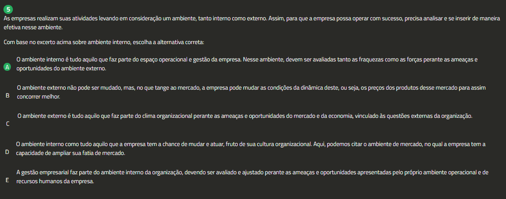 5 As empresas realizam suas atividades levando em consideração um ambiente, tanto interno como externo. para que a empresa possa operar com sucesso, precisa analisar e se inserir de maneira efetiva nesse ambiente. Com base no excerto acima sobre ambiente interno, escolha a alternativa correta: ambiente interno é tudo aquilo que faz parte do espaço operacional e gestão da empresa. Nesse ambiente, devem ser avaliadas tanto as fraquezas como as forças perante as ameaças e oportunidades do ambiente externo. ambiente externo não pode ser mudado, mas, no que tange ao mercado, a empresa pode mudar as condições da dinâmica deste, ou seja, os preços dos produtos desse mercado para assim concorrer melhor. ambiente externo é tudo aquilo que faz parte do clima organizacional perante as ameaças e oportunidades do mercado e da economia, vinculado às questões externas da organização. ambiente interno como tudo aquilo que a empresa tem a chance de mudar e atuar, fruto de sua cultura organizacional. Aqui, podemos citar ambiente de mercado, no qual a empresa tem a D capacidade de ampliar sua fatia de mercado. A gestão empresarial faz parte do ambiente interno da organização, devendo ser avaliado e ajustado perante as ameaças e oportunidades apresentadas pelo próprio ambiente operacional e de E recursos humanos da empresa