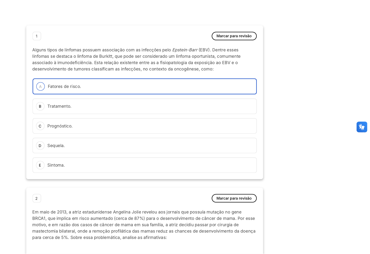 A B C D E 1 Marcar para revisão Alguns tipos de linfomas possuem associação com as infecções pelo Epstein-Barr (EBV). Dentre esses linfomas se destaca o linfoma de Burkitt, que pode ser considerado um linfoma oportunista, comumente associado à imunodeficiência. Esta relação existente entre as a fisiopatologia da exposição ao EBV e o desenvolvimento de tumores classificam as infecções, no contexto da oncogênese, como: Fatores de risco. Tratamento. Prognóstico. Sequela. Sintoma. 2 Marcar para revisão Em maio de 2013, a atriz estadunidense Angelina Jolie revelou aos jornais que possuía mutação no gene BRCA1, que implica em risco aumentado (cerca de 87%) para o desenvolvimento de câncer de mama. Por esse motivo, e em razão dos casos de câncer de mama em sua família, a atriz decidiu passar por cirurgia de mastectomia bilateral, onde a remoção profilática das mamas reduz as chances de desenvolvimento da doença para cerca de 5%. Sobre essa problemática, analise as afirmativas: A B C D E I - O câncer de mama feminino é o tipo de câncer que mais acomete mulheres no Brasil, diferente do observado nos achados epidemiológicos mundiais. II - O câncer de mama feminino é o tipo de câncer que mais acomete mulheres no Brasil e no mundo. III - A epidemiologia é a ciência da saúde que estuda, entre muitas outras atribuições, as taxas de incidência e prevalência das doenças nas populações. IV - A epidemiologia é fundamental para orientar os serviços de saúde na alocação de recursos para enfrentamento das mais diversas patologias. São corretas as afirmativas: I, II e III, apenas. I, II e IV, apenas. II e IV, apenas. II, III e IV, apenas. III e IV, apenas. 3 Marcar para revisão O câncer de mama feminino é uma neoplasia com ampla incidência e prevalência para esta população. Sua taxa de mortalidade tem o processo de metástase como principal causador de elevação. É sabido, que as células tumorais de mama têm tropismo por causar focos metastáticos nos ossos, fígado e no sistema nervoso central. O processo de metástase se dá pelo desprendimento de células tumorais dos tumores primários e sua consequente migração: A B C D E A B C Apenas pela circulação sanguínea. Pela circulação sanguínea e linfática. Apenas pela circulação linfática. Através do sistema imunológico. Através do sistema nervoso. 4 Marcar para revisão O receptor do fator de crescimento epidérmico (EGFR) é um domínio de membrana plasmática que quando estimulado por fatores de crescimento promove o estímulo de diferenciação e proliferação celular. Na literatura já são encontradas muitas evidências da atuação desses receptores no desenvolvimento de tumores, especialmente nas mutações dos genes que codificam esse domínio e levam aos receptores de EGFR mutados. O tipo de tratamento que leva em consideração a expressão de alvos específicos de células tumorais é chamado de: Radioterapia. Quimioterapia. Terapia Alvo. D E A B C D E Fitoterapia. Hemoterapia. 5 Marcar para revisão A quimioterapia é uma modalidade de tratamento do câncer que consiste em uso de drogas antineoplásicas, divididas em diferentes classes com diversos mecanismos de ação, que tem o potencial de destruir as células cancerígenas. Qual das seguintes opções descreve corretamente o mecanismo de ação dos fármacos alquilantes, uma classe de antineoplásicos utilizados no tratamento do câncer? Inibição da enzima topoisomerase II. Bloqueio dos canais de sódio nas células tumorais. Danos ao DNA, formando ligações cruzadas entre as cadeias de DNA. Inibição da tubulina. Estimulação do sistema imunológico para combater as células cancerígenas. 6 Marcar para revisão (Adaptada - UPENET IAUPE/ 2023) Leucemia Linfoblástica Aguda (LLA) é o câncer pediátrico mais comum; também afeta adultos de todas as idades. A transformação maligna e a proliferação não controlada de uma célula progenitora hematopoiética de longa vida anormalmente diferenciada resultam em alto número de A B C D E A B blastos circulantes, substituição da medula normal por células malignas e potencial para infiltração leucêmica no SNC e testículos. Os sintomas são fadiga, palidez, infecção, dor óssea, sintomas do SNC (p. ex., cefaleia) hematoma fácil e sangramento. Um medicamento importante utilizado no tratamento desse tipo de leucemia é o metotrexato, que tem como mecanismo de ação inibir: a metionina sintase. a absorção de vitamina B9. a diidrofolato redutase. a topoisomerase I. a topoisomerase II. 7 Marcar para revisão Os efeitos adversos são um aspecto importante a ser considerado no uso de medicamentos, pois podem surgir como consequência da ação dos medicamentos no organismo e variam em sua gravidade e impacto na saúde do paciente, sendo os efeitos adversos hematológicos aqueles que tem relação com a produção de células sanguíneas. Qual das seguintes opções descreve corretamente um possível efeito adverso hematológico dos taxanos utilizados no tratamento do câncer? Hepatotoxicidade. Miocardite. 00 hora : 26 min : 27 seg Ocultar Questão 7 de 10 Respondidas (10) Em branco (0) Finalizar prova 1 2 3 4 5 6 7 8 9 10 SM1 Oncologia Clínica e Nutrição Parenteral C D E A B C D E Neutropenia. Hiponatremia. Hiperpotassemia. 8 Marcar para revisão O bevacizumabe é um dos anticorpos monoclonais utilizados no arsenal de tratamento do câncer. Qual é o mecanismo de ação do bevacizumabe? Ativação da atividade intracelular da tirosina-quinase do VEGFR. Bloqueio da ligação do VEGF aos seus receptores nas células endoteliais. Ligação ao domínio extracelular do HER2, inibindo a transdução de sinais. Aumento da permeabilidade vascular e angiogênese. Retardo na progressão do câncer pela inibição da angiogênese. 9 Marcar para revisão O trametinibe é um inibidor da MEK, uma tirosina quinase que está constitutivamente ativada no câncer e A B C D E A