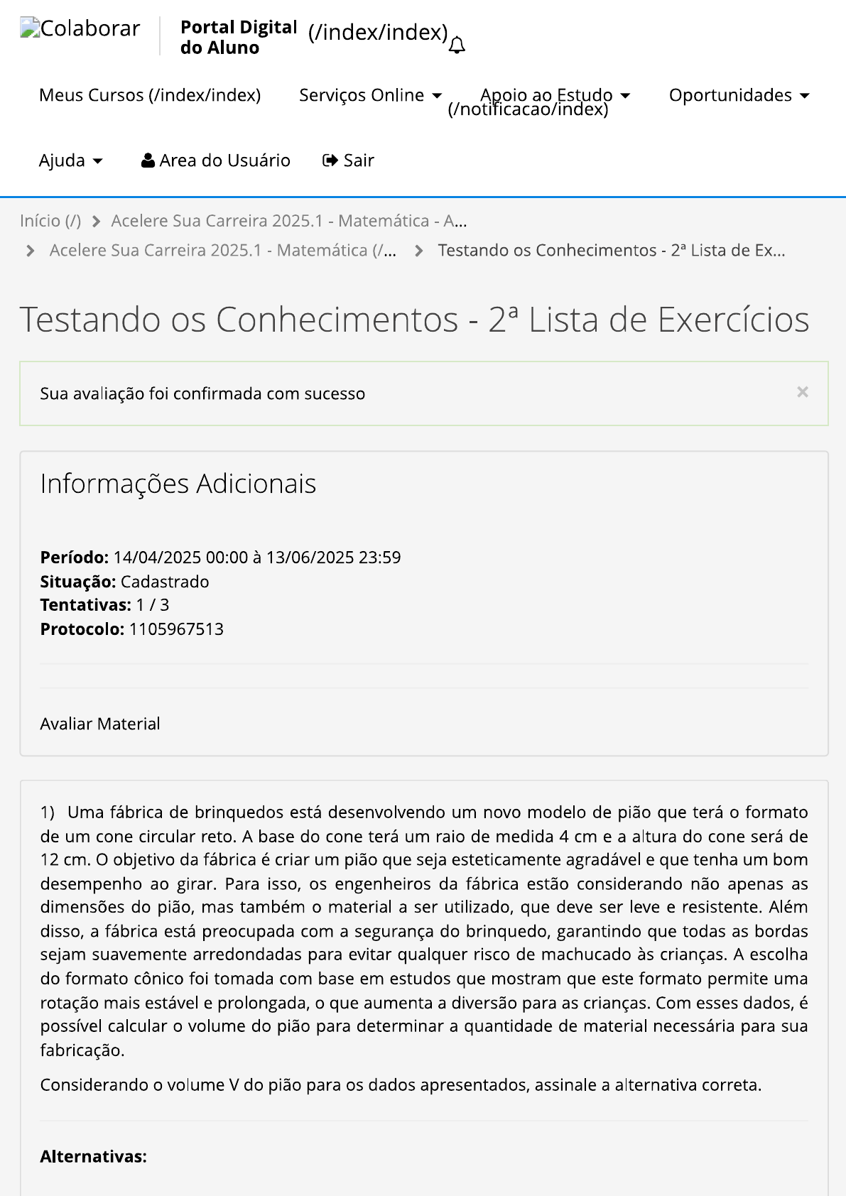 Colaborar Portal Digital (/index/index) do Aluno Meus Cursos (/index/index) Serviços Online Apoio ao Estudo Oportunidades (/notificacao/index) Ajuda Area do Usuário Sair Início (/) > Acelere Sua Carreira 2025.1 Matemática A... > Acelere Sua Carreira 2025.1 Matemática > Testando os Conhecimentos - Lista de Ex... Testando OS Conhecimentos - Lista de Exercícios Sua avaliação foi confirmada com sucesso Informações Adicionais Período: 14/04/2025 00:00 à 13/06/2025 23:59 Situação: Cadastrado Tentativas: 1 / 3 Protocolo: 1105967513 Avaliar Material 1) Uma fábrica de brinquedos está desenvolvendo um novo modelo de pião que terá formato de um cone circular reto. A base do cone terá um raio de medida 4 cm e a altura do cone será de 12 cm. O objetivo da fábrica é criar um pião que seja esteticamente agradável e que tenha um bom desempenho ao girar. Para isso, os engenheiros da fábrica estão considerando não apenas as dimensões do pião, mas também material a ser utilizado, que deve ser leve e resistente. Além disso, a fábrica está preocupada com a segurança do brinquedo, garantindo que todas as bordas sejam suavemente arredondadas para evitar qualquer risco de machucado às crianças. A escolha do formato cônico foi tomada com base em estudos que mostram que este formato permite uma rotação mais estável e prolongada, o que aumenta a diversão para as crianças. Com esses dados, é possível calcular o volume do pião para determinar a quantidade de material necessária para sua fabricação. Considerando volume V do pião para os dados apresentados, assinale a alternativa correta. Alternativas:a) V = 64? Alternativa assinalada b) V = 192? c) V = 128? d) e) 2) Uma escola está planejando a construção de uma nova área de recreação para os alunos, visando proporcionar um espaço seguro e divertido para as atividades ao ar livre. O projeto inclui uma área composta por três figuras geométricas, conforme ilustrado na figura 1: um triângulo retângulo, um semicírculo e um quadrado. O triângulo retângulo tem catetos de medidas 6 metros e 8 metros. O semicírculo está posicionado de forma que seu diâmetro coincide com um dos lados do quadrado. O quadrado, por sua vez, tem lado medindo 6 metros. A escolha dessas figuras geométricas foi baseada em um estudo que visa proporcionar um espaço diversificado e estimulante para as crianças. O triângulo retângulo será utilizado como uma área de jogos, semicírculo como uma área de descanso com bancos ao redor, e o quadrado como uma área central de atividades. O objetivo é calcular a área total dessa composição para determinar a quantidade de material necessário para cobrir chão da área de recreação. Figura 1: Composição do piso de um espaço de recreação de uma escola. 6 m 6 m 8 m Considerando o cálculo da área total A do novo espaço de recreação com os dados apresentados, assinale a alternativa correta. Alternativas: a)b) A = Alternativa assinalada c) A = d) e) 3) Vetores são entidades matemáticas fundamentais que apresentam magnitude e direção. Eles são amplamente utilizados em diversas áreas, como Física, Engenharia e Computação Gráfica. As operações com vetores são ferramentas essenciais para resolver problemas em várias disciplinas científicas e de engenharia. Compreender como realizar essas operações permite manipular e interpretar vetores de maneira eficaz, facilitando a análise e a solução de problemas complexos. Em Álgebra Linear, a operação de adição de vetores é uma das operações mais fundamentais.Considere dois vetores no espaço bidimensional, u e V, dados por u = e V = (V1, V2), respectivamente. Assim, segue que o vetor soma é dado por U2 + V2). Outra operação fundamental é a multiplicação de um vetor por um escalar que é realizada multiplicando-se cada componente do vetor pelo escalar. Desse modo, tem-se: (?u1, Com base no contexto apresentado, avalie as seguintes asserções e a relação proposta entre elas. I. A multiplicação de um vetor por um escalar em um espaço n-dimensional é distributiva em relação à adição de vetores. PORQUE II. Para quaisquer vetores u e V em um espaço n-dimensional e um escalar a multiplicação por escalar é dada por A respeito dessas asserções, assinale a alternativa correta. Alternativas: a) As asserções e são proposições verdadeiras, mas a não justifica a I. b) As asserções e são proposições verdadeiras e a justifica a I. Alternativa assinalada c) A asserção I é uma proposição verdadeira e a II, falsa. d) A asserção é uma proposição falsa e a II, verdadeira. e) As asserções e são proposições falsas.4) Diversas leis importantes da Engenharia são expressas por meio de retas ou semirretas que passam pela origem do sistema cartesiano que relaciona duas grandezas. Essa característica denota uma proporcionalidade entre as variáveis descritas por estas leis. Na Ciência de Materiais, a Lei de Hooke ilustra bem este comportamento, quando material é submetido a um carregamento que não excede limite de elasticidade do material, a deformação é proporcional à tensão gerada pela aplicação de uma força em um componente. De modo geral, quando uma grandeza y é diretamente proporcional à outra grandeza X, a relação entre essas grandezas é da forma y = mx, sendo m uma constante. Considere uma reta que passa pela origem do sistema cartesiano. A equação dessa reta pode ser expressa na forma y = mx, onde m é o coeficiente angular da reta. Essa forma simplificada da equação da reta é particularmente útil para entender a relação entre a inclinação da reta e o valor de m. Considerando as informações apresentadas sobre retas que passam pela origem do sistema de coordenadas, analise as afirmativas a seguir: I. Se o coeficiente angular for positivo e aumentar cada vez mais, a reta inclinará-se em direção ao eixo y, no sentido anti-horário. II. Se o coeficiente an