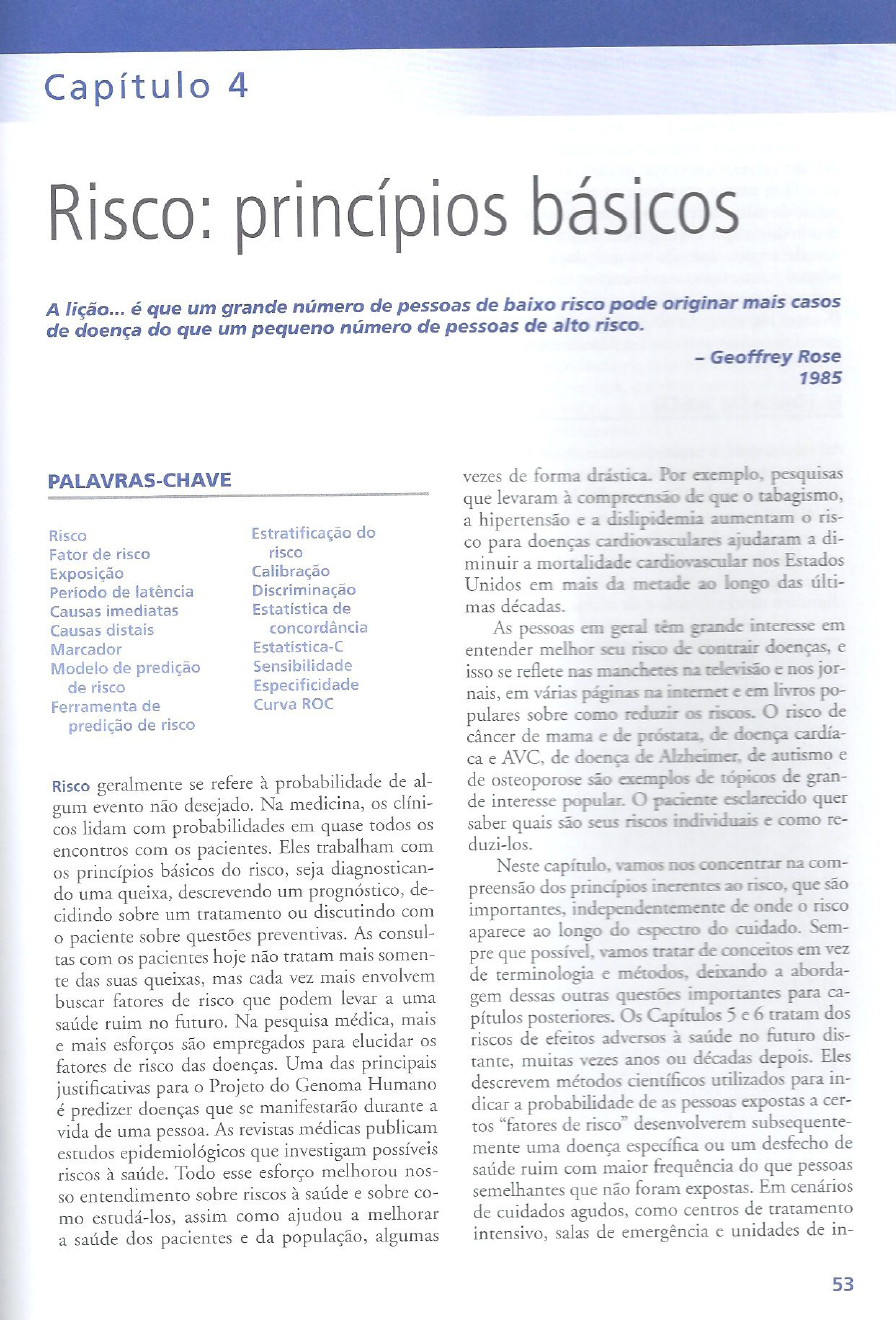 Capítulo 4 Risco: princípios básicos A lição... é que um grande número de pessoas de baixo risco pode originar mais casos de doença do que um pequeno número de pessoas de alto risco. Geoffrey Rose 1985 PALAVRAS-CHAVE vezes de forma drástica. Por exemplo, pesquisas que levaram à compreensão de que o tabagismo, a hipertensão e a dislipidemia aumentam o ris- Risco Estratificação do CO para doenças cardiovasculares ajudaram a di- Fator de risco risco minuir a mortalidade cardiovascular nos Estados Exposição Calibração Período de latência Discriminação Unidos em mais da metade ao longo das últi- Causas imediatas Estatística de mas décadas. Causas distais concordância As pessoas em geral têm grande interesse em Marcador Estatística-C entender melhor seu risco de contrair doenças, e Modelo de predição Sensibilidade isso se reflete nas manchetes na televisão e nos jor- de risco Especificidade nais, em várias páginas na internet e em livros po- Ferramenta de Curva ROC predição de risco pulares sobre como reduzir os riscos. o risco de câncer de mama e de próstata, de doença ca e AVC, de doença de Alzheimer, de autismo e Risco geralmente se refere à probabilidade de al- de osteoporose são exemplos de tópicos de gran- gum evento não desejado. Na medicina, os clíni- de interesse popular. paciente esclarecido quer cos lidam com probabilidades em quase todos os saber quais são seus riscos individuais e como re- encontros com os pacientes. Eles trabalham com duzi-los. os princípios básicos do risco, seja diagnostican- Neste capítulo, vamos nos concentrar na com- do uma queixa, descrevendo um prognóstico, de- preensão dos princípios inerentes ao risco, que são cidindo sobre um tratamento ou discutindo com importantes, independentemente de onde o risco o paciente sobre questões preventivas. As consul- aparece ao longo do espectro do cuidado. Sem- tas com os pacientes hoje não tratam mais somen- pre que possível, vamos tratar de conceitos em vez te das suas queixas, mas cada vez mais envolvem de terminologia e deixando a aborda- buscar fatores de risco que podem levar a uma gem dessas outras questões importantes para ca- saúde ruim no futuro. Na pesquisa médica, mais pítulos posteriores. Os Capítulos 5 e 6 tratam dos e mais esforços são empregados para elucidar os riscos de efeitos adversos à saúde no futuro dis- fatores de risco das doenças. Uma das principais tante, muitas vezes anos ou décadas depois. Eles justificativas para o Projeto do Genoma Humano descrevem métodos científicos utilizados para in- é predizer doenças que se manifestarão durante a dicar a probabilidade de as pessoas expostas a cer- vida de uma pessoa. As revistas médicas publicam tos "fatores de risco" desenvolverem subsequente- estudos epidemiológicos que investigam possíveis mente uma doença específica ou um desfecho de riscos à saúde. Todo esse esforço melhorou nos- saúde ruim com maior frequência do que pessoas SO entendimento sobre riscos à saúde e sobre co- semelhantes que não foram expostas. Em cenários mo estudá-los, assim como ajudou a melhorar de cuidados agudos, como centros de tratamento a saúde dos pacientes e da população, algumas intensivo, salas de emergência e unidades de in- 5354 Epidemiologia clínica: elementos essenciais ternação hospitalar, a preocupação é com os riscos maior dose, dose cumulativa total, anos de expo- que os pacientes com doenças conhecidas podem sição, anos desde a primeira exposição, e assim ou não correr, denominados prognósticos (Capi- por diante. Embora as diversas medidas de dose tulo 7); o tempo envolvido no prognóstico pode tendam a estar relacionadas umas com as outras, variar de minutos e horas a meses e anos, depen- algumas podem demonstrar uma relação expo- dendo do estudo. Os Capítulos 8, 9 e 10 voltam a sição-doença, enquanto outras, não. Por exem- abordar o risco, focando em sua relação com diag- plo, as doses cumulativas de exposição ao sol nóstico, tratamento e prevenção. Em cada caso, constituem um fator de risco de câncer de pe- a abordagem para avaliar o risco é um tanto di- le não melanoma, enquanto episódios de quei- ferente. No entanto, os princípios fundamentais madura solar grave são um melhor preditor para para determinar os riscos à saúde são semelhantes. o melanoma. Se a medida correta não for esco- lhida, uma associação entre um fator de risco e uma doença pode não ficar evidente. A escolha FATORES DE RISCO de uma medida apropriada de exposição a um fa- tor de risco geralmente se baseia em tudo que se As características associadas com maior risco de sabe sobre os efeitos clínicos e biológicos da ex- ficar doente são chamadas de fatores de risco. Al- posição, na fisiopatologia da doença e em quais- gumas são herdadas. Por exemplo, ter o haplótipo quer estudos epidemiológicos. HLA-B27 aumenta muito o risco de se adquirir espondilartropatias. Projeto do Genoma Hu- mano já identificou muitas outras doenças para RECONHECENDO RISCO as quais genes específicos são fatores de risco, in- cluindo câncer de colo e de mama, a osteoporo- Qualquer pessoa pode reconhecer com facilidade se e a esclerose lateral amiotrófica. Outros fatores os grandes riscos associados com efeitos que ocor- de risco, como agentes infecciosos, drogas e toxi- rem logo após a exposição. Dessa forma, não é di- nas, são encontrados no ambiente físico. Mas há fícil ver a relação entre a exposição e condições outros, ainda, que fazem parte do ambiente so- médicas como queimadura solar e overdose de as- cial. Por exemplo, já foi demonstrado que sen- pirina ou o prognóstico ruim de hipotensão no timento de perda após a morte de um cônjuge, as início de infarto do miocárdio, uma vez que essas mudanças na rotina diária e as aglomerações au- condições ocorrem logo após a exposição e têm mentam as taxas de doença não apenas doenças