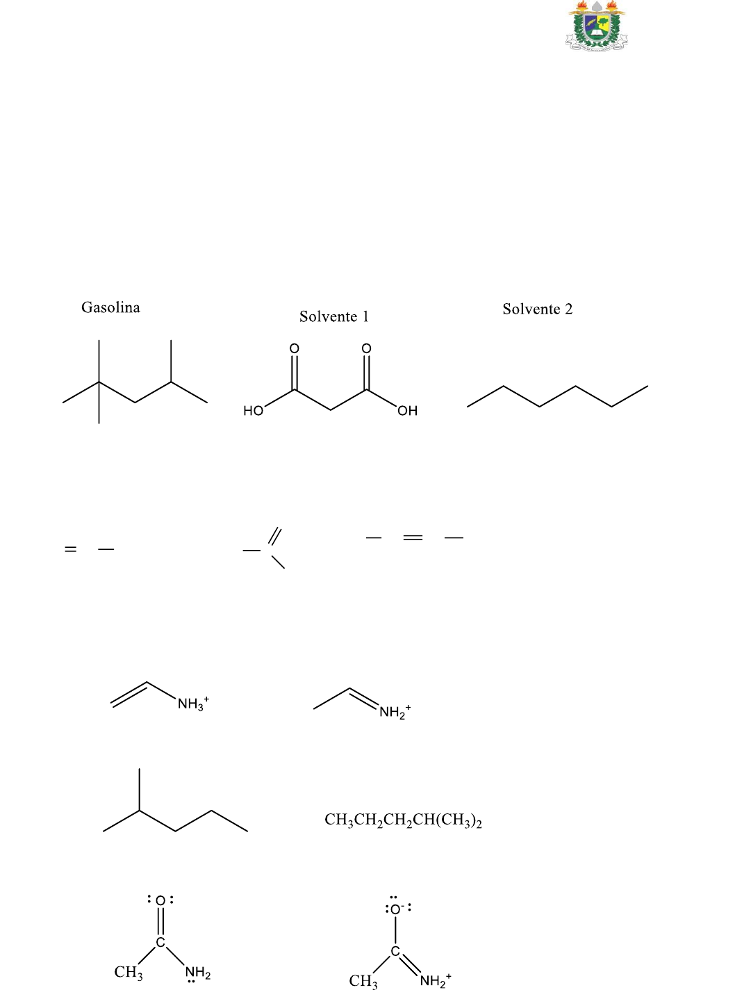 UNIVERSIDADE DO ESTADO DO AMAPÁ – UEAP Professor: Darlan Coutinho dos Santos Aluno: Disciplina: Química Orgânica Curso: Ciências Naturais I Avaliação 1) A ANP, Agencia Nacional do Petróleo, é o órgão regulador das atividades que integram as indústrias de petróleo e gás natural e de biocombustíveis no Brasil. Uma das suas atribuiçóes é fiscalizar a adulteração de combustíveis. Ao analisar uma amostra de gasolina de um posto do município de Macapá, o engenheiro químico percebeu que a gasolina estava adulterada utilizando um densímetro. Alem disso, constatou que os líquidos eram totalmente miscíveis. De acordo com seu conhecimento em solubilidade qual solvente foi utilizado para adulteração da gasolina? Mostre as interações intermoleculares. (2,0) 2) Escreva uma estrutura contribuinte mais estável para cada uma das seguintes estruturas. Use setas curvas para mostrar como transformar a fórmula de Lewis original na nova fórmula. Especifique cargas formais, se houver. (2,0) +CH2CH CH -CH2.. H2C- C H O .. : .. H2C+ CH CH O- .. .. : 3) Qual a relação entre os membros dos seguintes pares? Isto é, eles são isômeros constitucionais, são os mesmos ou qualquer coisa diferente (especifique) ? 4) O íon nitrito (NO2 -) tem a conectividade ONO. Escreva para o íon nitrito duas estruturas de Lewis que obedeçam à regra do octeto. As duas contribuem igualmente para o híbrido de ressonância? (2,0). 5) Em qual dos compostos – CH4, NH3, H2O, SiH4, ou H2S- o δ+ do hidrogênio é maior? Em qual deles o hidrogênio tem carga parcial negativa? Justifique (2,0)