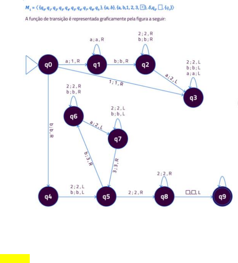 Aula 10 – Máquina de Turing 1. Uma das funções de uma máquina de Turing consiste em reconhecer linguagens. Isso quer dizer que ela é capaz de classificar palavras como pertencentes ou não a determinada linguagem. Considere a máquina de Turing definida a seguir: Qual das seguintes cadeias é rejeitada pela máquina acima? A. aabbbaaaaa B. abaa C. aaaabaaaaa D. aabbaa E. abbbbaaaaa 2. A função de transição de uma máquina de Turing é uma função parcial que mapeia um estado e um símbolo lido na posição atual da cabeça da fita em uma tripla que consiste no próximo estado, no símbolo que será escrito na fita e na direção em que a cabeça da fita se moverá. Considere a máquina de Turing dada a seguir: A. Próximo estado: indefinido. A entrada será rejeitada. B. Próximo estado: q4. Será escrito ’2’ na fita C. Próximo estado: q1. Será escrito ’1’ na fita. D. Próximo estado: q4. Será escrito ’b’ na fita. E. Próximo estado q7. Será escrito ’2’ na fita. 3. O estudo do que pode (ou não) ser computado é o cerne da ciência da computação. Apesar de ser bastante antigo, ele se desenvolveu principalmente na primeira metade do século XX e foi revolucionado quando Alan Turing propôs um formalismo genérico de computação capaz de representar qualquer problema computável. Avalie as seguintes afirmações sobre a máquina de Turing e assinale a alternativa correta. A. Uma máquina de Turing é capaz de reconhecer qualquer linguagem que se enquadre na taxonomia de Chomsk B. Em uma máquina de Turing, sempre é possível saber se um programa termina sua execução, aceitando ou rejeitando a entrada. C. Um processador Intel Core i9 reconhece linguagens que não são possíveis de se reconhecer por meio de uma máquina de Turing. D. Toda linguagem que pode ser reconhecida por uma máquina de Turing também pode ser reconhecida por um autômato de uma pilha. E. Uma máquina de Turing com três fitas, não determinística e com fita multidimensional consegue processar linguagens que uma máquina de Turing tradicional não conseguiria. 4. Diversas modificações para as máquinas de Turing determinística foram propostas ao longo dos anos com o objetivo de aumentar seu poder computacional. Até hoje, todos os modelos conseguiram no máximo igualar o poder de processamento da máquina determinística, sem superá-lo. Dado o gráfico de transições de uma máquina de Turing a seguir, qual é uma sequência possível de estados percorridos para que essa máquina aceite a palavra de entrada ‘aabccb’? A. q0 — q0 — q0 — q0 — q3 — q4. B. q1 — q1 — q1 — q1 — q1 — q4. C. q0 — q0 — q2 — q2 — q2 — q4. D. q0 — q2 — q2 — q2 — q2 — q4. E. q0 — q0 — q0 — q3 — q3 — q4. 5. Uma máquina de Turing é composta de uma fita de tamanho infinito com sua cabeça de leitura e escrita que servem de memória e como dispositivo de entrada e saída. Também existe uma função de transição, que corresponde ao programa executado pela máquina. Sobre a máquina de Turing, analise as seguintes afirmações: I. Uma máquina de Turing com múltiplas fitas pode reconhecer qualquer linguagem recursivamente enumerável. II. Para refutar a hipótese de Church, basta apresentar uma modificação da máquina de Turing que comprovadamente tenha mais poder computacional que uma máquina de Turing determinística. III. Por padrão, uma máquina de Turing determinística pode alterar diversos pontos da fita em cada transição e é capaz de transferir sua atenção para mais de uma posição da fita em cada argumento da função de transição. Qual(is) dessas afirmações está(ão) correta(s)? A. Apenas I. B. Apenas II. C. I e II. D. I e III. E. I, II e III.