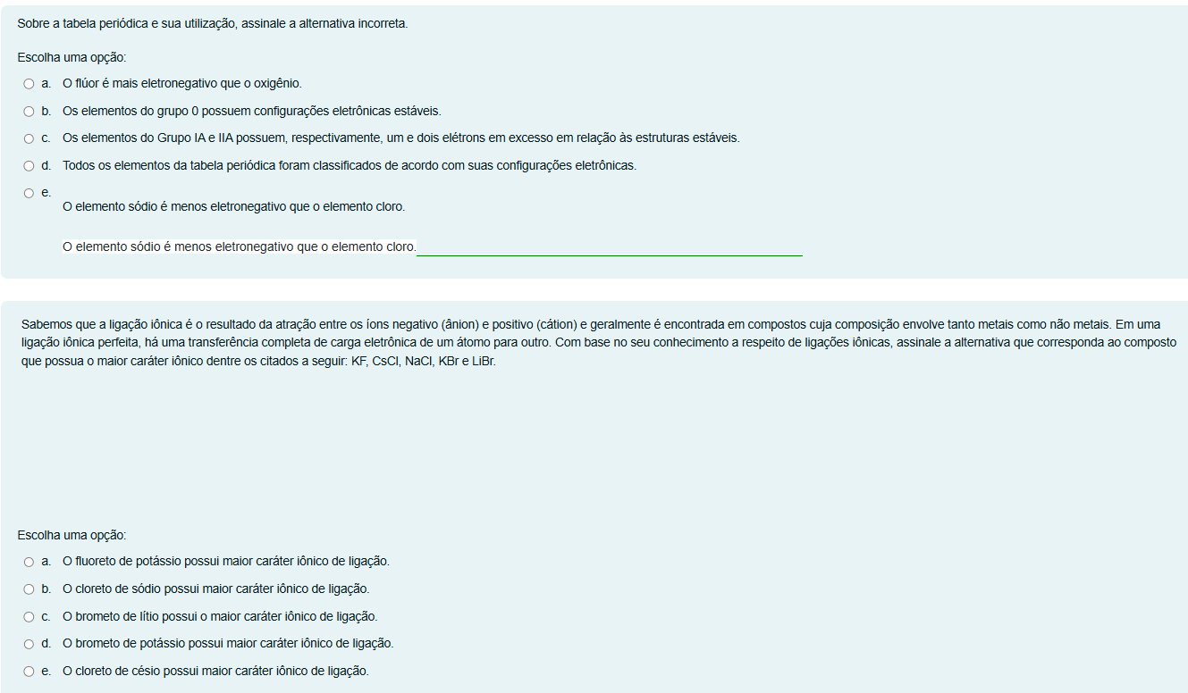 Sobre a tabela periódica e sua utilização, assinale a alternativa incorreta. Escolha uma opção: a. é mais eletronegativo que oxigênio. b. Os elementos do grupo 0 possuem configurações eletrônicas Os elementos do Grupo IA e IIA possuem, respectivamente, um e dois elétrons em excesso em relação às estruturas d. Todos os elementos da tabela foram classificados de acordo com suas configurações e. elemento sódio é menos eletronegativo que o elemento cloro. elemento sódio é menos eletronegativo que elemento cloro. Sabemos que a ligação é resultado da atração entre os negativo (ânion) e positivo e geralmente é encontrada em compostos cuja composição envolve tanto metais como não Em uma ligação perfeita, há uma transferência completa de carga eletrônica de um átomo para outro. Com base no seu conhecimento a respeito de ligações assinale a alternativa que corresponda ao composto que possua o maior caráter dentre os citados a seguir: KF, CsCl, KBr e LiBr. Escolha uma opção: a o fluoreto de possui maior caráter de ligação. b. cloreto de sódio possui maior caráter de ligação. brometo de lítio possui o maior caráter ionico de ligação. d. brometo de potássio possui maior caráter de ligação. e. cloreto de césio possui maior caráter ionico de ligação.