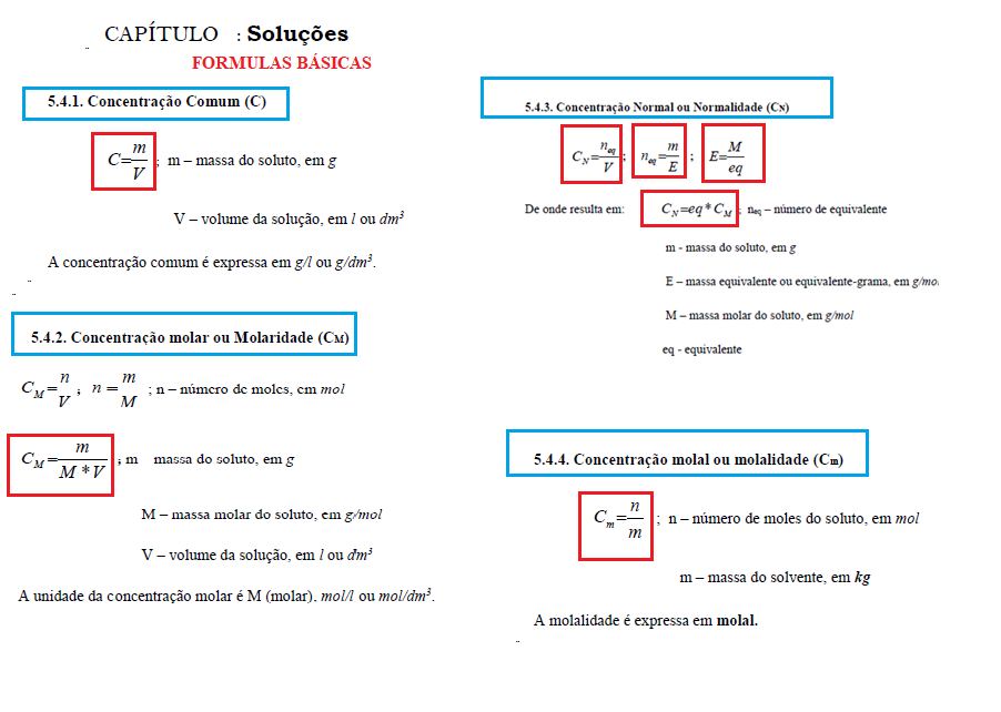 CAPÍTULO : Soluções FORMULAS BÁSICAS 5.4.1. Concentração Comum (C) 5.4.3. Concentração Normal ou Normalidade (Cs) m - massa do soluto. em g De onde resulta V - volume da solução, em ou dm3 Cy=eq*Cy - número de equivalente m - massa do em g A concentração comum é expressa em g/l ou g/dm3 E - massa equivalente ou em M - massa molar do em g/mol 5.4.2. Concentração molar ou Molaridade (CM) eq equivalente : n - cm mol m massa do soluto, em 5.4.4. Concentração molal ou molalidade (Cm) M - massa molar do soluto, g/mol ; n - número de moles do soluto, em mol V - volume da solução, em ou dm3 m - massa do solvente, em kg A unidade da concentração molar é M (molar). ou A molalidade é expressa em molal.