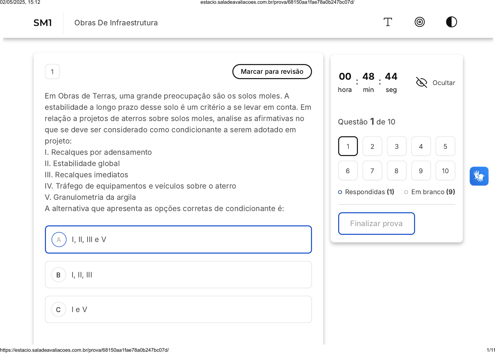A B C 1 Marcar para revisão Em Obras de Terras, uma grande preocupação são os solos moles. A estabilidade a longo prazo desse solo é um critério a se levar em conta. Em relação a projetos de aterros sobre solos moles, analise as afirmativas no que se deve ser considerado como condicionante a serem adotado em projeto: I. Recalques por adensamento II. Estabilidade global III. Recalques imediatos IV. Tráfego de equipamentos e veículos sobre o aterro V. Granulometria da argila A alternativa que apresenta as opções corretas de condicionante é: I, II, III e V I, II, III I e V 00 hora : 48 min : 44 seg Ocultar Questão 1 de 10 Respondidas (1) Em branco (9) Finalizar prova 1 2 3 4 5 6 7 8 9 10 SM1 Obras De Infraestrutura 02/05/2025, 15:12 estacio.saladeavaliacoes.com.br/prova/68150aa1fae78a0b247bc07d/ https://estacio.saladeavaliacoes.com.br/prova/68150aa1fae78a0b247bc07d/ 1/11 D E A B C I, II, III, IV e V I, II, III e IV 2 Marcar para revisão Em Obras de Terras, é importante promover uma densificação dos solos antes de se iniciar o empreendimento projetado. O processo de densificação dos solos que expulsa o ar dos poros do solo, obtendo um material mais homogêneo e com maior resistência ao cisalhamento é chamado de: Adensamento Compactação Liquefação 02/05/2025, 15:12 estacio.saladeavaliacoes.com.br/prova/68150aa1fae78a0b247bc07d/ https://estacio.saladeavaliacoes.com.br/prova/68150aa1fae78a0b247bc07d/ 2/11 D E A B C Cisalhamento Deslizamento 3 Marcar para revisão Em obras de terras, como encostas de rodovias ou ferrovias, maciço de barragens e escavações, uma grande preocupação são os deslizamentos. Dentre os tipos de classificação por geometria para a superfície de ruptura de um deslizamento de terra, pode-se citar o(a): Subsidência Rastejo Escoamento 02/05/2025, 15:12 estacio.saladeavaliacoes.com.br/prova/68150aa1fae78a0b247bc07d/ https://estacio.saladeavaliacoes.com.br/prova/68150aa1fae78a0b247bc07d/ 3/11 D E A B C Ruptura em cunha Corrida 4 Marcar para revisão Em projetos de aterros sobre solos moles, é essencial o cálculo das resistências e deformações. Para verificar o desenvolvimento do adensamento em um aterro construído sobre solo mole por meio do monitoramento das poro-pressões, a instrumentação a ser adotada deve ser: Medidor de nível d'água Piezômetro Perfilômetro 02/05/2025, 15:12 estacio.saladeavaliacoes.com.br/prova/68150aa1fae78a0b247bc07d/ https://estacio.saladeavaliacoes.com.br/prova/68150aa1fae78a0b247bc07d/ 4/11 D E A B C Extensômetro Placa de recalque 5 Marcar para revisão Na compactação de uma brita graduada (uma mistura de britas), e , dessa forma, se a fiscalização da obra estabelece um GC mínimo de 100% para aceite do serviço de base de brita graduada, então o GC obtido na operação e uma decisão correspondente possível do fiscal de contrato são, respectivamente: γcampo = 2, 15kg/cm3 γlaboratório = 2, 19 kg cm3 98%; o serviço foi aceito pela fiscalização. 102%; a camada teve que ser revolvida e aerada para uma nova fiscalização. 98 %; o serviço não foi aceito pela fiscalização. 02/05/2025, 15:12 estacio.saladeavaliacoes.com.br/prova/68150aa1fae78a0b247bc07d/ https://estacio.saladeavaliacoes.com.br/prova/68150aa1fae78a0b247bc07d/ 5/11 D E A B C 102%; o serviço foi aceito pela fiscalização. 100 %; o serviço não foi aceito pela fiscalização. 6 Marcar para revisão Após 7 dias da execução de uma sub-base estabilizada com cimento (solo-cimento), um corpo de prova é compactado em um equipamento de resistência à compressão simples. Se uma carga de ruptura de 1000kg é aplicada sobre um corpo de prova com diâmetro de 100mm, então a decisão do fiscal com relação a essa sub-base é que: A camada deve ser aceita, não obedece à faixa de resistência necessária entre 3,5 e 5,0MPa A camada não deve ser aceita, porque não obedece à faixa de resistência necessária entre 5,0 e 7,0 MPa A camada não deve ser aceita, porque não obedece à faixa de resistência necessária entre 3,5 e 5,0MPa 02/05/2025, 15:12 estacio.saladeavaliacoes.com.br/prova/68150aa1fae78a0b247bc07d/ https://estacio.saladeavaliacoes.com.br/prova/68150aa1fae78a0b247bc07d/ 6/11 D E A B C A camada deve ser aceita, porque obedece à faixa de resistência necessária entre 1,4 e 2,1MPa A camada não deve ser aceita, porque não obedece à faixa de resistência necessária entre 1,4 e 2,1MPa 7 Marcar para revisão Para utilizar um solo como base, ele deve ter o CBR mínimo de: 2% (energia normal) 6% (energia normal) 20% (energia intermediária) 02/05/2025, 15:12 estacio.saladeavaliacoes.com.br/prova/68150aa1fae78a0b247bc07d/ https://estacio.saladeavaliacoes.com.br/prova/68150aa1fae78a0b247bc07d/ 7/11 D E A B 60% (energia normal) 80% (energia intermediária) 8 Marcar para revisão Observe a Figura abaixo. Podemos afirmar que ela representa: A sarjeta de microdrenagem despejando a água pluvial em um canal artificial A boca de lobo de microdrenagem despejando a água pluvial em uma bacia de amortecimento 02/05/2025, 15:12 estacio.saladeavaliacoes.com.br/prova/68150aa1fae78a0b247bc07d/ https://estacio.saladeavaliacoes.com.br/prova/68150aa1fae78a0b247bc07d/ 8/11 C D E A B Uma galeria de microdrenagem despejando a água pluvial em um canal natural Uma galeria de microdrenagem despejando a água pluvial em um canal artificial A sarjeta de microdrenagem despejando a água pluvial em um canal natural. 9 Marcar para revisão A macrodrenagem é o sistema de drenagem urbana formado por elementos com capacidade de receber a precipitação em volume superior ao captado e transportado pelos sistemas de microdrenagem. Marque a opção abaixo que contenha apenas elementos de macrodrenagem: Boca coletora, galeria e poço de visita Sarjeta, meio fio e boca coletora 02/05/2025, 15:12 estacio.saladeavaliacoes.com.br/prova/68150aa1fae78a0b247bc07d/ https://estacio.saladeavaliacoes.com.br/prova/68150aa1fae78a0b247bc07d/ 9/11 C D E Canal natural