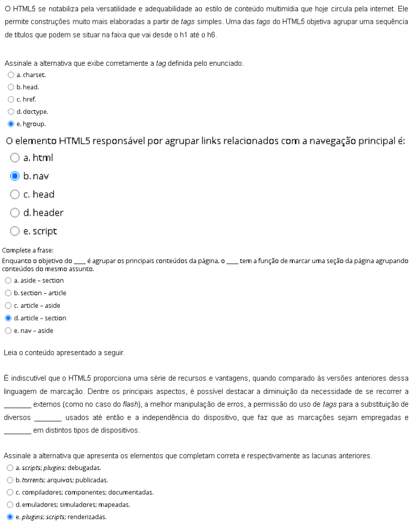 HTML5 se notabiliza pela versatilidade e adequabilidade ao estilo de conteúdo multimídia que hoje circula pela internet. Ele permite construções muito mais elaboradas a partir de tags simples. Uma das tags do HTML5 objetiva agrupar uma sequência de títulos que podem se situar na faixa que vai desde h1 até Assinale a alternativa que exibe corretamente a tag definida pelo enunciado. a. charset. b. head. href. d. doctype. hgroup. O elemento HTML5 responsável por agrupar links relacionados com a navegação principal é: a. html b. nav head d. header e. script Complete a frase: Enquanto o objetivo do é agrupar os principais conteúdos da página, o tem a função de marcar uma seção da página agrupando conteúdos do mesmo a. aside section b. section article article aside d. article section e. nav aside Leia conteúdo apresentado a seguir. É indiscutível que HTML5 proporciona uma série de recursos e vantagens, quando comparado às versões anteriores dessa linguagem de marcação. Dentre os principais aspectos, é possível destacar a diminuição da necessidade de se recorrer a externos (como no caso do flash), a melhor manipulação de erros, a permissão do uso de tags para a substituição de diversos usados até então e a independência do dispositivo, que faz que as marcações sejam empregadas e em distintos tipos de dispositivos. Assinale a alternativa que apresenta os elementos que completam correta e respectivamente as lacunas anteriores. a. scripts; plugins; debugadas. b. torrents; arquivos; publicadas. compiladores; componentes; documentadas. d. emuladores; simuladores; mapeadas. e. plugins; scripts; renderizadas.Definitivamente, a evolução histórica do desenvolvimento de uma linguagem computacional não é a mais linear e previsível dos processos. Pelo contrário, costuma ser envolta por muita discussão e pontos de vista que são, ora convergentes, ora divergentes, no que diz respeito à percepção da comunidade global dos Isso não foi diferente com HTML, que, desde a criação, nos anos de 1990, passou por diversas evoluções muito discutidas por muitos grupos profissionais. Com base no exposto, analise as afirmativas a seguir e assinale (V) para a(s) Verdadeira(s) e (F) para a(s) Falsa(s). I. As empresas que criaram WHATWG para HTML foram a Apple, a Mozilla e a Opera. II. As publicações da especificação HTML5 da W3C e da WHATWG são idênticas em relação ao III. A publicação da tecnologia XForms foi decisiva para a evolução da linguagem As afirmativas I, e III são, respectivamente: Em 2006, juntas, a W3C e a WHATWG desenvolveram a linguagem HTML versão 5 para garantir atendimento tanto às normas e aos padrões da W3C quanto aos maiores anseios da comunidade dos profissionais Dessa forma, a quinta revisão da linguagem HTML se consagraria como novo padrão para web, unindo melhor do HTML4, do XHTML e do HTML DOM. Não obstante, houve a adição de um conjunto de novos e modernos Relacione os termos a seguir às respectivas 1. HTML4 2. XHTML 3. WHATWG I. Organização criada deliberadamente para trabalhar de forma focada em formulários web e II. Criação não bem-sucedida da W3C, que congrega regras rigorosas da linguagem XML junto ao HTML. III. Apresenta notória limitação para atendimento das necessidades de desenvolvimento para web 2.0. Assinale a alternativa que correlaciona adequadamente os dois grupos de informação. a. 2-III; b. 3-III. c. 1-II; 2-III; d. 1-III; 2-II; 3-1. e. 2-II; 3-III.Por definição, "eventos" são as ações que são realizadas no interior de uma página HTML. Isso demonstra a razão pela qual eles se vinculam às tags HTML. Portanto, a depender da ação, evento pode ser chamado, ou não. Dentre as mais corriqueiras possibilidades de eventos, existem aqueles realizados com mouse e aqueles realizados com teclado, embora figurem outros eventualmente menos frequentes, com vínculo a objetos e a Sobre a temática, avalie as asserções a seguir e a relação proposta entre elas. I. onMouseOver é uma propriedade relacionada a um evento de mouse que ocorre quando usuário clica sobre um elemento. PORQUE II. Em contrapartida onMouseUp ocorre quando usuário clica duas vezes sobre um mesmo elemento. A respeito das asserções, assinale a alternativa correta. a. As asserções e II são proposições verdadeiras, mas a II não é uma justificativa correta da I. b.As asserções e II são proposições falsas. A asserção é uma proposição falsa, e a II é uma proposição verdadeira. asserção é uma proposição verdadeira, e a II é uma proposição falsa. e. As asserções e II são proposições verdadeiras, e a II é uma justificativa correta da Uma das preocupações centrais de um(a) programador(a) que recorre à linguagem JavaScript diz respeito à forma de se exibir as informações aos Diante disso, é possível apontar duas alternativas igualmente válidas: utilizar ou as janelas de diálogo. Cada uma delas tem peculiaridades próprias e que podem fazê-las preferenciais de acordo com determinadas condições de Sobre a temática, avalie as asserções a seguir e a relação proposta entre elas. I. As janelas de diálogo permitem que uma informação seja escrita no interior da página HTML. PORQUE II. Em contrapartida oferece os tipos alert, confirm e prompt para comunicar dados. A respeito das asserções, assinale a alternativa correta. a. As asserções e II são proposições verdadeiras, e a II é uma justificativa correta da b.As asserções I e II são proposições verdadeiras, mas a II não é uma justificativa correta da c. A asserção é uma proposição falsa, e a II é uma proposição verdadeira. asserção é uma proposição verdadeira, e II é uma proposição falsa. As asserções e II são proposições falsas.