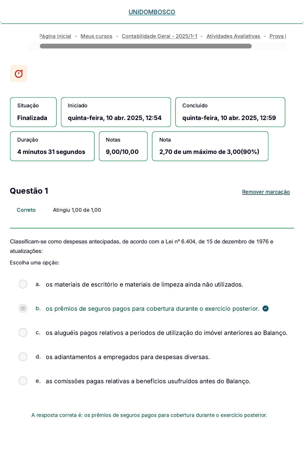 - - - - Situação Finalizada Iniciado quinta-feira, 10 abr. 2025, 12:54 Concluído quinta-feira, 10 abr. 2025, 12:59 Duração 4 minutos 31 segundos Notas 9,00/10,00 Nota 2,70 de um máximo de 3,00(90%) Questão 1 Correto Atingiu 1,00 de 1,00 Remover marcação Classificam-se como despesas antecipadas, de acordo com a Lei nº 6.404, de 15 de dezembro de 1976 e atualizações: Escolha uma opção: a. os materiais de escritório e materiais de limpeza ainda não utilizados. b. os prêmios de seguros pagos para cobertura durante o exercício posterior. c. os aluguéis pagos relativos a períodos de utilização do imóvel anteriores ao Balanço. d. os adiantamentos a empregados para despesas diversas. e. as comissões pagas relativas a benefícios usufruídos antes do Balanço. A resposta correta é: os prêmios de seguros pagos para cobertura durante o exercício posterior. Página inicial Meus cursos Contabilidade Geral - 2025/1-1 Atividades Avaliativas Prova E UNIDOMBOSCO https://ava.unidombosco.edu.br/ https://ava.unidombosco.edu.br/my/courses.php https://ava.unidombosco.edu.br/course/view.php?id=2704 https://ava.unidombosco.edu.br/course/section.php?id=8370 https://ava.unidombosco.edu.br/mod/quiz/view.php?id=24046 https://ava.unidombosco.edu.br/ Questão 2 Correto Atingiu 1,00 de 1,00 Marcar questão A empresa Genipabu S. A. controla o próprio estoque pelo critério da Média Ponderada Móvel. No mês de dezembro de 2016, a empresa realizou as seguintes operações: A empresa possuía, no final de novembro de 2016, 300 unidades em seu estoque final, ao custo médio unitário de R$ 10,00. O valor do estoque final de 2016 era, em reais: Escolha uma opção: a. 8100,00 b. 7050,00 c. 3000,00 d. 6000,00 e. 6955,00 A resposta correta é: 7050,00 UNIDOMBOSCO https://ava.unidombosco.edu.br/ Questão 3 Incorreto Atingiu 0,00 de 1,00 Marcar questão Analise o quadro abaixo: Assinale a alternativa que contenha as expressões que devem substituir o 'x' do quadro acima, respectivamente: Escolha uma opção: a. Exaustão, Amortização e Depreciação; b. Amortização, Depreciação e Exaustão; c. Amortização, Exaustão e Depreciação; d. Depreciação, Amortização e Exaustão; e. Exaustão, Depreciação e Amortização. A resposta correta é: Exaustão, Depreciação e Amortização. UNIDOMBOSCO https://ava.unidombosco.edu.br/ Questão 4 Correto Atingiu 1,00 de 1,00 Marcar questão Sobre as Reservas de Lucros a Realizar, assinale a alternativa correta: Escolha uma opção: a. Nela são baixadas as Ações em Tesouraria (compradas pela própria empresa). b. Nela são lançados os lucros não capitalizados em caixa; c. Nela são lançados os lucros não realizados financeiramente; d. Nela são lançados os resultados abrangentes; e. Foi proibida pela Lei 11.638/07; A resposta correta é: Nela são lançados os lucros não realizados financeiramente; UNIDOMBOSCO https://ava.unidombosco.edu.br/ Questão 5 Correto Atingiu 1,00 de 1,00 Marcar questão Considere os seguintes dados contábeis da Cia. DZB: Duplicatas a Receber em 31/12/2012 .............................................................. R$ 200.000,00 Provisão para Crédito de Liquidação Duvidosa (PCLD) em 31/12/2012.................. R$ 4.000,00 Em janeiro de 2013, um cliente considerado incobrável em outubro de 2012 pagou uma duplicata no valor de R$ 3.000,00 O lançamento contábil referente ao pagamento do cliente gerou um: Escolha uma opção: a. crédito em Outras Receitas Operacionais. b. crédito em Receita de Vendas. c. crédito em PCLD d. débito em PCLD. e. crédito em Duplicatas a Receber. A resposta correta é: crédito em Outras Receitas Operacionais. UNIDOMBOSCO https://ava.unidombosco.edu.br/ Questão 6 Correto Atingiu 1,00 de 1,00 Marcar questão Uma transportadora fez contrato de seguro para um de seus caminhões, cuja vigência é de 12 meses, com início em 1º.12.2015. O caminhão está avaliado em R$360.000,00. O prêmio total, pago à vista e em parcela única, foi de R$18.000,00. O valor da franquia será de R$15.000,00 Considerando-se o Regime de Competência e com base nos dados informados, o montante a ser apropriado como Despesa de Seguros, em dezembro de 2015, é de: Escolha uma opção: a. R$1.250,00. b. R$15.000,00. c. R$19.500,00 d. R$1.500,00. e. R$18.000,00. A resposta correta é: R$1.500,00. UNIDOMBOSCO https://ava.unidombosco.edu.br/ Questão 7 Correto Atingiu 1,00 de 1,00 Marcar questão Ao proceder à análise e conciliação bancária, verificou-se que o saldo contábil apurado no razão divergia do saldo extracontábil apresentado no extrato bancário. A contabilidade apurou os seguintes fatos: Com base apenas nessas informações, é correto afirmar que a diferença entre o saldo extracontábil e o saldo contábil era: Escolha uma opção: a. 1080,00 b. 220,00 c. 840,00 d. 460,00 e. 770,00 A resposta correta é: 460,00 UNIDOMBOSCO https://ava.unidombosco.edu.br/ Questão 8 Correto Atingiu 1,00 de 1,00 Marcar questão Uma empresa contraiu um empréstimo de 1.000 reais para ser pago em 24 meses. O lançamento contábil a ser realizado é: Escolha uma opção: a. D - Bancos; C - Operações Financeiras (passivo circulante) b. D - Caixa; C - Empréstimos (passivo circulante) c. D - Empréstimos (ativo circulante); C - Caixa e Bancos d. D - Bancos; C - Empréstimos (passivo não circulante) e. D - Operações Financeiras; C - Bancos A resposta correta é: D - Bancos; C - Empréstimos (passivo não circulante) UNIDOMBOSCO https://ava.unidombosco.edu.br/ Questão 9 Correto Atingiu 1,00 de 1,00 Marcar questão Com relação à contabilidade geral, é correto afirmar que: Escolha uma opção: a. Reserva de Capital é uma conta do Patrimônio Líquido. b. Capital Social é uma conta de investimento. c. Despesa Antecipada é uma conta de Resultado. d. Reserva de Lucros é uma conta de Resultado. e. Depreciação Acumulada é uma conta de Resultado. A resposta correta é: Reserva de Capital é uma co