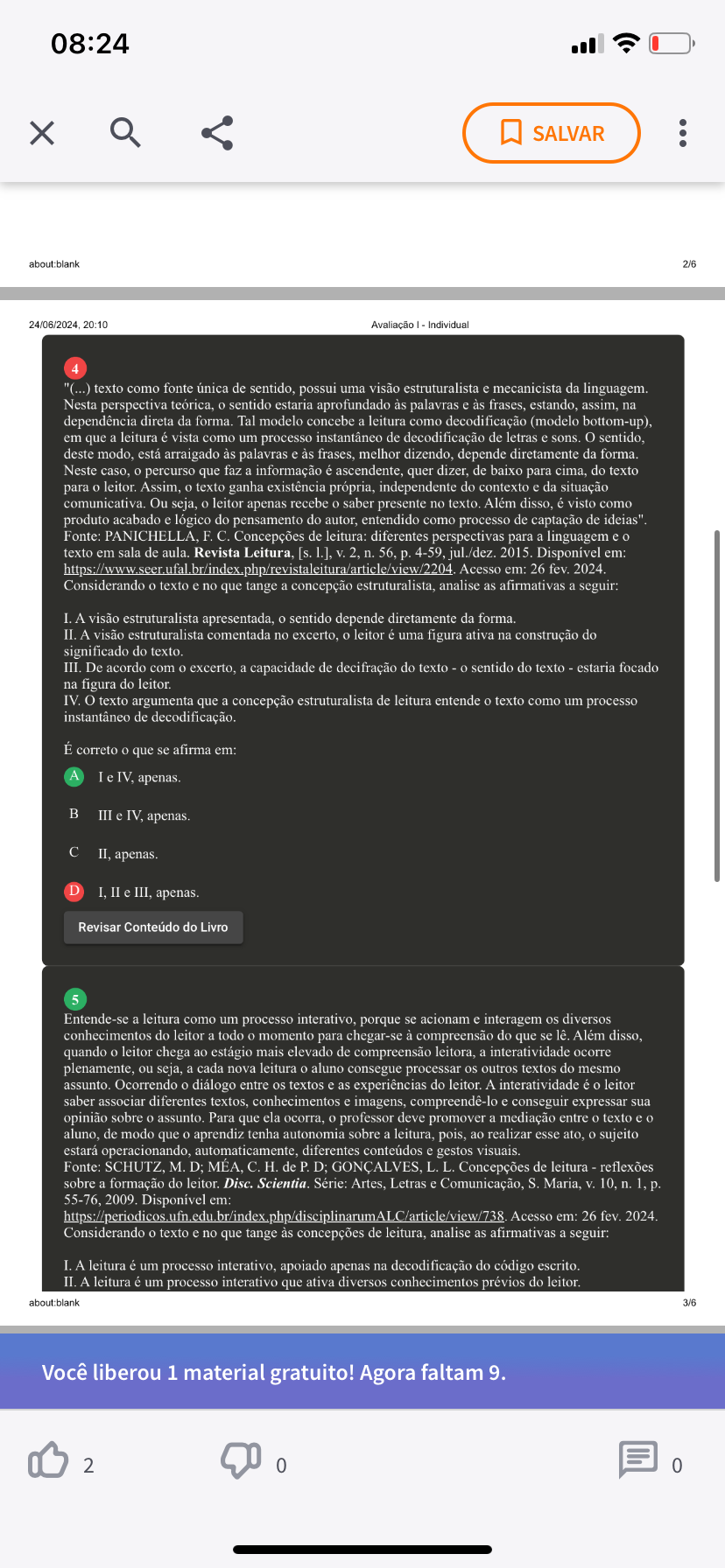 08:24 X SALVAR about:blank 2/6 24/06/2024 20:10 Avaliação Individual 4 "(...) texto como fonte única de sentido. possui uma visão estruturalista e mecanicista da Nesta perspectiva o sentido estaria aprofundado às palavras e às frases, na dependência direta da forma Tal modelo concebe a leitura como decodificação (modelo em que a leitura é vista como um processo instantâneo de decodificação de letras e sons sentido. deste está arraigado às palavras e às frases. melhor dizendo, depende diretamente da forma Neste caso. percurso que faz a informação é quer dizer. de baixo para do texto para Assim. o texto ganha existência independente do contexto e da situação comunicativa. Ou seja, leitor apenas recebe saber presente no Além disso. é visto como produto acabado e lógico do pensamento do autor, entendido como processo de captação de ideias". Fonte: Concepções de leitura diferentes perspectivas para a linguagem e texto em sala de aula. Revista Leitura. [s. 2. n. 56. p. 4-59. jul./dez 2015. Disponível em: em: 26 fev 2024. Considerando texto e no que tange a concepção estruturalista, analise as afirmativas a seguir: I. A visão estruturalista apresentada, sentido depende diretamente da forma II. A visão estruturalista comentada no excerto. leitor é uma figura ativa na construção do significado do texto. III. De acordo com o a capacidade de decifração do texto - sentido do texto estaria focado na figura do leitor. IV. texto argumenta que a concepção estruturalista de leitura entende texto como um processo instantâneo de decodificação. É correto que se afirma em: A IV. apenas B III apenas C II. apenas D e III. apenas. Revisar Conteúdo do Livro 5 Entende-se a leitura como um processo porque se acionam e interagem os diversos conhecimentos do leitor a todo o momento para chegar-se à compreensão do que se Além disso. quando leitor chega ao estágio mais elevado de compreensão a interatividade ocorre plenamente, ou seja, a cada nova leitura aluno consegue processar os outros textos do mesmo assunto. Ocorrendo diálogo entre os textos e as experiências do leitor. A interatividade é leitor saber associar diferentes textos. conhecimentos e imagens, e conseguir expressar sua opinião sobre assunto. Para que ela ocorra, professor deve promover a mediação entre texto e aluno, de modo que aprendiz tenha autonomia sobre a leitura, pois, ao realizar esse ato. sujeito estará operacionando, automaticamente. diferentes conteúdos e gestos visuais. Fonte: SCHUTZ. M. D: H de P D: L L. Concepções de leitura reflexões sobre a formação do leitor. Disc. Scientia Série: Letras Comunicação. S. V. 10 1 p. 55-76, 2009. Disponível em em 26 fev 2024 Considerando texto e no que tange às concepções de analise as afirmativas a seguir: A leitura é um processo interativo. apoiado apenas na decodificação do código II. A leitura é um processo interativo que ativa diversos conhecimentos prévios do leitor. about:blank 3/6 Você liberou 1 material gratuito! Agora faltam 9. 2 0 0