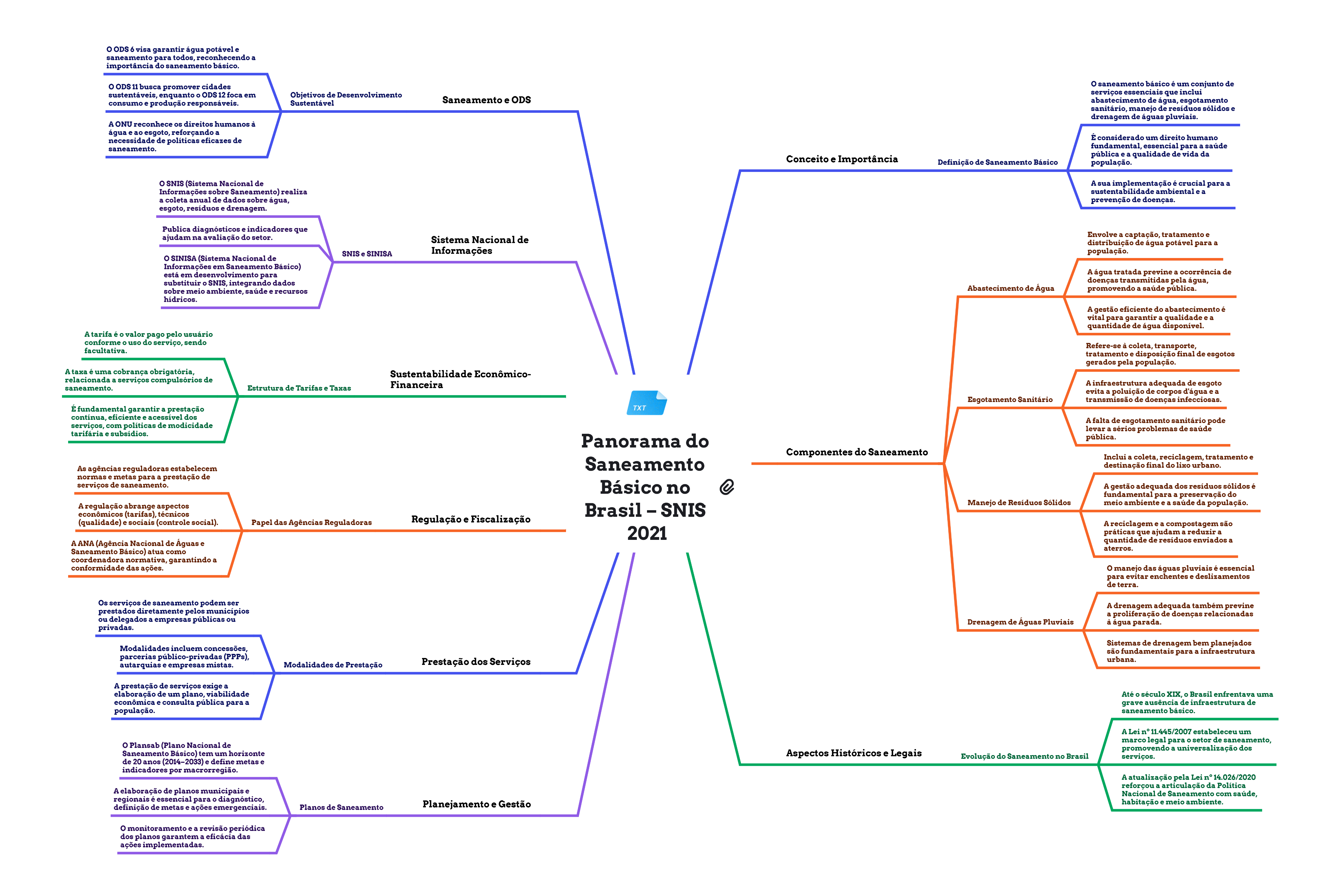 Panorama do Saneamento Básico no Brasil – SNIS 2021 � Conceito e Importância Definição de Saneamento Básico O saneamento básico é um conjunto de serviços essenciais que inclui abastecimento de água, esgotamento sanitário, manejo de resíduos sólidos e drenagem de águas pluviais. É considerado um direito humano fundamental, essencial para a saúde pública e a qualidade de vida da população. A sua implementação é crucial para a sustentabilidade ambiental e a prevenção de doenças. Componentes do Saneamento Abastecimento de Água Envolve a captação, tratamento e distribuição de água potável para a população. A água tratada previne a ocorrência de doenças transmitidas pela água, promovendo a saúde pública. A gestão eficiente do abastecimento é vital para garantir a qualidade e a quantidade de água disponível. Esgotamento Sanitário Refere-se à coleta, transporte, tratamento e disposição final de esgotos gerados pela população. A infraestrutura adequada de esgoto evita a poluição de corpos d'água e a transmissão de doenças infecciosas. A falta de esgotamento sanitário pode levar a sérios problemas de saúde pública. Manejo de Resíduos Sólidos Inclui a coleta, reciclagem, tratamento e destinação final do lixo urbano. A gestão adequada dos resíduos sólidos é fundamental para a preservação do meio ambiente e a saúde da população. A reciclagem e a compostagem são práticas que ajudam a reduzir a quantidade de resíduos enviados a aterros. Drenagem de Águas Pluviais O manejo das águas pluviais é essencial para evitar enchentes e deslizamentos de terra. A drenagem adequada também previne a proliferação de doenças relacionadas à água parada. Sistemas de drenagem bem planejados são fundamentais para a infraestrutura urbana. Aspectos Históricos e Legais Evolução do Saneamento no Brasil Até o século XIX, o Brasil enfrentava uma grave ausência de infraestrutura de saneamento básico. A Lei nº 11.445/2007 estabeleceu um marco legal para o setor de saneamento, promovendo a universalização dos serviços. A atualização pela Lei nº 14.026/2020 reforçou a articulação da Política Nacional de Saneamento com saúde, habitação e meio ambiente.Planejamento e GestãoPlanos de Saneamento O Plansab (Plano Nacional de Saneamento Básico) tem um horizonte de 20 anos (2014–2033) e define metas e indicadores por macrorregião. A elaboração de planos municipais e regionais é essencial para o diagnóstico, definição de metas e ações emergenciais. O monitoramento e a revisão periódica dos planos garantem a eficácia das ações implementadas. Prestação dos ServiçosModalidades de Prestação Os serviços de saneamento podem ser prestados diretamente pelos municípios ou delegados a empresas públicas ou privadas. Modalidades incluem concessões, parcerias público-privadas (PPPs), autarquias e empresas mistas. A prestação de serviços exige a elaboração de um plano, viabilidade econômica e consulta pública para a população. Regulação e FiscalizaçãoPapel das Agências Reguladoras As agências reguladoras estabelecem normas e metas para a prestação de serviços de saneamento. A regulação abrange aspectos econômicos (tarifas), técnicos (qualidade) e sociais (controle social). A ANA (Agência Nacional de Águas e Saneamento Básico) atua como coordenadora normativa, garantindo a conformidade das ações. Sustentabilidade Econômico- FinanceiraEstrutura de Tarifas e Taxas A tarifa é o valor pago pelo usuário conforme o uso do serviço, sendo facultativa. A taxa é uma cobrança obrigatória, relacionada a serviços compulsórios de saneamento. É fundamental garantir a prestação contínua, eficiente e acessível dos serviços, com políticas de modicidade tarifária e subsídios. Sistema Nacional de InformaçõesSNIS e SINISA O SNIS (Sistema Nacional de Informações sobre Saneamento) realiza a coleta anual de dados sobre água, esgoto, resíduos e drenagem. Publica diagnósticos e indicadores que ajudam na avaliação do setor. O SINISA (Sistema Nacional de Informações em Saneamento Básico) está em desenvolvimento para substituir o SNIS, integrando dados sobre meio ambiente, saúde e recursos hídricos. Saneamento e ODSObjetivos de Desenvolvimento Sustentável O ODS 6 visa garantir água potável e saneamento para todos, reconhecendo a importância do saneamento básico. O ODS 11 busca promover cidades sustentáveis, enquanto o ODS 12 foca em consumo e produção responsáveis. A ONU reconhece os direitos humanos à água e ao esgoto, reforçando a necessidade de políticas eficazes de saneamento.