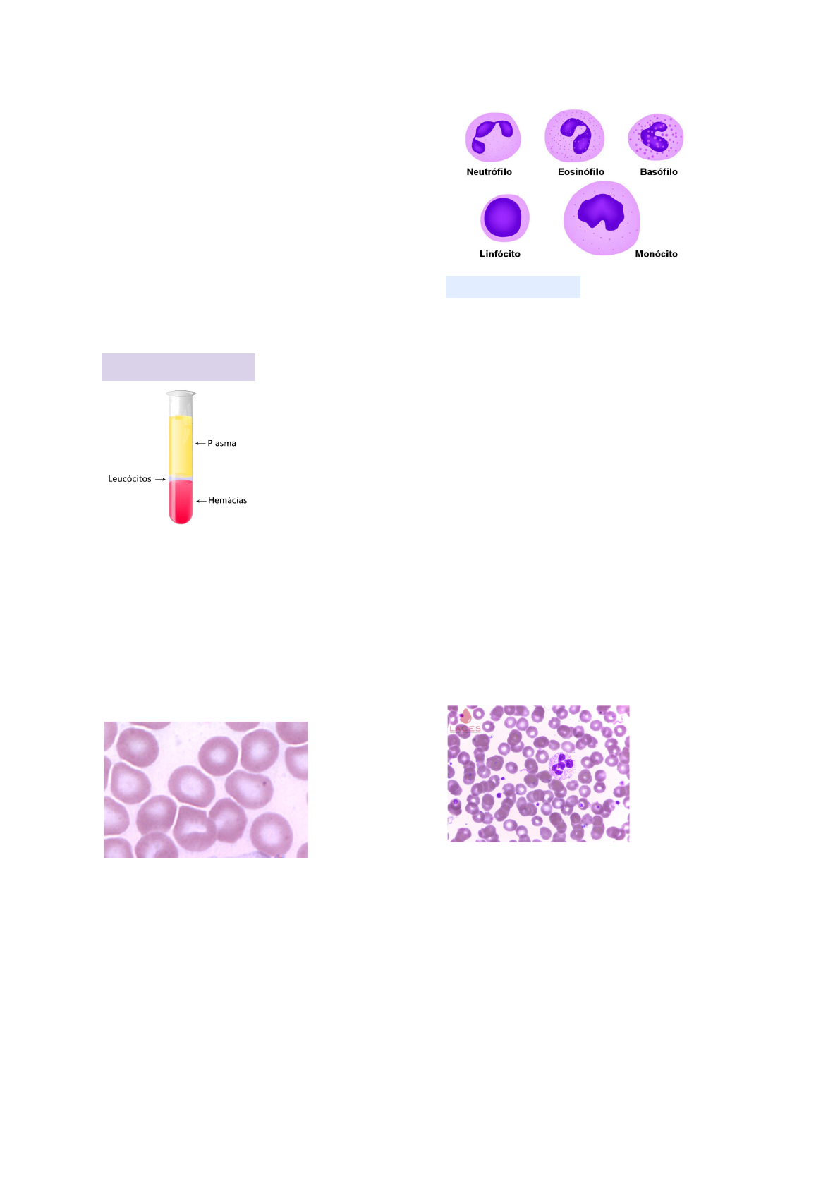 Tecido sanguíneo ↪É um tipo de tecido conjuntivo que pode ser dividido em duas partes: plasma (parte líquida) e células sanguíneas (elementos figurados do sangue). ↪Possui função de levar aporte nutricional e oxigênio para as células que compõem os diversos tecidos. Composição do sangue: Plasma - É uma solução aquosa amarelada constituída de água, sais minerais e proteínas. Sua função é transportar essas substâncias pelo corpo. Hemácias (eritrócitos) - São células anucleadas em forma de disco bicôncavo e estão relacionadas principalmente com o transporte de oxigênio. Leucócitos - São células que participam das defesas celulares e imunocelulares do organismo. Constantemente os leucócitos deixam os capilares por diapedese e migram para o local da inflamação. Podem ser divididas em: GRANULÓCITOS Apresentam granulações específicas no citoplasma e núcleo multilobulados, dispondo seu núcleo de forma irregular. São três tipos: Neutrófilos - São os mais presentes no, representando cerca de 65% dos leucócitos do sangue. São células arredondadas e apresentam por 2 a 5 lóbulos (multilobulados). Constituem a primeira linha de defesa celular contra a invasão de microorganismos, sendo fagócitos ativos de partículas de pequenas dimensões. Eosinófilos - Os eosinófilos representam cerca de 2-4% dos leucócitos e apresentam geralmente 2 lóbulos. Possui função importante na medição de processos inflamatórios associados à alergia. *O citoplasma contém grande quantidade de grandes grânulos de cor laranja. Basófilos - Constitui cerca de 0,5-1% dos leucócitos e apresentam grânulos maiores que os dos neutrófilos que os dos neutrófilos e eosinófilos e são encontrados nas cores azul ou púrpura. AGRANULÓCITOS Dispõem seu núcleo sem lobulações, possuindo uma forma mais regular, e seu citoplasma não apresenta granulações específicas. São dois tipos: Linfócitos - Eles reconhecem moléculas estranhas em diferentes agentes infecciosos. Combatendo por meio de resposta humoral (produção de imunoglobulinas). Podem ser divididos em 2 tipos, T e B, a função dos linfócitos T é facilitar a produção de anticorpos pelos linfócitos B. Monócitos - São os maiores leucócitos circulantes e representam de 4 a 8% dos leucócitos na circulação sanguínea. Faz parte do sistema fagocitário mononuclear. PLAQUETAS - são fragmentos celulares produzidos pela medula óssea (megacariócito) que circulam na corrente sanguínea e ajudam o sangue a coagular. Ela inclui a coagulação do sangue. Visão geral de algumas células de uma lâmina: