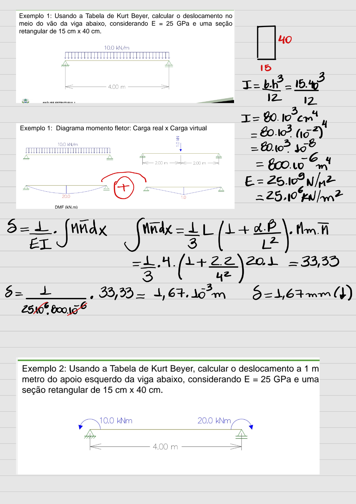 Exemplo 1: Usando a Tabela de Kurt Beyer, calcular o deslocamento no meio do vão da viga abaixo, considerando E = 25 GPa e uma seção retangular de 15 cm X 40 cm. 40 10.0 kN/m 15 4.00 m = = 15.403 12 12 Exemplo 1: Diagrama momento fletor: Carga real X Carga virtual = = A 2.00 m 2.00 m -64 E=25.109 N/M2 + 1.0 DMF (kN.m) EI = 3 (++ + L2 2.2 42 = 33,33 = 33,33 = Exemplo 2: Usando a Tabela de Kurt Beyer, calcular o deslocamento a 1 m metro do apoio esquerdo da viga abaixo, considerando E = 25 GPa e uma seção retangular de 15 cm X 40 cm. 10.0 kNm 20.0 kNm 4.00 mExemplo 2: Diagrama momento fletor: Carga real X Carga virtual 20.0 kNm 1.00 m 3.00 m 4.00 m 3 20.0 10.0 0.75 DMF (kN.m) DMF (kN.m) S=1 EI 6 1.4.0,75. 6 4 20 4 = - 21,25 -3 -21,25 S=-1,06.10 - m Exemplo 3: Usando a Tabela de Kurt Beyer, calcular o deslocamento a 1 m metro do apoio direito da viga abaixo, considerando E = 25 GPa e uma seção retangular de 15 cm X 40 cm. 10.0 kNm 4.00 mExemplo 3: Diagrama momento fletor: Carga real X Carga virtual 10.0 kN/m 4 3.00 m 4.00 m 40.00 20.00 8.75 0.75 DMF (kN.m) DMF (kN.m) 40 40 20 20 = + 4 4 S=1. EI - 20 + 3 1 0,75 3 + 6 1.4. 3 3.1 = = - -18,75 3