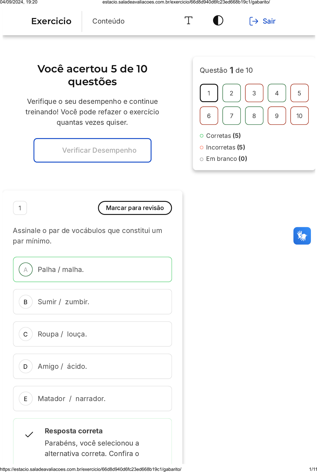 Você acertou 5 de 10 questões Verifique o seu desempenho e continue treinando! Você pode refazer o exercício quantas vezes quiser. Verificar Desempenho A B C D E 1 Marcar para revisão Assinale o par de vocábulos que constitui um par mínimo. Palha / malha. Sumir / zumbir. Roupa / louça. Amigo / ácido. Matador / narrador. Resposta correta Parabéns, você selecionou a alternativa correta. Confira o Questão 1 de 10 Corretas �5� Incorretas �5� Em branco �0� 1 2 3 4 5 6 7 8 9 10 Exercicio Conteúdo Sair 04/09/2024, 19:20 estacio.saladeavaliacoes.com.br/exercicio/66d8d940d6fc23ed668b19c1/gabarito/ https://estacio.saladeavaliacoes.com.br/exercicio/66d8d940d6fc23ed668b19c1/gabarito/ 1/11 A B C D E gabarito comentado! Gabarito Comentado Palha e malha se opõem pelos fonemas [p] e [m]: [paʎa] e [maʎa]. 2 Marcar para revisão Na identificação dos fonemas, quando não é possível encontrar um par mínimo na língua em estudo, faz-se uso de: textos escritos recursos fonéticos aspectos prosódicos um alofone um par análogo Resposta correta Parabéns, você selecionou a alternativa correta. Confira o gabarito comentado! Gabarito Comentado Conforme Callou e Leite �2000�56�, ´´Na ausência de pares mínimos, usa-se o par análogo. É um par quase perfeito, quase 04/09/2024, 19:20 estacio.saladeavaliacoes.com.br/exercicio/66d8d940d6fc23ed668b19c1/gabarito/ https://estacio.saladeavaliacoes.com.br/exercicio/66d8d940d6fc23ed668b19c1/gabarito/ 2/11 A B C D E mínimo que difere em mais de um segmento, diferença que não é motivada pelo contexto fonológico e que serve de indicativo para a existência de dois fonemas distintos. Ex. pato e bela. Não há nada no ambiente fonético que antecede [p] e [b] que induza ao vozeamento ou desvozeamento.`` 3 Marcar para revisão Podemos afirmar que "fonologia" é: é o ramo da Linguística que estuda o sistema morfológico de um idioma. é o ramo da Linguística que estuda o sistema sintático de um idioma. é o ramo da Linguística que estuda o sistema sonoro de um idioma. é o ramo da Linguística que estuda o léxico de um idioma. é o ramo da Linguística que estuda a variação de um idioma. Resposta incorreta Opa! A alternativa correta é a letra C. Confira o gabarito comentado! Gabarito Comentado 04/09/2024, 19:20 estacio.saladeavaliacoes.com.br/exercicio/66d8d940d6fc23ed668b19c1/gabarito/ https://estacio.saladeavaliacoes.com.br/exercicio/66d8d940d6fc23ed668b19c1/gabarito/ 3/11 A B C D E A fonologia estuda o sistema sonoro de uma língua em particular porque ela analisa quais sons possuem capacidade para distinguir significado naquele sistema. Por exemplo, a letra S é representada por diversos fonemas em português: casa �KAZA] e cassa �KASA�. No entanto, no vocábulo CASAS, esse S final teria a seguinte transcrição fonológica [kazaS] com esse s final sendo representado pelo arquifonema já que em final de palavras não há distinção de significado. 4 Marcar para revisão O princípio da comutação é utilizado para identificar os fonemas em uma língua. Um par mínimo que ilustra esse princípio é fala/vala menino/criança lápis/borracha homem/mulher sala/suja 04/09/2024, 19:20 estacio.saladeavaliacoes.com.br/exercicio/66d8d940d6fc23ed668b19c1/gabarito/ https://estacio.saladeavaliacoes.com.br/exercicio/66d8d940d6fc23ed668b19c1/gabarito/ 4/11 A B C D E Resposta correta Parabéns, você selecionou a alternativa correta. Confira o gabarito comentado! Gabarito Comentado Ao trocar /f/ por /v/, como em "faca" e "vaca", por exemplo, temos duas palavras distintas na língua. Isso comprova que /f/ e /v/ são dois fonemas da Língua Portuguesa. 5 Marcar para revisão Assinale o par de vocábulos que constitui um par análogo. Sumir / zunir. Ponto / ponte. Lata / mata. Tela / vela. Calha / malha. Resposta incorreta Opa! A alternativa correta é a letra A. Confira o gabarito comentado! 04/09/2024, 19:20 estacio.saladeavaliacoes.com.br/exercicio/66d8d940d6fc23ed668b19c1/gabarito/ https://estacio.saladeavaliacoes.com.br/exercicio/66d8d940d6fc23ed668b19c1/gabarito/ 5/11 A B C D E Gabarito Comentado Sumir e zunir constituem um par análogo porque se opõem em mais de dois fonemas [s] / [z] e [m] / [n] 6 Marcar para revisão Fone e fonema são conceitos distintos, pois representam, respectivamente, estruturas estudadas pela Fonética e Fonologia. A partir dessas premissas, qual das alternativas a seguir está em DESACORDO com as propostas desses dois ramos de estudo? O fone, segmento fônico descrito pela fonética, é representado entre ([ ]). O fonema é um segmento fônico mínimo cuja função é diferenciar o significado de uma palavra em relação a outra. A Fonologia é o estudo das diferenças fônicas de uma língua correlacionadas com as diferenças de significado. [k] e [g] não são fonemas em português, apesar de termos o par mínimo calo/galo. No processo de comutação, temos a substituição de segmentos fônicos em uma sequência, a fim de verificar uma diferença lexical. 04/09/2024, 19:20 estacio.saladeavaliacoes.com.br/exercicio/66d8d940d6fc23ed668b19c1/gabarito/ https://estacio.saladeavaliacoes.com.br/exercicio/66d8d940d6fc23ed668b19c1/gabarito/ 6/11 A B C D E Resposta incorreta Opa! A alternativa correta é a letra D. Confira o gabarito comentado! Gabarito Comentado O par mínimo [k] e [g] são fonemas, pois se substituirmos um pelo outro há a mudança de significado entre eles. 7 Marcar para revisão Qual das palavras abaixo possui três fonemas? fala temporal hoje ápice norma Resposta correta Parabéns, você selecionou a alternativa correta. Confira o gabarito comentado! Gabarito Comentado 04/09/2024, 19:20 estacio.saladeavaliacoes.com.br/exercicio/66d8d940d6fc23ed668b19c1/gabarito/ https://estacio.saladeavaliacoes.com.br/exercicio/66d8d940d6fc23ed668b19c1/gabarito/ 7/11 A B C D E A palavra HOJE possui 3 fonemas porque a letra H não é representada por nenhum fonema em português. ----- 8 Marcar pa