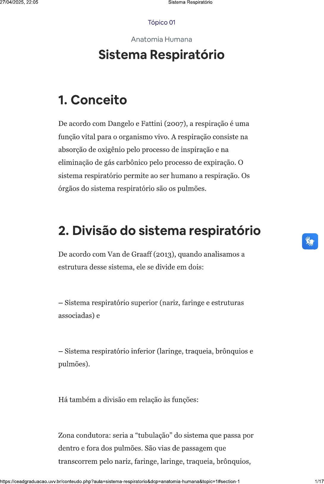 27/04/2025, 22:05 Sistema Respiratório Tópico 01 Anatomia Humana Sistema Respiratório 1. Conceito De acordo com Dangelo e Fattini (2007), a respiração é uma função vital para o organismo vivo. A respiração consiste na absorção de oxigênio pelo processo de inspiração e na eliminação de gás carbônico pelo processo de expiração. sistema respiratório permite ao ser humano a respiração. Os órgãos do sistema respiratório são os pulmões. 2. Divisão do sistema respiratório De acordo com Van de Graaff (2013), quando analisamos a estrutura desse sistema, ele se divide em dois: - Sistema respiratório superior (nariz, faringe e estruturas associadas) e - Sistema respiratório inferior (laringe, traqueia, brônquios e pulmões). Há também a divisão em relação às funções: Zona condutora: seria a "tubulação" do sistema que passa por dentro e fora dos pulmões. São vias de passagem que transcorrem pelo nariz, faringe, laringe, traqueia, brônquios, 1/1727/04/2025, 22:05 Sistema Respiratório bronquíolos e bronquíolos terminais. A sua função é filtrar, aquecer e umedecer o ar, conduzindo-o para os pulmões (VAN DE GRAAFF, 2013). Zona respiratória: é o tecido localizado no interior dos pulmões onde ocorrem as trocas gasosas. Incluem bronquíolos respiratórios, ductos alveolares e sacos alveolares. São os principais locais onde ocorrem as trocas gasosas entre o sangue e o ar. Para saber mais sobre o sistema respiratório, assista ao vídeo. sistema respiratório 2/1727/04/2025, 22:05 Sistema Respiratório conjunto de órgãos do sistema respiratório nos permite inspirar oxigênio e expirar gás carbônico. A respiração é uma característica vital para os seres vivos. Os pulmões são os órgãos respiratórios por excelência, pois abrigam a zona condutora de ar. 3. Anatomia externa e interna do nariz Moore (2017) descreve que a parte externa do nariz é dividida em raiz, dorso, ápice e base. Na base do nariz, encontramos as narinas, responsáveis pela condução do ar da parte externa para o trato respiratório inferior (pulmões). As narinas são limitadas lateralmente pelas asas do nariz. esqueleto da parte externa do nariz é principalmente cartilagíneo; diferentes formas dessa cartilagem implicam em tamanhos diferentes de nariz. A pele que recobre a parte externa do nariz estende-se até o vestíbulo do nariz. vestíbulo do nariz é a região onde estão localizados 3/1727/04/2025, 22:05 Sistema Respiratório os pelos (vibrissas), que filtram o ar que entra na cavidade nasal. O vestíbulo é a região de entrada da cavidade nasal. Moore (2017) afirma que a parte óssea do nariz é formada pelos nasais, processo frontal da maxila, parte nasal do frontal, sua espinha nasal e partes ósseas do septo nasal (osso vômer e etmoide). A parte cartilaginosa do nariz é formada por cinco cartilagens principais, sendo duas cartilagens laterais e duas cartilagens alares, em forma de U, móveis e uma cartilagem do septo. As cartilagens alares são móveis para garantir a dilatação e contração do nariz. Moore (2017) explica que a parte interna do nariz é a cavidade nasal. O septo nasal divide a cavidade nasal em duas cavidades nasais. Ele é formado pela lâmina perpendicular do etmoide, o OSSO vômer e a cartilagem do septo. A abertura da cavidade nasal são as narinas; posteriormente, essa cavidade desemboca na nasofaringe, através das coanas. A cavidade nasal é revestida por mucosa e nela, encontramos as conchas nasais, lâminas ósseas revestidas por mucosa. Limites da cavidade nasal Moore (2017) afirma que a cavidade nasal possui limites inferior e laterais. O OSSO palatino limita inferiormente a cavidade nasal. As paredes laterais da cavidade nasal são limitadas pelas conchas nasais: superior, média e inferior. As conchas são delimitadas por meatos: meato nasal superior, meato nasal médio e meato nasal inferior. Por essa razão, a parede lateral da cavidade nasal é irregular. A parte medial da cavidade nasal é o septo nasal. A parte superior, ou seja, teto da cavidade, é dividida em frontonasal, esfenoidal e etmoidal, nomeadas de acordo com os que a circunda. 4/1727/04/2025, 22:05 Sistema Respiratório Seios Paranasais Para Moore (2017), há quatro seios paranasais localizados em quatro do crânio: esfenóide, etmóide, OSSO frontal e maxilar. O seio esfenoidal é localizado superoposterior à cavidade nasal, no recesso esfenoetmoidal. No meato nasal superior, desembocam os seios etmoidais. O meato nasal médio se comunica com o seio frontal. O seio frontal drena através de um ducto frontonasal para o infundíbulo etmoidal que se abre no hiato semilunar no meato nasal médio. As células etmoidais são pequenas invaginações da túnica mucosa dos meatos nasais médio e superior para o osso etmoide entre a cavidade nasal e a órbita. As células etmoidais anteriores drenam muco produzido direta ou indiretamente para o meato nasal médio através do infundíbulo etmoidal. As células etmoidais médias abrem diretamente no meato nasal médio e, às vezes, são denominadas células bolhosas, porque formam a bolha etmoidal, uma saliência no hiato semilunar. Os seis esfenoidais são localizados no corpo do esfenoide e drenam para o recesso esfeno etmoidal. Os seis maxilares são os maiores seios e estão localizados no maxilar. Se comunicam com o meato nasal médio. Funções do nariz Para Moore (2017), o nariz é um órgão de dupla função. À medida que o ar atravessa o nariz, é analisado quimicamente. O órgão cumpre a sua função olfatória. O terço superior da mucosa nasal é a região olfatória. Os dois terços inferiores são conhecidos como região respiratória. Sendo assim, a cavidade 5/1727/04/2025, 22:05 Sistema Respiratório nasal, além de conduzir o ar inspirado para a faringe, aquece, umidifica e filtra o ar. Por isso, é importante que respiremos pelo nariz e não pela boca. A cavidade nasal se comunica com os seios 