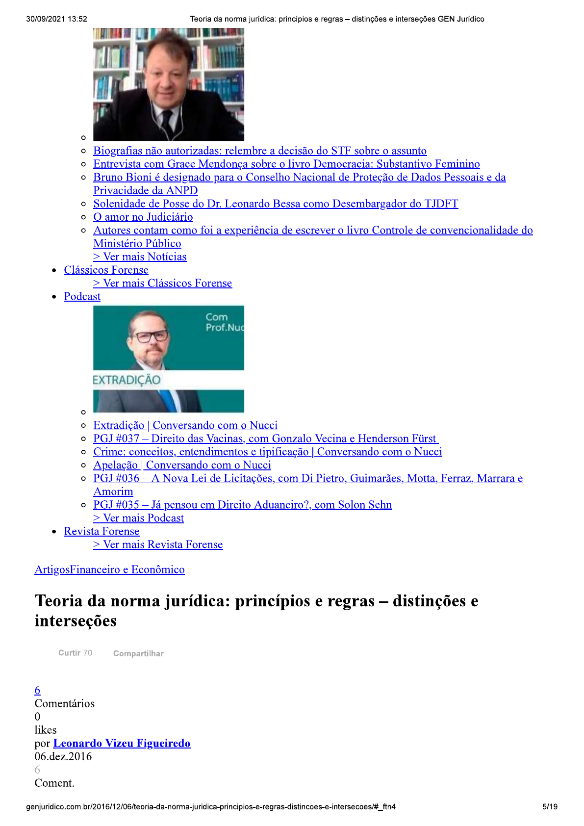 30/09/2021 13:52 Teoria da norma jurídica: princípios e regras - distinções e interseções GEN Jurídico Biografias não autorizadas: relembre a decisão do STF sobre o assunto Entrevista com Grace Mendonça sobre o livro Democracia: Substantivo Feminino Bruno Bioni é designado para o Conselho Nacional de Proteção de Dados Pessoais e da Privacidade da ANPD Solenidade de Posse do Dr. Leonardo Bessa como Desembargador do TJDFT O amor no Judiciário Autores contam como foi a experiência de escrever o livro Controle de convencionalidade do Ministério Público > Ver mais Notícias Clássicos Forense > Ver mais Clássicos Forense Podcast Com Prof.Nuc EXTRADIÇÃO o Extradição Conversando com o Nucci PGJ #037 - Direito das Vacinas, com Gonzalo Vecina e Henderson Fürst Crime: conceitos, entendimentos e tipificação Conversando com o Nucci Apelação Conversando com o Nucci PGJ #036 - A Nova Lei de Licitações, com Di Pietro, Motta, Ferraz, Marrara e Amorim PGJ #035 - Já pensou em Direito com Solon Sehn > Ver mais Podcast Revista Forense > Ver mais Revista Forense ArtigosFinanceiro e Econômico Teoria da norma jurídica: princípios e regras - distinções e interseções Curtir 70 Compartilhar 6 Comentários 0 likes por Leonardo Vizeu Figueiredo 06.dez.2016 6 Coment. 5/1930/09/2021 13:52 Teoria da norma jurídica: princípios e regras - distinções e interseções GEN Jurídico 0 likes 1. Introdução Muito se debate no meio acadêmico sobre a necessidade de se elaborar, de maneira uniforme, uma teoria consistente e, ao mesmo tempo, constante, sobre a norma jurídica, definindo-a e sistematizando-a, de forma a fornecer ao operador do direito uma base sólida na tarefa de subsumir o direito aos casos concretos que, diariamente, pedem uma resposta e um posicionamento firme para manter a sociedade pacífica e harmônica. Isto porque, a base teórica sobre o tema fica, constantemente, sujeita às oscilações do meio acadêmico, o qual, muitas vezes, se deixa levar por flutuações de opiniões pessoais, sem o devido rigor científico, que aumenta as dúvidas e os questionamentos, variando conceitos e terminologias sem apresentar uma real contribuição para o tema. Assim, o presente artigo, sem a pretensão de esgotar o tema, se propõe a analisar a gênese da norma jurídica, através do processo político oriundo da democracia representativa que orienta nosso Estado de Direito, bem como qual a relação da norma jurídica com o patrimônio jurídico dos cidadãos, no que se refere à individualização de direito subjetivo para estes. 2. Da Política O ponto de partida do presente estudo, necessariamente, tem que ser a análise da política, sua origem e razão de ser, bem como sua relação com a ciência jurídica. A vida em coletividade é indispensável à sobrevivência do homem, quanto ser sociável que é, uma vez que, individualmente, não teria como suprir todas as suas necessidades, bem como obter todos os bens imprescindíveis para garantir sua sobrevivência. A convivência em um meio comum pressupõe a busca de interesses gerais, que atendam às necessidades coletivas, bem como a persecução das expectativas individuais. Assim, toda a aglomeração de indivíduos, em que pese objetivar o atendimento dos anseios comuns (bem estar social), gera zonas de atritos entre os 6/1930/09/2021 13:52 Teoria da norma jurídica: princípios e regras distinções e interseções GEN Jurídico diversos interesses individuais presentes, que muitas vezes se revelam antagônicos e colidentes, ante a escassez de bens existentes na sociedade, em relação aos indivíduos que a compõem. O estudo da reunião de pessoas em torno de uma mesma base territorial para atendimento de suas necessidades originou-se com a filosofia helênica, a partir do conceito de polis. Esta representa o ambiente, dentro de uma delimitação geográfica, na qual os indivíduos convivem e buscam a realização de seus interesses, seja em caráter coletivo, seja para fins meramente pessoais. A fim de garantir a persecução de tais interesses, os pensadores helenos conceberam a política, como a arte da defesa e do atendimento tanto das necessidades coletivas, quanto dos anseios individuais. Isto é, a arte de se administrar o consenso e harmonizar o dissenso social. Para tanto, mister se fez garantir a todos participativa, bem como representatividade individual perante a coletividade. Nessa linha, confira-se a seguinte lição: "(...) os gregos são para nós, globalmente, os inventores da polis, assimilada à democracia, e da filosofia, assimilada aos grandes nomes de Sócrates, Platão e Aristóteles. Ora, a fase da história grega durante a qual a polis é criada, instituída e depois transformada localmente e muito brevemente em polis democrática, vai do século VIII ao século V a.c.[1]" Destarte, a política é a ciência pela qual se busca atingir aos anseios do povo, tanto quanto em caráter macro como em micro. Vale destacar, por oportuno, a célebre lição de um de nossos mais eminentes políticos à época do Império, reinado de Pedro II, Dr. Adolpho Bezerra de Menezes, em discurso proferido no plenário do Parlamento Nacional, extraído da ata de sessão realizada em 04 de junho de 1867, p. 37: "(...) A política, como eu a compreendo, não é uma especulação dos homens, é uma religião, a religião da pátria, tão sagrada e obrigatória como o culto das verdades eternas que constitui a religião de Deus.' [2] Na constante busca das necessidades gerais e individuais, mister se faz estabelecer um conjunto de normas, permeadas de valores éticos, morais, científicos, dentre outros, a fim de garantir o respeito às pessoas e suas opiniões, evitando que a colisão de interesses antagônicos gerem conflitos violentos e irracionais. Para tanto, os valores constantes na norma, que representa o código de conduta daquilo que a sociedade considera como padrão de comportamento íntegro, correto e dir