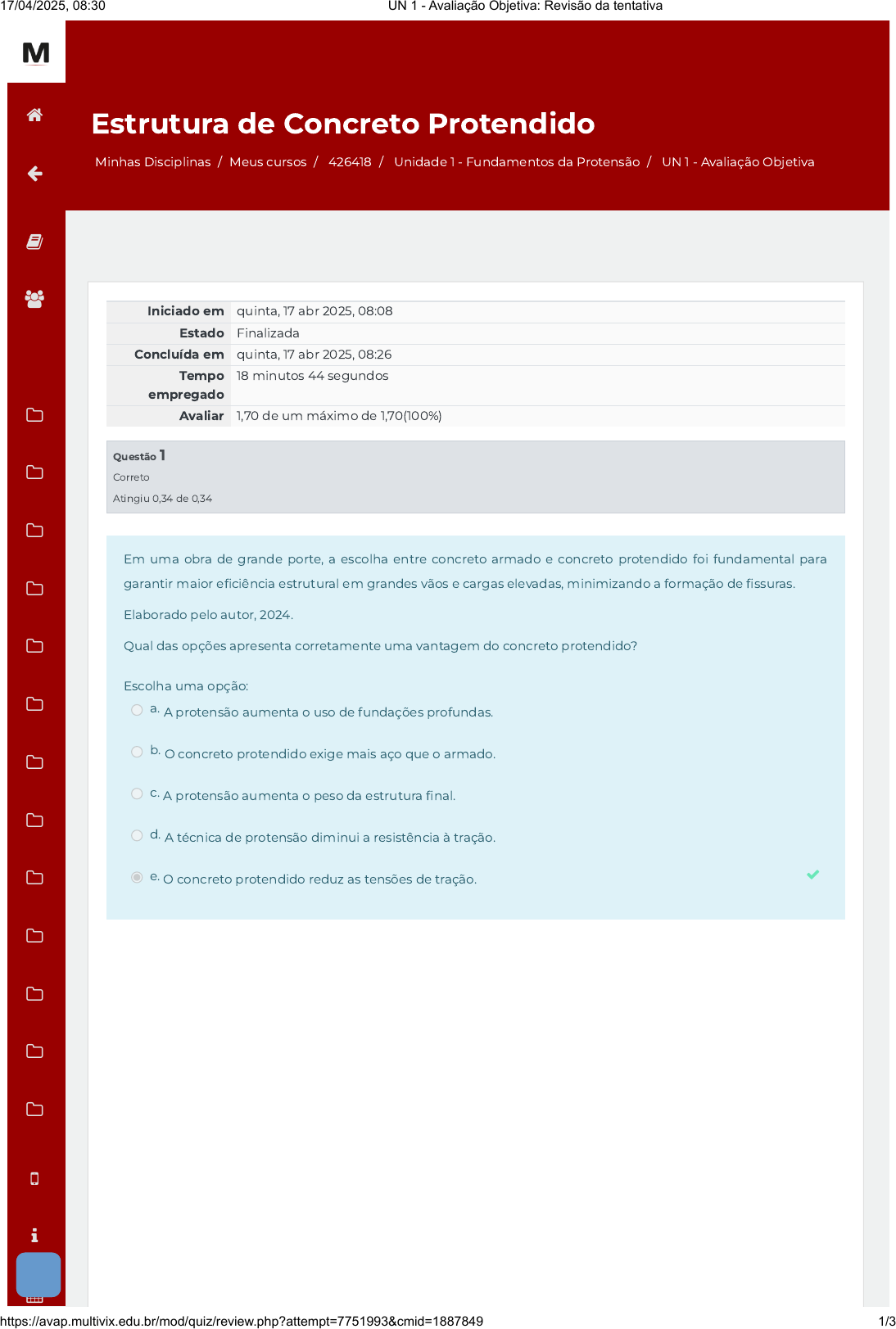Minhas Disciplinas / Meus cursos / 426418 / Unidade 1 - Fundamentos da Protensão / UN 1 - Avaliação Objetiva Estrutura de Concreto Protendido Iniciado em quinta, 17 abr 2025, 08:08 Estado Finalizada Concluída em quinta, 17 abr 2025, 08:26 Tempo empregado 18 minutos 44 segundos Avaliar 1,70 de um máximo de 1,70(100%) Questão 1 Correto Atingiu 0,34 de 0,34 Em uma obra de grande porte, a escolha entre concreto armado e concreto protendido foi fundamental para garantir maior eficiência estrutural em grandes vãos e cargas elevadas, minimizando a formação de fissuras. Elaborado pelo autor, 2024. Qual das opções apresenta corretamente uma vantagem do concreto protendido? Escolha uma opção: a. A protensão aumenta o uso de fundações profundas. b. O concreto protendido exige mais aço que o armado. c. A protensão aumenta o peso da estrutura final. d. A técnica de protensão diminui a resistência à tração. e. O concreto protendido reduz as tensões de tração. 17/04/2025, 08:30 UN 1 - Avaliação Objetiva: Revisão da tentativa https://avap.multivix.edu.br/mod/quiz/review.php?attempt=7751993&cmid=1887849 1/3 https://avap.multivix.edu.br/my/ https://avap.multivix.edu.br/course/view.php?id=33560 https://avap.multivix.edu.br/course/view.php?id=33560§ion=2 https://avap.multivix.edu.br/mod/quiz/view.php?id=1887849 https://avap.multivix.edu.br/my/ https://avap.multivix.edu.br/course/view.php?id=33560 https://avap.multivix.edu.br/user/index.php?id=33560 https://avap.multivix.edu.br/course/view.php?id=33560§ion=1 https://avap.multivix.edu.br/course/view.php?id=33560§ion=2 https://avap.multivix.edu.br/course/view.php?id=33560§ion=3 https://avap.multivix.edu.br/course/view.php?id=33560§ion=4 https://avap.multivix.edu.br/course/view.php?id=33560§ion=5 https://avap.multivix.edu.br/course/view.php?id=33560§ion=6 https://avap.multivix.edu.br/course/view.php?id=33560§ion=7 https://avap.multivix.edu.br/course/view.php?id=33560§ion=8 https://avap.multivix.edu.br/course/view.php?id=33560§ion=9 https://avap.multivix.edu.br/course/view.php?id=33560§ion=10 https://avap.multivix.edu.br/course/view.php?id=33560§ion=11 https://avap.multivix.edu.br/course/view.php?id=33560§ion=12 https://avap.multivix.edu.br/course/view.php?id=33560§ion=13 https://avap.multivix.edu.br/hooks/portal/ https://avap.multivix.edu.br/mod/page/view.php?id=1252%2F%22%20target%3D%22_blank https://avap.multivix.edu.br/calendar/view.php/ https://avap.multivix.edu.br/ https://avap.multivix.edu.br/ https://avap.multivix.edu.br/ https://avap.multivix.edu.br/ Questão 2 Correto Atingiu 0,34 de 0,34 Questão 3 Correto Atingiu 0,34 de 0,34 Durante a execução de uma obra em silos de concreto, o líder do projeto chamou a atenção da equipe para aspectos que poderiam estar sendo negligenciados, e assim reforçou a importância da protensão para manter a integridade estrutural sob determinada condição de especial interesse nesse contexto. Elaborado pelo autor, 2024. Qual a principal função da protensão em estruturas cilíndricas como silos? Escolha uma opção: a. Diminuir a quantidade de fissuras nas bases. b. Facilitar o carregamento e descarregamento dos materiais. c. Reduzir o uso de aço nas paredes. d. Aumentar a resistência do concreto à tração. e. Garantir que a pressão interna não cause deformações. Em uma construção de grande porte, em contrato que a empresa venceu uma das mais importantes licitações em sua curta história de empreendimento, o engenheiro-chefe discutiu o uso de sistemas de protensão para reduzir as tensões de tração e compressão ao longo da estrutura. Elaborado pelo autor, 2024. Qual das alternativas descreve corretamente o objetivo da protensão? Escolha uma opção: a. Diminuir a rigidez das estruturas protendidas. b. Reduzir as tensões de tração no concreto. c. Aumentar a flexibilidade das estruturas. d. Garantir a deformação uniforme ao longo da obra. e. Facilitar o uso de materiais mais baratos. 17/04/2025, 08:30 UN 1 - Avaliação Objetiva: Revisão da tentativa https://avap.multivix.edu.br/mod/quiz/review.php?attempt=7751993&cmid=1887849 2/3 https://avap.multivix.edu.br/my/ https://avap.multivix.edu.br/course/view.php?id=33560 https://avap.multivix.edu.br/user/index.php?id=33560 https://avap.multivix.edu.br/course/view.php?id=33560§ion=1 https://avap.multivix.edu.br/course/view.php?id=33560§ion=2 https://avap.multivix.edu.br/course/view.php?id=33560§ion=3 https://avap.multivix.edu.br/course/view.php?id=33560§ion=4 https://avap.multivix.edu.br/course/view.php?id=33560§ion=5 https://avap.multivix.edu.br/course/view.php?id=33560§ion=6 https://avap.multivix.edu.br/course/view.php?id=33560§ion=7 https://avap.multivix.edu.br/course/view.php?id=33560§ion=8 https://avap.multivix.edu.br/course/view.php?id=33560§ion=9 https://avap.multivix.edu.br/course/view.php?id=33560§ion=10 https://avap.multivix.edu.br/course/view.php?id=33560§ion=11 https://avap.multivix.edu.br/course/view.php?id=33560§ion=12 https://avap.multivix.edu.br/course/view.php?id=33560§ion=13 https://avap.multivix.edu.br/hooks/portal/ https://avap.multivix.edu.br/mod/page/view.php?id=1252%2F%22%20target%3D%22_blank https://avap.multivix.edu.br/calendar/view.php/ https://avap.multivix.edu.br/ https://avap.multivix.edu.br/ https://avap.multivix.edu.br/ https://avap.multivix.edu.br/ Questão 4 Correto Atingiu 0,34 de 0,34 Questão 5 Correto Atingiu 0,34 de 0,34 Em um projeto de viaduto, foi discutida em equipe formada por profissionais de diferentes níveis de experiência e especializações em engenharia civil a importância das ancoragens para garantir que as forças aplicadas pelos cabos de protensão sejam mantidas ao longo do tempo. Elaborado pelo autor, 2024. O que garante a eficiência das ancoragens em estruturas protendidas? Escolha uma opção: a. A resistência do concreto à compressão. b. A capacidade de evitar o deslizamento dos cabos. c. O uso de equipamentos de protensão pós