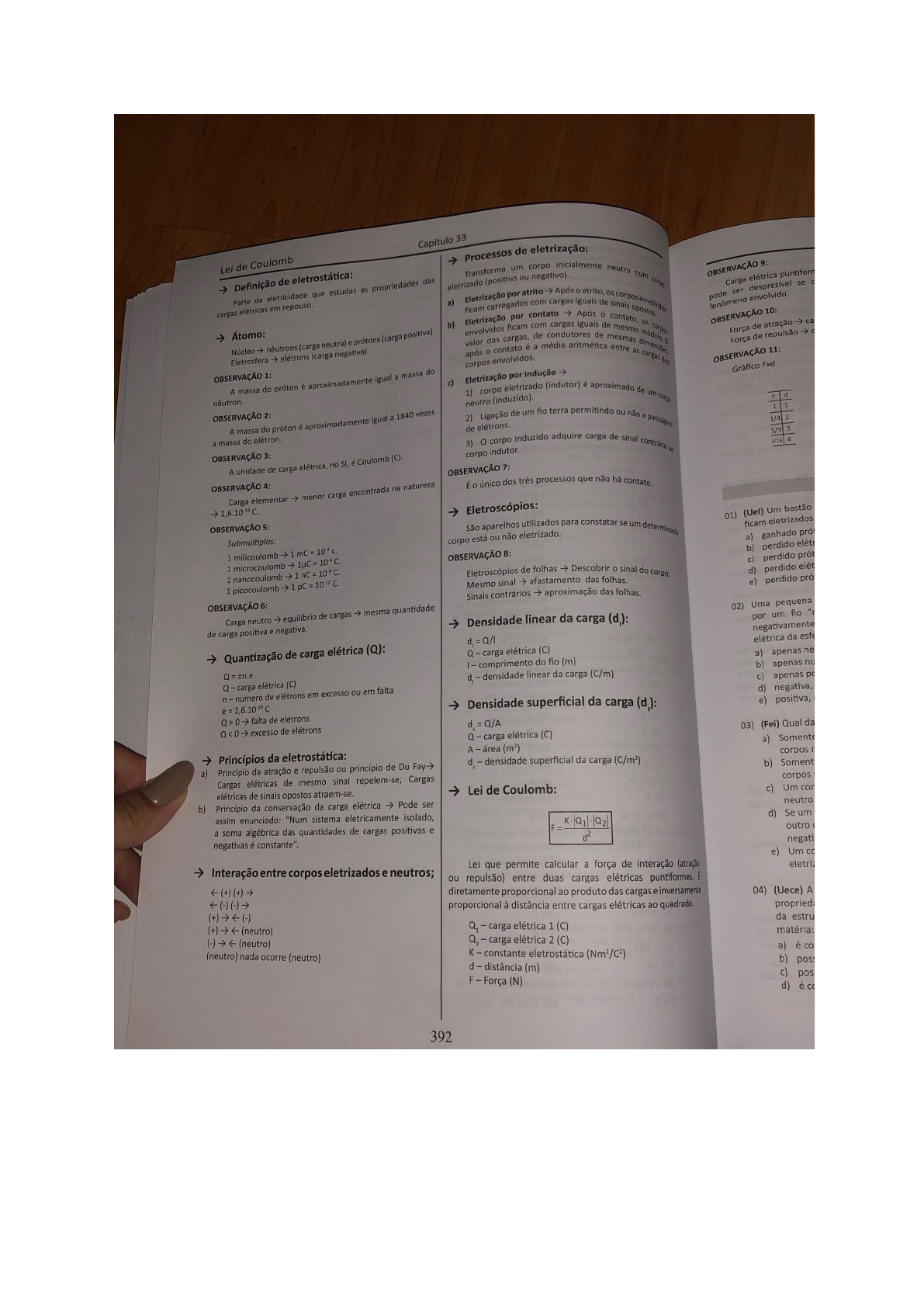 Lei de Coulomb Capítulo 33 Definição de eletrostática: Processos de Parte da eletricidade que estudas as propriedades das cargas elétricas em repouso. eletrizado Transforma (positivo um ou corpo negativo). inicialmente neutro Eletrização atrito num a) por corpo OBSERVAÇÃO 9: Átomo: ficam Eletrização carregados por contato com cargas iguais de sinais corpos Carga elétrica b) Núcleo nêutrons (carga neutra) e prótons (carga positiva). Após pode ser se envolvidos ficam com Eletrosfera elétrons (carga negativa). cargas fenômeno envolvido. iguais OBSERVAÇÃO 1: valor após das contato cargas, é de média condutores de de mesmas mesmo OBSERVAÇÃO 10: corpos envolvidos. a entre as Força de atração -> ca A massa do próton é aproximadamente igual a massa do Força de repulsão nêutron. c) Eletrização por indução OBSERVAÇÃO 11: OBSERVAÇÃO 2: 1) corpo eletrizado Gráfico Fxd neutro (induzido). A massa do próton é aproximadamente igual a 1840 vezes a massa do 2) Ligação de um fio terra d de elétrons. 1 1 OBSERVAÇÃO 3: 3) corpo o corpo indutor. induzido adquire de 1/4 2 A unidade de carga elétrica, no SI, é Coulomb 1/9 3 OBSERVAÇÃO 4: 1/16 4 OBSERVAÇÃO 7: Carga elementar menor carga encontrada na natureza É único dos três processos C. OBSERVAÇÃO 5: Eletroscópios: São está aparelhos não utilizados para 01) (Uel) Um bastão 1 milicoulomb corpo ou ficam eletrizados 1 microcoulomb C. OBSERVAÇÃO 8: a) ganhado prót 1 nanocoulomb b) perdido 1 picocoulomb Eletroscópios de folhas c) perdido prót Mesmo sinal afastamento das d) perdido elét OBSERVAÇÃO 6: Sinais contrários aproximação das e) perdido pró Carga neutro equilíbrio de cargas mesma quantidade de carga positiva e negativa. Densidade linear da carga (d): 02) Uma pequena por um fio Quantização de carga elétrica (Q): d, Q/I negativamente Q - carga elétrica (C) elétrica da esfe Q - comprimento do fio (m) a) apenas ne Q - carga elétrica (C) d, densidade linear da carga (C/m) b) apenas nu n número de elétrons em excesso ou em falta c) apenas d) negativa, falta de elétrons Densidade superficial da carga (d): e) positiva, Q - densidade superficial da carga corpos b) Soment Cargas elétricas de mesmo sinal repelem-se; Cargas corpos elétricas de sinais opostos atraem-se. Lei de Coulomb: c) Um cor b) Princípio da conservação da carga elétrica Pode ser neutro assim enunciado: "Num sistema eletricamente isolado, d) Se um a soma algébrica das quantidades de cargas positivas e F outro negativas é constante". negati e) Um Interação entre corpos eletrizados e neutros; Lei que permite calcular a força de interação (atração eletriz ou repulsão) entre duas cargas elétricas puntiformes. (+) (+) diretamente proporcional ao produto das cargas e inversamente 04) (Uece) A (-) (-) proporcional à distância entre cargas elétricas ao quadrado. proprieda (+) (-) da estru (+) (neutro) Q, - carga elétrica 1 (C) matéria: (-) (neutro) carga elétrica 2 (C) a) é (neutro) nada ocorre (neutro) K - constante eletrostática b) poss d distância (m) c) pos F Força (N) d) é 392Capítulo 33 Lei de Coulomb OBSERVAÇÃO 9: Carga elétrica puntiforme é aquela em que sua dimensão 05) Na figura a seguir, um bastão carregado pode ser desprezivel se comparada com as distâncias do positivamente é aproximado de uma pequena esfera fenômeno envolvido. metálica (M) que pende na extremidade de um fio de Observa-se que a esfera se afasta do bastão. OBSERVAÇÃO 10: Força de atração cargas de sinais opostas. Força de repulsão cargas de sinais OBSERVAÇÃO 11: Fxd M F(N) Nesta situação, pode-se afirmar que a esfera possui uma carga elétrica total: F d a) negativa 1 1 b) positiva 1/4 2 c) nula 1/9 3 d) positiva ou nula 1/16 4 e) negativa ou nula d(m) 06) (Uel) Dois corpos A e B, de materiais diferentes, inicialmente neutros, são atritados entre si, isolados de outros corpos. EXERCÍCIOS Após o atrito, a) ambos ficam eletrizados negativamente 01) (Uel) Um bastão isolante é atritado com tecido e ambos b) ambos ficam eletrizados positivamente ficam eletrizados. É correto afirmar que o bastão pode ter: c) um fica eletrizado negativamente e o outro continua neutro a) ganhado prótons e tecido ganhado elétrons b) perdido elétrons e tecido ganhado prótons d) um fica eletrizado positivamente e outro continua neutro c) perdido prótons e o tecido ganhado elétrons e) um fica eletrizado positivamente e o outro, d) perdido elétrons e o tecido ganhado elétrons negativamente e) perdido prótons e o tecido ganhado prótons 07) Três esferas condutoras idênticas e III têm, respectivamente, 02) Uma pequena esfera de isopor, aluminizada, suspensa as seguintes cargas elétricas: 4q, -2q e 3q. A esfera é por um fio "nylon", é atraída por um pente plástico colocada em contato com a esfera e, logo em seguida, é negativamente carregado. Pode-se afirmar que a carga encostada à esfera III. Pode-se afirmar que a carga final da elétrica da esfera é: esfera será: a) apenas negativa a) b) apenas nula b) 2q c) apenas positiva c) 3q d) negativa, ou então nula d) 4q e) positiva, ou então nula e) 5q 03) (Fei) Qual das afirmativas está correta? 08) Um aluno tem 4 esferas idênticas, pequenas e condutoras a) Somente corpos carregados positivamente atraem (A, B, e D), carregadas com cargas respectivamente iguais corpos neutros a -2Q, 4Q, 30 e 6Q. A esfera A é colocada em contato com a b) Somente corpos carregados negativamente atraem esfera B e a seguir com as esferas e D. Ao final do processo corpos neutros a esfera A estará carregada com carga equivalente a: c) Um corpo carregado pode atrair ou repelir um corpo a) 3Q b) 4Q neutro d) Se um corpo A eletrizado positivamente atrai um c) Q/2 outro corpo B, podemos afirmar que B está carregado d) 8Q e) negativamente e) Um corpo neutro pode ser atraído por um corpo 09) (UFV) Um sistema é constituído por um corpo de massa eletrizado M, carregado positiv