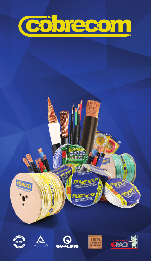 Fios e cabos elétricos TABELA TÉCNICA DO ELETRICISTA CABO FLEXICOM 750V 1,5 1,5 2,9 13,3 15,5 17,5 1/2 2,5 2,0 3,6 7,98 21,0 24,0 1/2 4,0 2,5 4,1 4,95 28,0 32,0 3/4 6,0 3,1 4,7 3,30 36,0 41,0 3/4 10,0 4,1 6,1 1,91 50,0 57,0 1 16,0 5,1 7,1 1,21 68,0 76,0 1 1/4 25,0 6,3 8,7 0,780 89,0 96,0 1 1/4 35,0 7,5 9,9 0,554 110,0 119,0 1 1/2 50,0 8,8 11,6 0,386 134,0 144,0 2 70,0 10,5 13,4 0,272 171,0 184,0 2 95,0 12,4 15,5 0,206 207,0 223,0 2 1/2 120,0 14,1 17,6 0,161 239,0 259,0 2 1/2 150,0 15,6 19,6 0,129 275,0 299,0 3 185,0 17,4 21,9 0,106 314,0 341,0 4 240,0 20,0 24,8 0,0801 370,0 403,0 4 300,0 22,5 27,6 0,0641 426,0 464,0 4 400,0 27,0 32,2 0,0486 510,0 557,0 5 500,0 30,2 35,8 0,0384 587,0 642,0 5 FIO PLASTICOM 750 V Seção Nominal Diâmetro Nominal Condutor Diâmetro Sobre Isolação Resistência Elétrica Máxima a 20°C Corrente Máxima p/ 3 Cond. em Eletroduto Corrente Máxima p/ 3 Cond. em Ar Livre Bitola dos Eletrodutos P/ 3 Cond. Isolados mm² mm mm ohm/km A A Polegada 0,50 0,80 2,0 36,00 6,0 6,5 ½ 0,75 0,98 2,2 24,50 9,0 10,0 ½ 1 1,13 2,3 18,10 12,0 13,5 ½ 1,5 1,38 2,8 12,10 15,5 17,5 ½ 2,5 1,78 3,4 7,41 21,0 24,0 ½ 4 2,24 3,8 4,61 28,0 32,0 ¾ 6 2,76 4,3 3,08 36,0 41,0 ¾ 10 3,57 5,5 1,83 50,0 57,0 1 16 4,50 6,4 1,15 68,0 76,0 1 ¼ Condutor Fase Condutor Proteção Condutor Neutro Seção Nominal Corrente Máxima mm² mm² mm² mm² A 1,5 1,5 1,5 1,5 22 2,5 2,5 2,5 2,5 29 4,0 4,0 4,0 4,0 37 6,0 6,0 6,0 6,0 46 10,0 10,0 10,0 10,0 61 16,0 16,0 16,0 16,0 79 25,0 16,0 25,0 25,0 101 35,0 16,0 25,0 35,0 122 50,0 25,0 25,0 50,0 144 70,0 35,0 35,0 70,0 178 95,0 50,0 50,0 95,0 211 120,0 70,0 70,0 120,0 240 150,0 95,0 70,0 150,0 271 185,0 95,0 95,0 185,0 304 240,0 120,0 120,0 240,0 351 300,0 150,0 150,0 300,0 396 400,0 185,0 185,0 400,0 464 FIOS PLASTICOM E CABOS FLEXICOM 450 / 750 V PVC 70°C ANTICHAMA NBR NM 247- 3 DA ABNT1 CABO GTEPROM FLEX HEPR 90ºC 0,6 /1 kV INSTALADO EM DUTOS DIRETAMENTE AO SOLO DIMENSIONAMENTO DO CONDUTOR PROTEÇÃO E NEUTRO2 Seção Nominal COS φ = 0,80 COS φ = 0,92 COS φ = 0,95 kW Monofásico Trifásico Monofásico Trifásico Monofásico Trifásico 1,5 23 20 27,6 23,9 27,0 23,7 2,5 14 12 16,9 14,7 17,0 14,3 4 8,7 7,5 10,6 9,15 10,2 8,82 6 5,8 5,1 7,07 6,14 6,75 6,00 10 3,5 3,0 4,23 3,67 4,07 3,48 16 2,3 2,0 2,67 2,31 2,60 2,24 25 1,5 1,3 1,71 1,49 1,66 1,43 35 1,1 0,95 1,25 1,09 1,19 1,06 50 0,83 0,72 0,94 0,82 0,88 0,78 70 0,61 0,53 0,67 0,59 0,62 0,57 95 0,47 0,41 0,50 0,44 0,46 0,42 120 0,39 0,34 0,41 0,36 0,37 0,35 150 0,34 0,30 0,34 0,30 0,31 0,29 185 0,30 0,26 0,29 0,25 0,26 0,25 240 0,25 0,22 0,24 0,21 0,21 0,20 300 0,23 0,20 0,20 0,18 0,19 0,18 Potência Nominal Sistema Monofásico Sistema Trifásico 1800 rpm kW cv 115 V 230 V 220 V 380 V 440 V 0,25 1/3 7,2 3,6 1,5 0,9 0,75 0,37 1/2 9,8 4,9 2,2 1,12 1,1 0,55 3/4 13,8 6,9 3,0 1,7 1,5 0,75 1 16 8 4,2 2,5 2,1 1,1 1,5 20 10 5,2 3,0 2,6 1,5 2 24 12 6,8 4,0 3,9 2,2 3 34 17 9,5 5,5 4,8 3,0 4 42 21 12 7,0 6,0 3,7 5 56 28 15 8,5 7,5 4,4 6 68 34 17 10 8,5 5,5 7,5 80 40 21 12 10,5 7,5 10 100 50 28 16 14 9,2 12,5 34 19 17 11 15 40 23 20 15 20 52 30 26 18,4 25 65 38 33 22 30 75 44 38 30 40 105 60 53 37 50 130 75 65 44 60 145 85 73 55 75 175 100 88 75 100 240 140 120 92 125 290 165 145 110 150 360 210 180 150 200 480 280 240 185 250 580 350 290 221 300 700 400 350 CORRENTES NOMINAIS DE MOTORES DE CORRENTE ALTERNADA AMPERES (A)3 QUEDA DE TENSÃO NAS INSTALAÇÕES V/A. Km CABOS FLEXICOM 450 / 750 V4 Para o cálculo de cv, utilizar a linha do HP substituindo o valor 746 por 736. I = Corrente em Amperes Ef = Tensão entre fase e neutro em V EL = Tensão entre duas fases em V E = Tensão entre positivo e negativo em V ∆V = Queda de tensão COS φ = Fator de potência da carga Q = Eficiência do motor S = Seção do condutor em mm² L = Comprimento de cabo em metros R = Resistência do circuito em ohm Dados Desejados Corrente Alternada Corrente ContínuaMonofásica Trifásica kV I Ef COS φ √3 I EL COS φ I E 1000 1000 1000 kVA I Ef √3 I EL I E 1000 1000 1000 HP I Ef QCOS φ √3 I EL QCOS φ I E Q 746 746 746 Corrente A kW x 1000 kW x 1000 kW x 1000 Ef COS φ √3 EL COS φ E Corrente A kVA x 1000 kVA x 1000 kVA x 1000 Ef √3 x EL E Queda de tensão ∆E 2 I L COS φ √3 I L COS φ R x I 56 x S 56 x S QUEDA DE TENSÃO NAS INSTALAÇÕES V/A.KM5 Série Métrica PVC 70°C NBR NM 247-3 Série AWG / MCM PVC 60°C EB 98 DA ABNT mm² Amperes AWG / MCM mm² Aprox. Amperes 0,5 6 20 0,517 9 0,75 9 18 0,823 11 1,0 12 16 1,309 13 1,5 15,5 14 2,08 16 2,5 21 12 3,31 22 4 28 10 5,26 35 6 36 8 8,36 50 10 50 6 13,29 62 16 68 4 21,14 70 25 89 2 33,73 90 35 111 1 42,40 110 50 134 1/0 53,49 130 - - 2/0 67,43 170 70 171 3/0 85,01 190 95 207 4/0 107,21 210 - - 250 127 225 120 239 300 152 250 150 272 - - - 185 310 400 203 300 - - 500 253 340 240 364 600 304 380 300 419,00 800 405 450 - - 1000 507 480 Multiplicar Por Para obter cv 0,736 kW kW 1,359 cv HP 1,014 cv cv 0,988 HP HP 0,746 kW kW 1,341 HP CONVERSÃO DE UNIDADE EQUIVALÊNCIA DE CONDUÇÃO DE CORRENTE NAS SÉRIES MÉTRICA x AWG6 7 Fale Conosco (11) 2118-3200 cobrecom@cobrecom.com.br cobrecom.com.br /cobrecom Seção Nominal mm² Classe Encor. Diâmetro do Condutor mm Espessura Diâmetro Externo mm Peso Líquido kg / 100 m Resistência Elétrica Máx. Ω/km A 20ºC Isolação Cobertura mm mm 1,5 C4 1,5 0,7 0,9 4,7 3,3 13,30 2,5 C4 1,9 0,7 0,9 5,1 4,4 7,98 4 C4 2,5 0,7 0,9 5,7 5,9 4,95 6 C4 3,0 0,7 0,9 6,2 7,9 3,30 10 C5 4,1 0,7 1,0 7,7 12,3 1,91 16 C5 5,1 0,7 1,0 8,6 17,8 1,21 25 C5 6,5 0,9 1,1 10,4 27,4 0,780 35 C5 7,3 0,9 1,1 11,3 36,1 0,554 50 C5 9,1 1,0 1,2 14,0 50,9 0,386 70 C5 10,8 1,1 1,2 15,4 68,5 0,272 95 C5 12,2 1,1 1,3 17,0 89,9 0,206 120 C5 14,0 1,2 1,3 19,0 113,0 0,161 150 C5 15,5 1,4 1,4 21,2 142,3 0,129 185 C5 17,4 1,6 1,4 23,4 171,2 0,106 240 C5 20,0 1,7 1,5 27,3 227,7 0,0801 300 C5 23,0 1,8 1,6 29,8 286,7 0,0641 400 C5 27,0 2,0 1,7 33,9 384,2 0,0486 500 C5 30,0 2,2 1,8 38,0 473,8 0,0384 2 x 1,5 C4 1,5 0,7 1,0 7,8 7,33 13,30 2 x 2,5 C4 1,9 0,7 1,0 8,6 8,08 7,98 