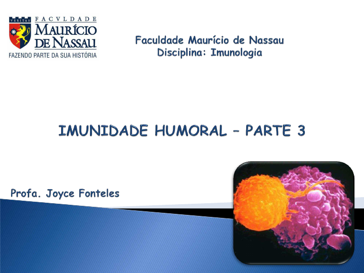 Características: É mediada por anticorpos Protege os espaços extracelulares Os anticorpos causam a neutralização dos patógenos e impedem a disseminação das infecções intracelulares Fases da resposta imune humoral: FASE 1: Reconhecimento do antígeno FASE 1: Reconhecimento do antígeno EPÍTOPO!! FASE 1: Reconhecimento do antígeno Epítopo = porção do antígeno que será reconhecido pela molécula de anticorpo. REGIÃO VARIÁVEL + EPÍTOPO = LIGAÇÃO ANTÍGENO-ANTICORPO FASE 2: Fase de ativação Sinais de ativação: 1˚ sinal de ativação Ligação do anticorpo ao antígeno (epítopo) 2˚ sinal de ativação Ligação de receptores do linfócito B ao fragmento C3d FASE 2: Fase de ativação Consequências da ativação Mecanismos de ativação dos linfócitos B Ativação dos linfócitos B dependentes de linfócitos T CD4 (se o antígeno for proteico) Ativação dos linfócitos B independentes de linfócitos T CD4 (se o antígeno não for proteico) Mecanismos de ativação dos linfócitos B mediado pelo linfócito T Isotipos de imunoglobulina: Troca de classe de cadeia pesada FASE 3: Mecanismos efetores dos anticorpos Classe de anticorpos Ig G (Imunoglobulina G) Imunidade neonatal: transferência de anticorpos maternos através da placenta Funções: - Neutralização de microrganismos e toxinas - Opsonização de antígenos para a fagocitose por macrófagos e neutrófilos - Citotoxicidade celular dependente de anticorpos mediada pelas células NK Classe de anticorpos Ig M (Imunoglobulina M) Função: Ativação da via clássica do complemento Ig A (Imunoglobulina A) Imunidade de mucosa: Secreção de IgA na luz do trato gastrointestinal e respiratório Função: Neutralização de microrganismos e toxinas. Classe de anticorpos Ig E (Imunoglobulina E) Defesa contra helmintos Degranulação de mastócitos (reações de hipersensibilidade imediata) Imunidade Ativa x Imunidade passiva Qual a diferença entre elas? Imunidade Ativa É induzida pela exposição a um antígeno estranho Infecção e/ou vacinação Imunidade passiva ◦ É induzida pela transferência de plasma ou soro contendo anticorpos • Transferência de anticorpos maternos para o feto e recém nascido – IgG via placenta – IgA via leite materno