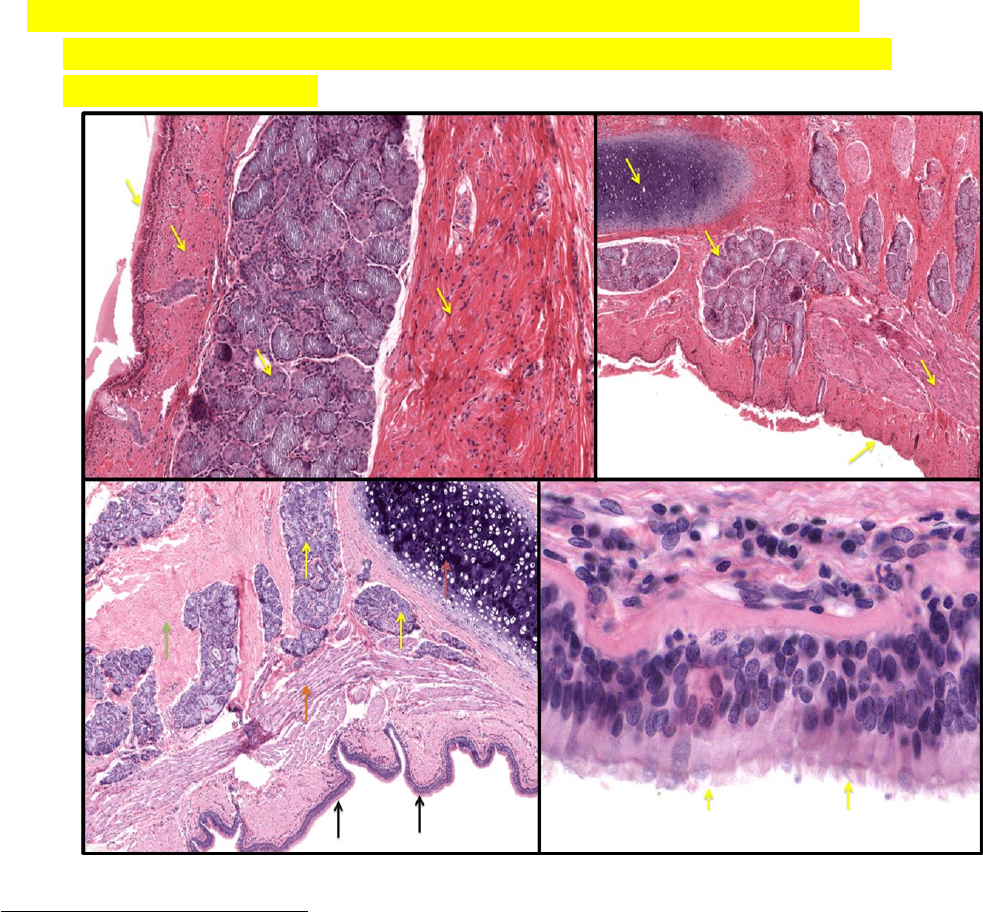 · Setas amarelas: Epitélio simples cúbico/cilíndrico sem células caliciformes nem cílios visíveis.
