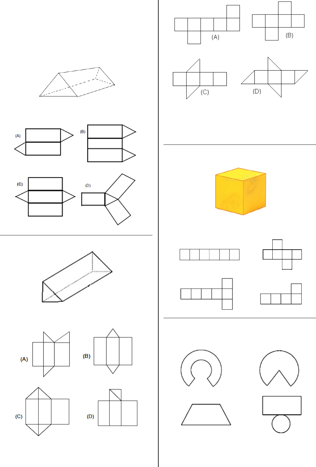 H23 – Identificar propriedades comuns e diferenças entre figuras bidimensionais e tridimensionais, relacionando-as com as suas planificações. (GI) 1. (Prova Brasil). É comum encontrar em acampamentos barracas com fundo e que têm a forma apresentada na figura abaixo. Qual desenho representa a planificação dessa barraca? 2. (Prova Brasil). O desenho abaixo representa um sólido. Qual é a planificação deste sólido. 3. Observe as figuras abaixo: Entre elas, a planificação de uma caixa em forma de cubo é a figura; (A) A (B) B (C) C (D) D 4. Uma embalagem tem o formato de um cubo, como mostra a figura abaixo: Uma possível planificação desta embalagem é: (A) (B) (C) (D) 5. A fazer um molde de um copo, em cartolina, na forma de cilindro de base circular qual deve ser a planificação do mesmo. (A) (B) (C) (D) 6. Observe a representação de um tetraedro regular. Qual das seguintes planificações é a desse tetraedro regular? (A) (B) (C) (D) 7. Glória quer fazer um molde para construir caixas sem tampa, em forma de bloco retangular. Como mostra a figura abaixo. Para obter o molde, ela desmontou a caixa. O desenho que representa essa caixa desmontada é: 8. (SPEACE). Observe o dado representado pela figura abaixo. Que planificação corresponde a esse dado? 9. (SPAECE). A figura abaixo representa um cubo em que as faces opostas têm o mesmo símbolo. A planificação correta desse cubo é: 10. Na aula de geometria, Letícia fez um molde para construir um poliedro, como mostra a figura abaixo. Qual poliedro Letícia poderá construir com esse molde? (A) Uma pirâmide. (B) Um paralelepípedo. (C) Uma esfera. (D) Um cubo. 11. (SPAECE). Observe, abaixo, a representação de um prisma e sua respectiva planificação, em que as faces estão numeradas. Nessa planificação, os pares de faces paralelas são (A) 1 e 2, 4 e 6, 5 e 8. (B) 1 e 2, 6 e 8, 7 e 4. (C) 2 e 3, 4 e 7, 5 e 8. (D) 3 e 6, 4 e 7, 5 e 8. Professor Rodolfo Melino – Matemática Fonte:– Blog DE Franca–Matemática –Link para blog do Prof. Warles Professor de Matemática Rodolfo Melino rodolfomelino.blogspot.com.br H23 – Identificar propriedades comuns e diferenças entre figuras bidimensionais e tridimensionais, relacionando-as com as suas planificações. (GI) 1. A figura abaixo representa a planificação de um sólido geométrico. Qual é esse sólido? A) Pirâmide da base hexagonal B) pirâmide de base triangular C) Prisma de base hexagonal D) Prisma de base triangular 2. Veja o prisma reto abaixo. A planificação desse prisma é A) B) C) D) 3. Observe esta figura: Para construir uma caixa fechada com a forma desse poliedro, Marina precisa recortar algumas figuras geométricas em papelão e colar umas às outras usando fita adesiva. Então, as figuras que Marina precisa recortar são, no mínimo, (A) 1 triângulo e 2 retângulos. (B) 1 triângulo e 3 retângulos. (C) 2 triângulos e 2 retângulos. (D) 2 triângulos e 3 retângulos. 4. (PB 2011). Uma empresa confecciona embalagens para acondicionar um determinado produto. Veja a planificação desta embalagem abaixo. A embalagem depois de pronta é 5. (PB 2011). Juliana fez algumas figuras planas em papel cartão, como mostra abaixo. Ao juntar todas essas partes forma o sólido chamado (A) cone (B) prisma (C) cilindro (D) pirâmide 6. (PB – 2011). Um dado (cubo) foi desmontado da seguinte forma: Qual das letras é oposta a letra T quando montar o dado (cubo). (A) P (B) R (C) V (D) U 7. (Saresp 2002). Observe os diferentes tipos de caixas utilizadas por uma loja de presentes: A vendedora monta de acordo com a escolha do cliente. Se ela utilizar os modelos que aparecem abaixo, vai obter caixas do tipo: (A) 4 e 1 (B) 3 e 4 (C) 2 e 3 (D) 1 e 2 8. (Saresp 2005). Abaixo estão desenhadas as vistas superior e frontal de uma figura. Dentre as opções abaixo, a única figura com essas vistas é: 9. (Saresp 2005). Bia montou a figura ao lado e, em seguida, fez uma colagem para obter um sólido de papelão. O sólido que Bia obteve foi: 10. (Saresp 2007). Melissa fez uma caixinha para guardar seus brincos. A planificação da caixinha está representada na figura abaixo. Como ficou a caixinha de Melissa depois de colada? 11. (SIMAVE). Veja a planificação do poliedro abaixo. Quantas arestas esse poliedro possui? (A) 5 (B) 7 (C) 8 (D) 12 Professor Rodolfo Melino – Matemática Fonte:– Blog DE Franca–Matemática –Link para blog do Prof. Warles image3.png image4.png image5.png image6.png image7.png image8.png image9.png image10.png image11.png image12.png image13.png image14.png image15.png image16.png image17.png image18.png image19.png image20.png image21.png image22.png image23.png image24.png image25.png image26.png image27.png image28.png image29.png image30.png image31.png image32.png image33.jpeg image34.png image35.png image36.png image37.png image38.png image39.png image40.png image41.png image42.png image43.png image44.png image45.png image46.png image47.png image48.png image49.png image50.png image51.png image52.png image53.png image54.png image55.png image1.png image2.png