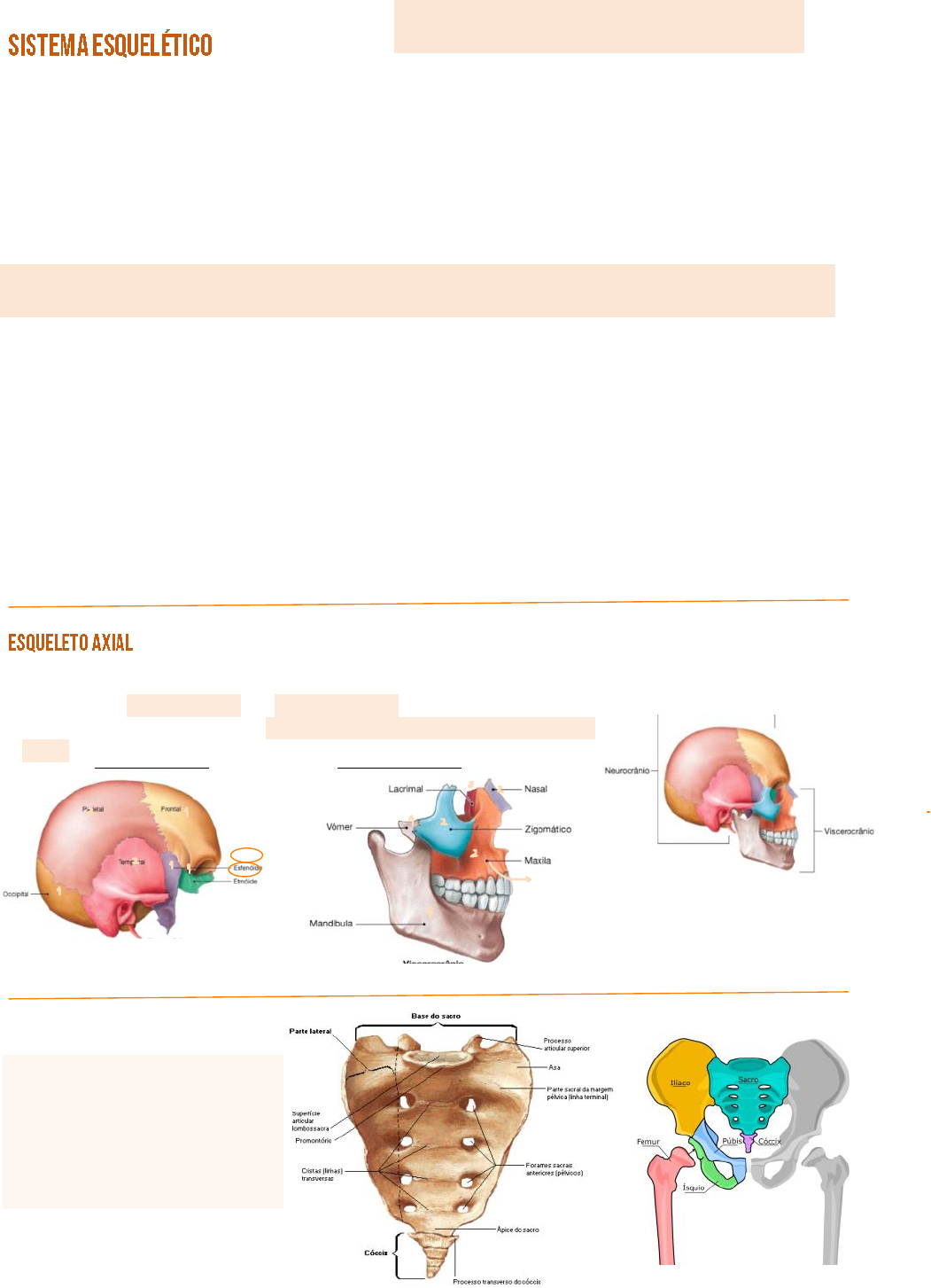 FUNÇÕES Proteção, sustentação, armazenamento de minerais e é o local de produção dos elementos sanguíneos. Sofre ação direta dos demais sistemas - circulatório, digestivo, nervoso, endócrino. DIVISÃO DO ESQUELETO Esqueleto Axial: crânio, hioide, ossículos da audição, coluna vertebral e tórax. Esqueleto Apendicular: cíngulo dos membros superiores e inferiores e membros inferiores e superiores. CÍNGULO: faz a união entre os dois tipos de esqueleto; nos membros superiores é a clavícula e espátula e nos inferiores o quadril. Número de ossos: 206 CLASSIFICAÇÃO DOS OSSOS OSSO LONGO Comprimento bem maior do que a largura e espessura. Epífase (ponta do osso) e diáfase (corpo do osso). OSSO PLANO Comprimento e largura equivalentes - predominando sobre a espessura. OSSO CURTO 3 dimensões equivalentes. OSSO IRREGULAR Formas geométricas desconhecidas. OSSO PNEUMÁTICO Uma ou mais cavidades de volume variável, revestidas de mucosa e com ar. Situados no crânio: frontal, maxilar, temporal, etmoide e esfenoide. OSSO SESAMÓIDES Na substância de certos tendões. EX: patela. ACIDENTE ÓSSEO: aspectos estruturais adaptados para funções específicas (depressões e aberturas). CRÂNIO Composto pelo NEUROCRÂNIO E O VISCEROCRÂNIO. Também possui ossos associados: ossículos da audição (dentro dos temporais) e hioide. NEUROCRÂNIO VISCEROCRÂNIO Palatino: fica abaixo da maxila. COLUNA VERTEBRAL SACRO E COCCIX Formado por junções de vértebras. Repleto de acidentes ósseos. ESQUELÉTICO Página 1 de ANA011 ESQUELÉTICO COLUNA VERTEBRAL 7 vértebras cervicais, 12 vértebras torácicas e 5 vértebras lombares. Sacro e cóccix. PARTES COMUNS ÀS VÉRTEBRAS PRIMÁRIA: curvatura para fora SECUNDÁRIA: curvatura para dentro. REGIÃO CERVICAL *Processo transverso *Extremidade bífida ATLAS - vértebra C1 ÁXIS - vértebra C2 AXIS E ATLAS São diferentes Não possuem corpo vertebral. O dente do áxis se liga ao tubérculo anterior do atlas, permitindo o movimento de "não" da cabeça. *Forame vertebral e transversário. *Dente do áxis e forame vertebral REGIÃO TORÁCICA REGIÃO LOMBAR O processo espinhoso se torna mais quadricular. O corpo vertebral é mais espesso para aguentar o peso. Página 1 de ANA011 ESQUELÉTICO ESTERNO E COSTELAS As costelas se relacionam anteriormente ao esterno e posteriormente à coluna vertebral. ESQUELETO apendicular PROCESSO XIFÓIDE CÍNGULO DO MEMBRO SUPERIOR ÚMERO - BRAÇO RÁDIO E ULNA - ANTEBRAÇO O rádio está lateralmente e a ulna medialmente. O olecrano é o ossinho na ponta do cotovelo - faz parte da ulna. OSSOS DA MÃO Página 2 de ANA011 ESQUELÉTICO CÍNGULO DO MEMBRO SUPERIOR Se articulam anteriormente entre si na sínfise púbica e posteriormente com o sacro. FÊMUR - COXA (PERNA) FÍBULA E TÍBIA - PERNA Tíbia é medial e a fíbula lateral. Maléolo lateral e medial: ossos do tornozelo. PATELA Formar a articulação do joelho. Com acidentes ósseos para fixação de ligamentos. Acetábulo: encaixa a cabeça do fêmur Sínfise púbica TÍBIAFÍBULA OSSOS DO PÉ Ossos do tornozelo: tarsais e calcâneo (mais forte). Página 3 de ANA011