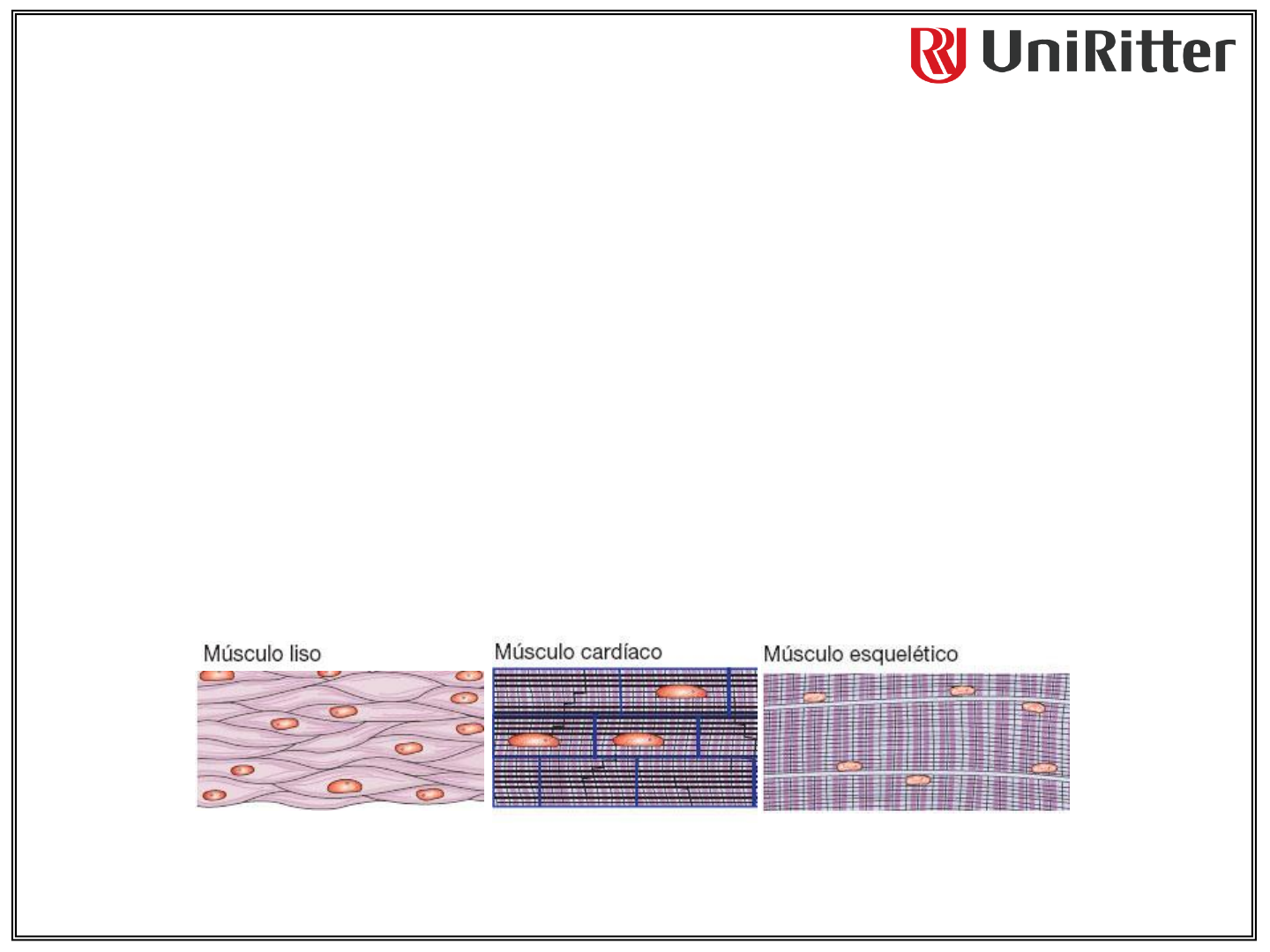 TECIDO MUSCULAR Prof. Ana Carolina Coelho ana.c.coelho@animaeducacao.com.br Porto Alegre, 2025 JUNQUEIRA, L. C.; CARNEIRO, J. Histologia básica: texto e atlas. 12.ed. INTRODUÇÃO Responsável pelo movimento do esqueleto e de órgãos como o globo ocular e a língua; Componente de vísceras e de vasos sanguíneos; Contratilidade rítmica do coração; Células que compõem o tecido muscular são alongadas fibras musculares. INTRODUÇÃO Componentes das células musculares recebem nomes especiais: Membrana celular sarcolema; Citosol sarcoplasma; Retículo endoplasmático liso retículo sarcoplasmático; INTRODUÇÃO Corpo Animal I TIPOS DE TECIDO MUSCULAR Tecido muscular estriado esquelético contração voluntária; constitui a musculatura do corpo ligada aos ossos, orbicular dos olhos e outros; Tecido muscular estriado cardíaco contração involuntária, vigorosa e rítmica compõe o músculo do coração (miocárdio); Tecido muscular liso contração involuntária, constitui a musculatura das vísceras e das paredes dos vasos sanguíneos. Fibras são longas células em forma de cilindros; Células são multinucleadas núcleos periféricos sarcolema. Fibras em corte longitudinal Fibras em corte transversal TECIDO MUSCULAR ESTRIADO ESQUELÉTICO Organização do músculo esquelético Fibras organizadas em grupos de feixes; Conjunto de feixes envolvidos por tec. conj. denso ñ mod. epimísio; Recobre o músculo inteiro; Epimísio septos separando o feixe/fascículo perimísio; Envolve feixes/fascículo de fibras; Cada célula muscular/fibra envolvida pelo endomísio. TECIDO MUSCULAR ESTRIADO ESQUELÉTICO Fibra muscular endomísio perimísio Organização das fibras musculares Estriações transversais; Faixa escura banda A (actina + miosina)banda H faixa clara ao centro da banda A); Faixa clara banda H e I não há sobreposição miosina e actina; No centro da banda I linha transversal escura linha Z; Sarcômeros entre duas linhas Z; Estriações miofibrila repetições sarcômero. TECIDO MUSCULAR ESTRIADO ESQUELÉTICO Faixa escura Banda A Faixa escura Banda A SARCÔMERO Faixa claraFaixa claraFaixa clara Organização das fibras musculares Miofibrilas contêm 4 proteínas principais; Miosina, actina, tropomiosina e troponina; Da linha Z para banda H filamentos finos actina; Filamentos grossosmiosiona região central sarcômero; TECIDO MUSCULAR ESTRIADO ESQUELÉTICO Banda Hmiosina; Região central banda H linha M creatinoquinase Fibras musculares estriadas cardíacas forma de curtos cilindros; Cortes longitudinais seu citoplasma mostra estriação transversal (bandas); TECIDO MUSCULAR ESTRIADO CARDÍACO Cada fibra tem um ou eventualmente dois núcleos situados no centro da fibra; Estrutura característica das fibras musculares cardíacas discos intercalares situados nas membranas celulares e que indicam os limites das fibras. TECIDO MUSCULAR ESTRIADO CARDÍACO Fibras em corte longitudinal Fibras em corte transversal Fibras musculares lisas células fusiformes; Fibras musculares lisas delgada; TECIDO MUSCULAR LISO Núcleos ocupam posição central na célula; Não apresenta estriações transversais; Tubo digestório; Ducto biliar; Sistema circulatório; Aréola mamária; Glândulas (próstata, vesícula seminal); Sistema geniturinário; Bolsa escrotal; Útero; Íris e corpo ciliar; Músculo erector pilli. TECIDO MUSCULAR LISO Fibras em corte longitudinal TECIDO MUSCULAR LISO TECIDO MUSCULAR LISO Bibliografia ana.c.coelho@animaeducacao.com.br “Seja você a mudança que tanto procura nos outros. As pessoas não mudam por cobranças, mudam com exemplos e pelo que vale a pena”. RaZ.