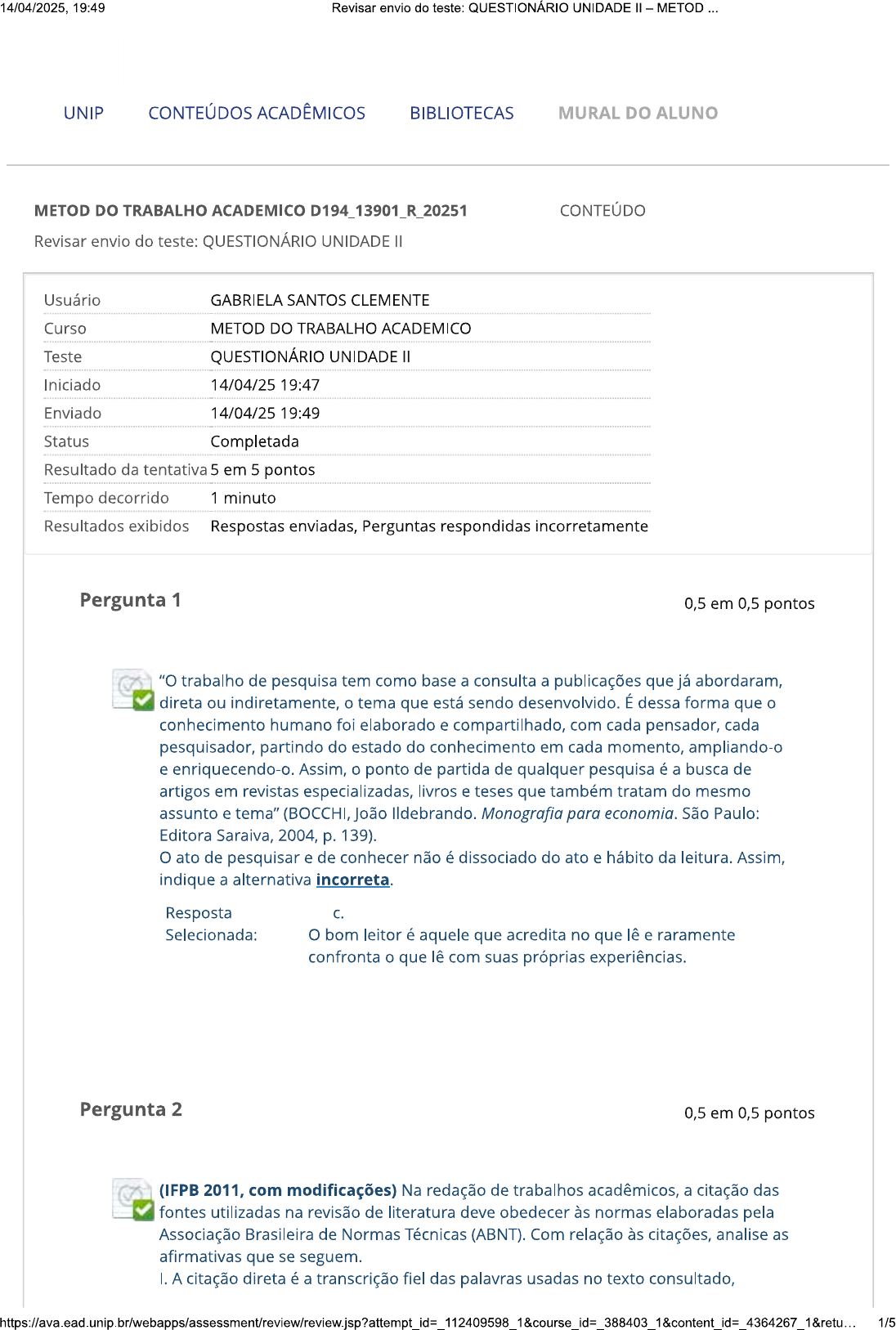 14/04/2025, 19:49 Revisar envio do teste: QUESTIONÁRIO UNIDADE - METOD UNIP CONTEÚDOS ACADÊMICOS BIBLIOTECAS MURAL DO ALUNO METOD DO TRABALHO ACADEMICO CONTEÚDO Revisar envio do teste: QUESTIONÁRIO UNIDADE Usuário GABRIELA SANTOS CLEMENTE Curso METOD DO TRABALHO ACADEMICO Teste QUESTIONÁRIO UNIDADE Iniciado 14/04/25 19:47 Enviado 14/04/25 19:49 Status Completada Resultado da tentativa 5 em 5 pontos Tempo decorrido 1 minuto Resultados exibidos Respostas enviadas, Perguntas respondidas incorretamente Pergunta 1 0,5 em 0,5 pontos "O trabalho de pesquisa tem como base a consulta a publicações que já abordaram, direta ou indiretamente, o tema que está sendo desenvolvido. É dessa forma que o conhecimento humano foi elaborado e compartilhado, com cada pensador, cada pesquisador, partindo do estado do conhecimento em cada momento, ampliando-o e enriquecendo-o. Assim, o ponto de partida de qualquer pesquisa é a busca de artigos em revistas especializadas, livros e teses que também tratam do mesmo assunto e tema" (BOCCHI, João Ildebrando. Monografia para economia. São Paulo: Editora Saraiva, 2004, p. 139). O ato de pesquisar e de conhecer não é dissociado do ato e hábito da leitura. Assim, indique a alternativa incorreta. Resposta C. Selecionada: O bom leitor é aquele que acredita no que lê e raramente confronta o que lê com suas próprias experiências. Pergunta 2 0,5 em 0,5 pontos (IFPB 2011, com modificações) Na redação de trabalhos acadêmicos, a citação das fontes utilizadas na revisão de literatura deve obedecer às normas elaboradas pela Associação Brasileira de Normas Técnicas (ABNT). Com relação às citações, analise as afirmativas que se seguem. I. A citação direta é a transcrição fiel das palavras usadas no texto consultado, 1/514/04/2025, 19:49 Revisar envio do teste: QUESTIONÁRIO UNIDADE METOD ... portanto, sem alteração por parte de quem elabora o trabalho acadêmico. II. A citação direta com mais de três linhas deve ser usada com recuo de 2 cm da margem esquerda, com aspas e com fonte igual a do texto. III. A citação direta com até três linhas deve ser usada no texto corrido, entre aspas e com a mesma fonte do texto. Estão corretas apenas as afirmativas: Resposta Selecionada: b. e III apenas. Pergunta 3 0,5 em 0,5 pontos A respeito da prática de plágio acadêmico, considere as afirmativas a seguir I. O plágio acadêmico envolve toda citação literal de texto de outros autores, independentemente de esses autores estarem ou não referenciados no trabalho do aluno. II. O plágio acadêmico envolve apenas uso de ideias de outros autores, mesmo que referenciadas. III. O plágio acadêmico envolve a ausência de referência ao texto e à ideia de outro autor. Está correto apenas o que se afirma em: Resposta Selecionada: C. III. Pergunta 4 0,5 em 0,5 pontos Com relação à intertextualidade no texto acadêmico, considere as afirmativas a seguir: I. As citações diretas são trechos escritos por outros autores e que são utilizados integralmente, palavra por palavra, pelo aluno. II. As citações indiretas são realizadas quando o aluno pretende melhorar o texto de outro autor, introduzindo ideias e palavras novas. III. As citações indiretas devem sempre fazer uso de aspas, para que fique claro que as ideias ali citadas não são da autoria do aluno Está correto apenas o que se afirma em: Resposta Selecionada: a. I. Pergunta 5 0,5 em 0,5 pontos14/04/2025, 19:49 Revisar envio do teste: QUESTIONÁRIO UNIDADE METOD Conforme João Ildebrando Bocchi (Monografia para economia. São Paulo: Editora Saraiva, 2004), "método designa um caminho pelo qual se obtém certo resultado. Pode designar também um conjunto de procedimentos e de regras utilizadas para atingir um objetivo desejado". (p. 54). Se o objetivo for o de efetuar a redação de um texto acadêmico: I. É preciso expressar-se, necessariamente, de forma racional e lógica. II. É imprescindível a realização de um rascunho para, apenas depois das correções e reflexões, elaborar o texto final. III. Na falta de palavras para expressar a lógica da comunicação, devem ser utilizadas ilustrações como substituição ao texto. Está correto apenas o que se afirma em: Resposta Selecionada: a. II. Pergunta 6 0,5 em 0,5 pontos Considerando as condições do fazer científico, é importante lembrar que: Resposta a. Selecionada: A curiosidade faz parte da pesquisa, pois estimula o olhar crítico sobre a realidade e a elaboração de perguntas sobre o mundo que nos cerca. Pergunta 7 0,5 em 0,5 pontos Leia o trecho de João Baptista de Almeida Júnior, "O estudo como forma de pesquisa" (in CARVALHO, Maria Cecília M. Metodologia científica: fundamentos e técnicas. Campinas: Editora Papirus, 2000). "Para se iniciar nos estudos superiores e obter um reconhecimento acadêmico, o estudante deve estudar primeiro como aprender. Isto porque as mudanças ocorridas recentemente na sociedade e nas formas de relacionamento humano geraram novas necessidades para as quais a educação é solicitada a atender. [...] Dentro dessa perspectiva educacional, o estudo aparece para o aluno como forma de pesquisa, apresentado comumente por diversos autores nas modalidades de pesquisa bibliográfica e documentação" (pp. 97-99). Com base no exposto, avalie as assertivas e responda ao solicitado: I. A pesquisa deve estudar aquilo que já foi investigado anteriormente, já que não é função da ciência pesquisar aquilo que nunca foi objeto de estudos anteriores. II. A pesquisa científica é uma investigação metódica acerca de um assunto determinado, e é realizada com o objetivo de esclarecer aspectos do objeto em estudo. III. Toda pesquisa requer método, entendido como procedimento de investigação e controle que se adota para o desenvolvimento rápido e eficiente de uma atividade qualquer. IV. Estudar como aprender auxilia o estudante universitário a desenvolver com 3/514/04/2025, 19:49 Revis