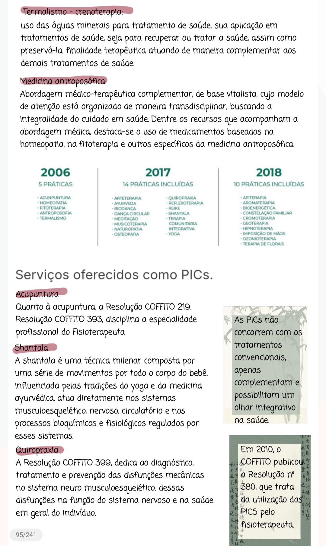 Termalismo - uso das águas minerais para tratamento de sua aplicação em tratamentos de seja para recuperar ou tratar a saúde, assim como preservá-la finalidade terapêutica atuando de maneira complementar aos demais tratamentos de Medicina Abordagem médico-terapêutica de base vitalista, cujo modelo de atenção está organizado de maneira buscando a integralidade do cuidado em Dentre OS recursos que acompanham a abordagem médica, destaca-se 0 uso de medicamentos baseados na homeopatia. na fitoterapia e outros específicos da medicina antroposófica. 2006 2017 2018 5 PRÁTICAS 14 PRÁTICAS INCLUÍDAS 10 PRÁTICAS INCLUÍDAS ACUNPUNTURA ARTETERAPIA QUIROPRAXIA APITERAPIA HOMEOPATIA AYURVEDA REFLEXOTERAPIA AROMATERAPIA FITOTERAPIA BIODANÇA REIKE ANTROPOSOFIA DANÇA SHANTALA CONSTELAÇÃO FAMILIAR TERMALISMO MEDITAÇÃO TERAPIA CROMOTERAPIA MUSICOTERAPIA COMUNITÁRIA GEOTERAPIA NATUROPATIA INTEGRATIVA HIPNOTERAPIA OSTEOPATIA YOGA IMPOSIÇÃO DE MÃOS OZONIOTERAPIA TERAPIA DE FLORAIS Serviços oferecidos como PICs. Acupuntura Quanto à acupuntura, a Resolução COFFITO 219. Resolução COFFITO 393, disciplina a especialidade As PICs não profissional do Fisioterapeuta concorrem com os Shantala tratamentos A shantala é uma técnica milenar composta por convencionais, uma série de movimentos por todo corpo do bebê. apenas influenciada pelas tradições do yoga e da medicina complementam e ayurvédica. atua diretamente nos sistemas possibilitam um nervoso, circulatório e nos olhar integrativo processos e fisiológicos regulados por na saúde. esses sistemas. Quiropraxia Em 2010, A Resolução COFFITO 399, dedica ao diagnóstico. COFFITO tratamento e prevenção das disfunções mecânicas a Resolução n° no sistema neuro musculoesquelético. dessas 380, que trata disfunções na função do sistema nervoso e na saúde da utilização das em geral do indivíduo. PICS pelo fisioterapeuta. 95/241