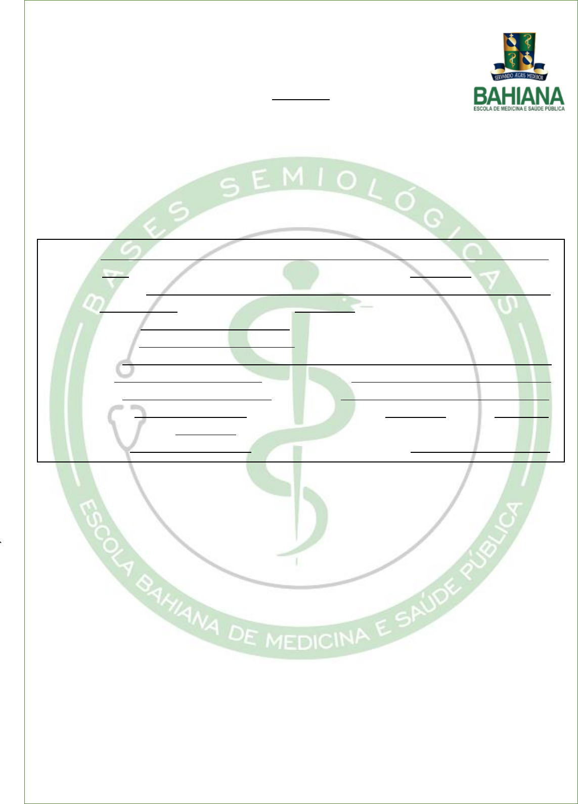 MONITORIA DE BASES SEMIOLÓGICAS - ESCOLA BAHIANA DE MEDICINA E SAÚDE PÚBLICA Monitoria de Bases Semiológicas Roteiro de Estudo Anamnese 1. IDENTIFICAÇÃO (ID): ▪ Por meio dela, realizamos um perfil sociodemográfico do paciente, o que nos possibilita a interpretação dos dados individuais e coletivos. Um dos seus objetivos é iniciar o relacionamento com o paciente, de forma que se inicie um processo de comunicação em nível afetivo e se estabeleça um vínculo de confiança. Os itens a serem perguntados estão citados no exemplo a seguir. 2. QUEIXA PRINCIPAL (QP) ▪ Corresponde ao que levou o paciente a procurar o médico. Anote a queixa principal e a duração da mesma, de forma objetiva, se utilizando das palavras utilizadas pelo paciente para descrevê- la. Ex: “Dor de cabeça há 2 horas”. 3. HISTÓRIA DA MOLÉSTIA ATUAL (HMA) ▪ É um registro cronológico do “sintoma guia”, relacionado com a queixa principal, de forma detalhada do motivo que levou o paciente a procurar a assistência médica desde o seu início até a data atual. ▪ Cada sintoma principal deve ser bem caracterizado e deve incluir os sete atributos de um sintoma: - (1) Localização. - (2) Características. - (3) Quantidade ou intensidade. - (4) Cronologia, inclusive início, duração e frequência. - (5) Situação em que ocorre (cenário em que se desenvolveu). - (6) Fatores que agravam ou aliviam o sintoma. Nome: João da Silva Santos . Idade: 22 anos. Data de Nascimento: 01/01/1997 Nome da mãe: Maria da Silva Santos . Sexo: Masculino . Cor/etnia: Negro . Naturalidade: Salvador . Procedência: Salvador . Endereço: Avenida Dom João VI, 275 – Brotas, Salvador/BA . Religião: Agnóstico . Escolaridade: Ensino Médio Completo . Profissão: Estudante . Ocupação: Estudante e Motorista de Uber . Estado civil: Solteiro . Data da observação: 29/07/2019 Hora: 7:38 . Data de Internação: 29/07/2019 Informante: Paciente e Mãe . Qualidade da informação: Boa . MONITORIA DE BASES SEMIOLÓGICAS - ESCOLA BAHIANA DE MEDICINA E SAÚDE PÚBLICA - (7) Manifestações associadas. ▪ Não deve contar todos os sintomas que o paciente apresenta em todos os sistemas, apenas aqueles que possivelmente podem estar associados ao sintoma-guia e ao(s) sistema(s) ao(s) qual(is) pertence. ▪ Os sintomas não relacionados ao sintoma-guia deverão ser relatados e explorados adequadamente no Interrogatório Sistemático. ▪ Deixar o paciente relatar com as próprias palavras e expressões os sintomas do qual se queixa. O médico posteriormente deve organizar os dados e, quando possível, adequar ao vocabulário médico. ▪ Uso do SIC (Segundo informação colhidas): as expressões que contenham um significado importante poderão ser colocadas entre aspas ou seguidas do termo latino, colocado entre parêntesis. ▪ Poderá ser referido os tratamentos já executados relacionados com a doença atual. 4. INTERROGATÓRIO SISTEMÁTICO (IS) ▪ Documenta a existência ou ausência de sintomas comuns, atuais ou consideravelmente recentes ou frequentes, relacionados com cada um dos principais sistemas corporais. ▪ É importante uma vez que permite que o médico/estudante levante possibilidades e reconheça enfermidades que não guardam relação com o quadro sintomatológico registrado na HMA. ▪ O entrevistador deverá registrar se o paciente nega ou refere os sintomas citados abaixo, referentes a cada um dos possíveis sistemas. Todo sintoma referido pelo paciente deverá ser devidamente explorado e descrito. (OBS1: Cada paciente pode exigir uma conduta específica do médico, dessa forma, os Antecedentes podem vir antes do Interrogatório Sistemático para um melhor raciocínio médico. Alguns autores também referem que ele pode estar presente após a HPS). (OBS2: Deverá conter apenas informações referidas pelo paciente, isto é, sintomas. Aquelas identificadas pelo examinador (sinais) deverão constar no Exame Físico.) 4.1 Geral: Mudanças recentes de peso (anotar em quanto tempo se deu a mudança), sensação de mal-estar, adinamia, fraqueza, fadiga, febre, sudorese e calafrios. 4.2 Pele e fâneros: Mudanças de coloração (palidez, cianose, eritema, entre outros), surgimento ou mudanças nas características de lesões (manchas, nevos, nódulos, erupções, feridas, entre outros), prurido, ressecamento, descamação, alterações em pelos, cabelo ou unhas. 4.3 Segmento Cefálico: - Cabeça: Cefaleia, abaulamentos, retrações, tumorações, lesões, descamação e tontura. - Olhos: Acuidade visual, uso de óculos ou lente de contato, dor, fotofobia, hiperemia conjuntival, lacrimejamento excessivo, icterícia, diplopia, hemianopsia, escotomas, pontos, flocos ou luzes piscantes, glaucoma e catarata. - Ouvidos: Acuidade auditiva, otalgia, otorragia, zumbido, secreções. Se houver redução da audição, se faz uso ou não de prótese auditiva. MONITORIA DE BASES SEMIOLÓGICAS - ESCOLA BAHIANA DE MEDICINA E SAÚDE PÚBLICA - Nariz e seios da face: Acuidade olfativa, congestão, secreção ou prurido nasal, rinite alérgica, epistaxe e condições relacionadas com os seios da face. - Boca e Garganta: condição dos dentes e gengivas, uso de prótese dentária, sialorreia, halitose, gengivorragia, dor na língua, dor de garganta, odinofagia, disfagia, rouquidão, pigarro. - Pescoço: Abaulamentos, retrações, tumorações, bócio, dor, rigidez, hiperemia, hipertermia, estase de jugulares e linfonodomegalias. 4.4 Mamas: Nódulos, lesões, desconforto, dor, secreção mamilar e práticas de autoexame. 4.5 Aparelho Respiratório (AR): Dispneia, sibilos, tosse, características da expectoração (cor, volume, consistência, odor, presença de sangue), dor pleurítica (ao inspirar), última radiografia de tórax. 4.6 Aparelho Cardiovascular (ACV): Dor ou desconforto torácico, palpitações, dispneia, ortopneia, dispneia paroxística noturna, edema, síncope. 4.7 Gastrintestinais: Hiporexia, anorexia, polifagia, 