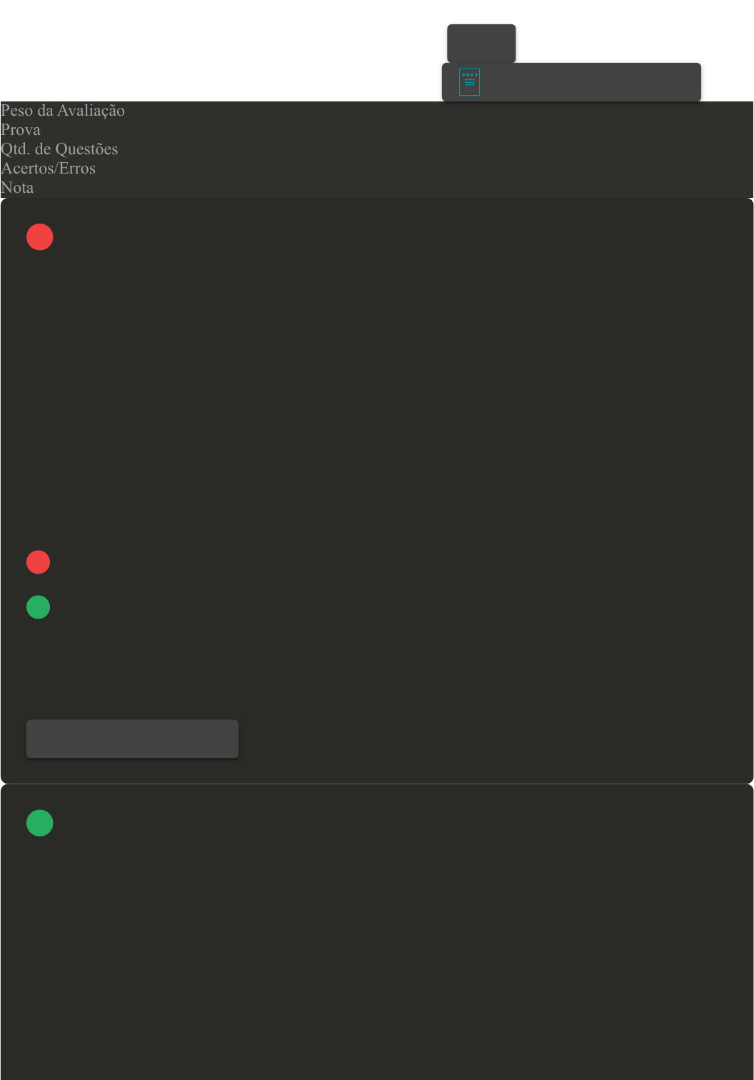 Prova Impressa GABARITO | Avaliação Final (Objetiva) - Individual (Cod.:1024548) Peso da Avaliação 4,00 Prova 94698909 Qtd. de Questões 10 Acertos/Erros 5/5 Nota 5,00 O T. pallidum é um patógeno que tem como hospedeiro apenas os seres humanos e a via de transmissão ocorre principalmente por contato sexual, porém também pode ser transmitido por transmissão vertical. Com base no exposto, avalie as asserções a seguir e a relação proposta entre elas: I- Na sífilis terciária, o paciente apresenta um processo inflamatório acompanhado da destruição de tecido ósseo, estabelecimento da sífilis cardiovascular, neurossífilis é considerado o estágio mais grave. PORQUE II- Se o paciente não identificou e tratou a infecção no estágio de sífilis primário ou secundária, a doença entra num estágio de latência onde as manifestações clínicas cessam e podem voltar a se manifestar após dez anos da infecção. Assinale a alternativa CORRETA: A As asserções I e II são proposições verdadeiras, mas a II não é uma justificativa da I. B As asserções I e II são proposições verdadeiras, e a II é uma justificativa da I. C A asserção I é uma proposição falsa, e a II é uma proposição verdadeira. D As asserções I e II são proposições falsas. [Laboratório Virtual - ELISA para detecção de doenças virais (HIV)] As estratégias de testagem em laboratório têm o objetivo de melhorar a qualidade do diagnóstico da infecção recente pelo HIV e, ao mesmo tempo, fornecer uma base racional para assegurar que o diagnóstico seja seguro e concluído em tempo hábil. Com relação à utilização do ELISA (3ª geração) para diagnóstico do HIV, assinale a alternativa CORRETA: A Ao final do experimento, a placa é lida por citometria de fluxo. VOLTAR A+ Alterar modo de visualização 1 Revisar Conteúdo do Livro 2 B Não é necessária a obtenção do cut-off para interpretação do resultado obtido. C A adição do conjugado ocorre após a adição da amostra na placa, incubação e lavagem dela. D Amostras com valores de absorbância menores do que o do cut-off são consideradas reagentes. Na Sífilis, conforme a evolução da doença, temos a realização de testes imunológicos para auxiliar no diagnóstico. Com base no exposto, associe os itens, utilizando o código a seguir: I- Ensaios treponêmicos. II- Ensaios não treponêmicos. ( ) Detectam anticorpos não específicos para o T. pallidum. ( ) Possibilitam a avaliação da resposta ao tratamento da sífilis. ( ) Dentre esses ensaios o FTA-Abs é consideram ensaio padrão ouro para diagnóstico da Sífilis. ( ) Detectam a presença de anticorpos antitreponêmicos. Assinale a alternativa que apresenta a sequência CORRETA: A I - I - II - II. B I - II - II - I. C II - II - I - I. D II - I - II - I. Você foi é um biomédico responsável para organizar uma ação para avaliação e orientação de trabalhadores de uma determinada indústria onde serão realizados testes para HIV. Você escolhe utilizar o protocolo com um teste rápido utilizando fluido oral seguido por um teste rápido utilizando sangue. De acordo com o fluxo escolhido, classifique V para as sentenças verdadeiras e F para as falsas: ( ) A primeira amostra coletada é a saliva, caso o teste for validado e positivo devo coletar o sangue do paciente por punção digital. ( ) Paciente é positivo para HIV quando apresenta os dois testes reagentes. ( ) Amostras reagentes para HIV não necessitam ser notificadas vigilância sanitária em ações fora do ambiente laboratorial. ( ) Caso ocorram divergências nos resultados dos dois testes do fluxograma o mesmo deve ser refeito, se a divergência se manter, deve coletar amostra por punção venosa e encaminhar ao laboratório para realizar outro fluxograma. Assinale a alternativa que apresenta a sequência CORRETA: A F - V - V - F. B V - V - V - V. 3 4 C V - F - F - V. D V - V - F - V. A sífilis é uma doença crônica, exclusiva do ser humano, infectocontagiosa, transmitida predominantemente por via sexual, que também pode ser transmitida verticalmente durante a gestação. Quando ocorre a transmissão da sífilis da mãe para a criança, denomina-se sífilis congênita. A respeito dos imunodiagnósticos utilizados para triagem e diagnóstico da sífilis, analise as sentenças a seguir: I- Para se evitar a ocorrência do fenômeno prozona no teste de VDRL, é necessária a diluição seriada da amostra testada. II- O VDRL é considerado um teste não treponêmico, pois o que se detecta é a presença de antígenos do Treponema pallidum na amostra e não os anticorpos produzidos contra a bactéria. III- A diluição seriada da amostra é realizada posteriormente ao teste qualitativo, se este for positivo. Assinale a alternativa CORRETA: Fonte: BRASIL. Ministério da Saúde. Secretaria de Vigilância em Saúde. Programa Nacional de DST e Aids. Manual de Controle de Doenças Sexualmente Transmissíveis. 4. ed. Brasília: Ministério da Saúde, 2006. p. 43. A As sentenças II e III estão corretas. B As sentenças I e III estão corretas. C Somente a sentença I está correta. D As sentenças I e II estão corretas. A artrite reumatoide é uma doença inflamatória, autoimune sistêmica que ocorre principalmente na membrana sinovial. Dentre as manifestações clínicas, analise as sentenças a seguir: Revisar Conteúdo do Livro 5 6 I- O ataque à membrana sinovial desencadeia um processo inflamatório local e persistente formando uma estrutura denominada pannus. II- Apesar do processo inflamatório grave não ocorre prejuízo funcional às articulações lesionadas. III- Condições clínicas extra articulares podem ocorrer incluindo ulceração nos membros inferiores, derrames pleurais ou pericárdicos e síndrome de Felty e de Sjögren. Assinale a alternativa CORRETA: A As sentenças I e II estão corretas. B Somente a sentença III está correta. C As sentenças I e III estão corretas. D Soment