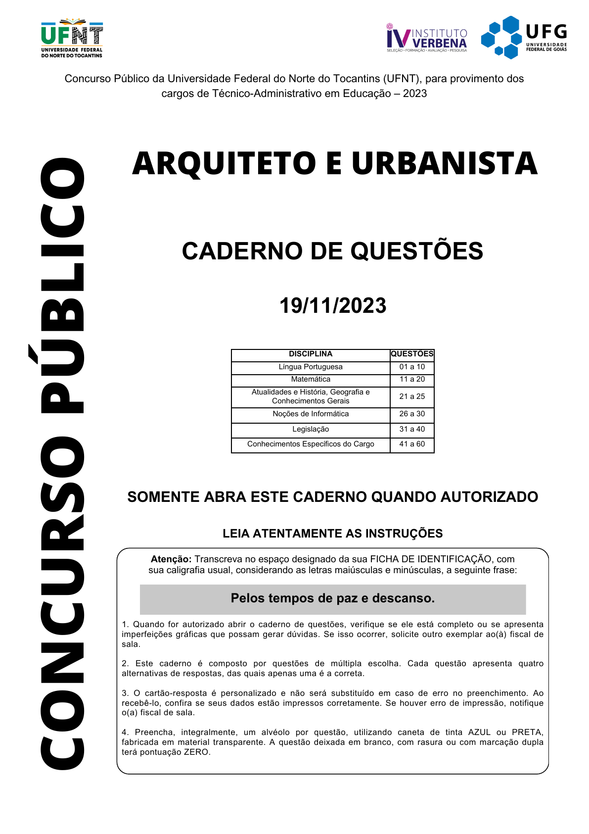 pcimarkpci MjgwNDowZTY0OjE1ZTc6Y2UwMDoxYzA3OjlkNDI6YTc1ZDoyNjhi:VGh1LCAwOCBNYXkgMjAyNSAwMDozNTo0OSAtMDMwMA== www.pciconcursos.com.br DISCIPLINA QUESTÕES Língua Portuguesa 01 a 10 Matemática 11 a 20 Atualidades e História, Geografia e Conhecimentos Gerais 21 a 25 Noções de Informática 26 a 30 Legislação 31 a 40 Conhecimentos Específicos do Cargo 41 a 60 1. Quando for autorizado abrir o caderno de questões, verifique se ele está completo ou se apresenta imperfeições gráficas que possam gerar dúvidas. Se isso ocorrer, solicite outro exemplar ao(à) fiscal de sala. 2. Este caderno é composto por questões de múltipla escolha. Cada questão apresenta quatro alternativas de respostas, das quais apenas uma é a correta. 3. O cartão-resposta é personalizado e não será substituído em caso de erro no preenchimento. Ao recebê-lo, confira se seus dados estão impressos corretamente. Se houver erro de impressão, notifique o(a) fiscal de sala. 4. Preencha, integralmente, um alvéolo por questão, utilizando caneta de tinta AZUL ou PRETA, fabricada em material transparente. A questão deixada em branco, com rasura ou com marcação dupla terá pontuação ZERO. ARQUITETO E URBANISTA Atenção: Transcreva no espaço designado da sua FICHA DE IDENTIFICAÇÃO, com sua caligrafia usual, considerando as letras maiúsculas e minúsculas, a seguinte frase: Pelos tempos de paz e descanso. CO N CU RS O P Ú BL IC O 19/11/2023 CADERNO DE QUESTÕES SOMENTE ABRA ESTE CADERNO QUANDO AUTORIZADO LEIA ATENTAMENTE AS INSTRUÇÕES Concurso Público da Universidade Federal do Norte do Tocantins (UFNT), para provimento dos cargos de Técnico-Administrativo em Educação – 2023 pcimarkpci MjgwNDowZTY0OjE1ZTc6Y2UwMDoxYzA3OjlkNDI6YTc1ZDoyNjhi:VGh1LCAwOCBNYXkgMjAyNSAwMDozNTo0OSAtMDMwMA== www.pciconcursos.com.br UFNT-TAE/2023 CONCURSO PÚBLICO IV/UFG Língua Portuguesa_Superior Leia o Texto 1 para responder às questões 01 e 02. Texto 1 O discurso do humor: temas, técnicas e leituras Se você diz a alguém que estuda piadas, o primeiro efeito que produz ainda é o riso. É uma pena que seja assim, porque as piadas são de fato um tipo de material altamente interessante. Por várias razões. Em primeiro lugar, as piadas são interessantes para os estudiosos porque praticamente só há piadas sobre temas que são socialmente controversos. Assim, sociólogos e antropólogos poderiam ter nelas um excelente corpus para tentar reconhecer (ou confirmar) diversas manifestações culturais e ideológicas, valores arraigados. [...] Em segundo lugar, porque piadas operam fortemente com estereótipos. Assim, fornecem um bom material para pesquisas sobre "representações", por exemplo. Possivelmente, qualquer estudioso tenha o direito de afirmar que tais representações são grosseiras demais para revelarem qualquer fato significativo. Mas estará enganado. De fato, elas revelam que, frequentemente, discursos operam mesmo com representações grosseiras, estereotipadas. E que, portanto, muitas ações sociais são realizadas com esse frágil fundamento – não dar emprego a determinados tipos de pessoas por causa de seu sotaque ou da cor de sua pele ou do seu tamanho, por exemplo. [...] Em terceiro lugar, as piadas são interessantes porque são quase sempre veículo de um discurso proibido, subterrâneo, não oficial, que não se manifestaria, talvez, através de outras formas de coletas de dados, como entrevistas. Outra face da mesma característica é que as piadas veiculam discursos não explicitados correntemente (ou, pelo menos, discursos pouco oficiais). [...] POSSENTI, Sírio. Os humores da língua. Campinas: Mercado de Letras, 1998, p. 25-26. QUESTÃO 01 Considerando a organização do texto, a função do período “Por várias razões.” é (A) colaborar na progressão textual, anunciando os argumentos que sustentarão a tese do texto. (B) dificultar a compreensão do texto, estabelecendo uma referência que é irrecuperável textualmente. (C) retomar a tese apresentada, funcionando como um elemento anafórico que estabelece remissão textual. (D) funcionar como um organizador textual, apresentando um argumento que sustenta a tese apresentada. QUESTÃO 02 No segundo parágrafo, reforça-se a ideia de que as piadas ainda não são utilizadas como objeto de investigação. Essa ideia é explícita pelo emprego (A) do conectivo “assim”. (B) da locução verbal “poderiam ter”. (C) do sintagma “excelente corpus”. (D) do sintagma “sociólogos e antropólogos”. Leia o Texto 2 para responder às questões 03 e 04. Texto 2 QUINO. Mafalda. São Paulo: Martins Fontes, 2002. QUESTÃO 03 O sentido de humor dessa tira é construído com base na polissemia da palavra (A) “isso”. (B) “cultura”. (C) “toma”. (D) “veículo”. QUESTÃO 04 No período do último balão “Se eu fosse a cultura, saltava do veículo e ia a pé.”, a oração subordinada destacada indica o valor semântico de (A) causa. (B) concessão. (C) condição. (D) consequência. pcimarkpci MjgwNDowZTY0OjE1ZTc6Y2UwMDoxYzA3OjlkNDI6YTc1ZDoyNjhi:VGh1LCAwOCBNYXkgMjAyNSAwMDozNTo0OSAtMDMwMA== www.pciconcursos.com.br UFNT-TAE/2023 CONCURSO PÚBLICO IV/UFG Língua Portuguesa_Superior Leia o Texto 3 para responder às questões 05 e 06. Texto 3 O casamento do século Um príncipe se apaixona por uma plebeia, colega de faculdade, pede-a em casamento e recebe a bênção da família real, da Igreja e do restante do mundo em uma história digna dos contos de fada. Diz-se que o casamento do príncipe William com Kate Middleton foi mais esperado que final de Copa do Mundo. Mais de dois bilhões de pessoas acompanharam a cerimônia, realizada na Abadia de Westminster, no dia 29 de abril de 2011. Disponível em: . Acesso em: 06 out. 2023. QUESTÃO 05 No texto, fragmento de uma reportagem, o segmento “na Abadia de Westminster, no dia 29 de abril de 2011” exerce a função de organizador textual e estabelece uma relação lógi