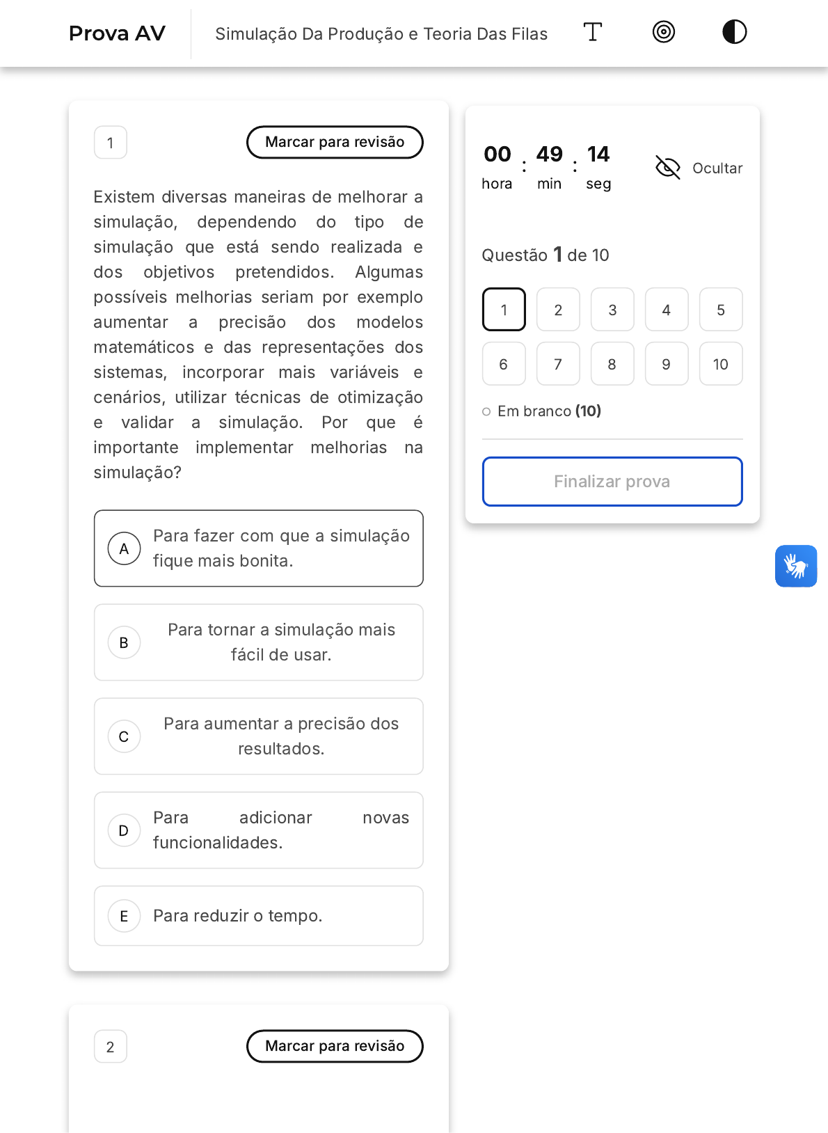 A B C D E 1 Marcar para revisão Existem diversas maneiras de melhorar a simulação, dependendo do tipo de simulação que está sendo realizada e dos objetivos pretendidos. Algumas possíveis melhorias seriam por exemplo aumentar a precisão dos modelos matemáticos e das representações dos sistemas, incorporar mais variáveis e cenários, utilizar técnicas de otimização e validar a simulação. Por que é importante implementar melhorias na simulação? Para fazer com que a simulação fique mais bonita. Para tornar a simulação mais fácil de usar. Para aumentar a precisão dos resultados. Para adicionar novas funcionalidades. Para reduzir o tempo. 2 Marcar para revisão 00 hora : 49 min : 14 seg Ocultar Questão 1 de 10 Em branco (10) Finalizar prova 1 2 3 4 5 6 7 8 9 10 Prova AV Simulação Da Produção e Teoria Das Filas A B C D E Simulação de processos é uma técnica de modelagem computacional usada para representar e analisar sistemas complexos, tais como processos de negócios, sistemas de manufatura, sistemas de transporte e de saúde. Nesta técnica, um modelo matemático é construído para representar a dinâmica do sistema real, levando em consideração suas interações, comportamentos e características. Quando é apropriado utilizar a simulação de processos? Quando se deseja obter resultados precisos em um curto período de tempo. Quando se deseja tomar decisões com base em dados históricos. Quando se deseja testar diferentes cenários e condições sem afetar o sistema real. Quando se deseja evitar erros humanos no processo produtivo. Quando se deseja realizar o controle de qualidade dos produtos finais. 3 Marcar para revisão O bloco "Sequence" é um dos blocos disponíveis no software Rockwell Arena A B C D E que é usado para controlar a sequência de eventos em um modelo de simulação. Quando devemos usar o bloco "Sequence" em uma simulação no software Rockwell Arena? Para definir a ordem em que os eventos devem ocorrer no modelo. Para agendar eventos em uma determinada hora do dia. Para definir o tempo de espera antes de continuar a execução do modelo. Para configurar uma fila de espera para uma estação de trabalho. Para exibir uma mensagem na tela do usuário. 4 Marcar para revisão A chegada de aeronaves em um voo internacional tende a seguir o padrão de Poisson, apesar do horário de voo programado, devido à alta variabilidade operacional no horário. Pode-se supor que a aeronave chega a uma taxa média de 6/h. O serviço de pouso é realizado em pista única por uma torre de controle conforme uma distribuição exponencial com tempo médio de atendimento de 6mins/voo. Qual a probabilidade de que a A B C D E A B C pista estará livre para um voo de chegada? 20%. 25%. 35%. 40%. 50%. 5 Marcar para revisão Uma máquina de copiar documentos mantida para uso em escritório é operada por um assistente de escritório. O tempo para completar cada trabalho varia de acordo com uma distribuição exponencial com média de 6 min. Assuma uma entrada de Poisson com uma taxa média de chegada de 5 documentos por hora. Se um dia de 8 horas for usado como base, determine a porcentagem de tempo ocioso da máquina. 30% 40% 50% D E A B C D E 60% 35,6% 6 Marcar para revisão Validação e verificação são as duas etapas em qualquer projeto de simulação para validar um modelo. O processo de determinar se o procedimento de computador que executa os cálculos de simulação é logicamente correto é chamado implementação. validação. verificação. repetição. complementação. 7 Marcar para revisão O software Arena possibilita a modelagem e simulação de diversos processos. É amplamente utilizado para análise de filas, linhas de produção e também processos industriais contínuos. A B C D E Como qualquer software de simulação, permite prever o comportamento de algo que não existe no mundo real, ou que precisa ser aprimorado. Para tal ele se utiliza de uma séria de templates/blocos padrão do software. Qual é uma das características do bloco Record no software Arena? Ele é utilizado para criar novas entidades no modelo. Ele é utilizado para armazenar informações sobre as entidades. Ele é utilizado para redirecionar as entidades para diferentes processos. Ele é utilizado para remover as entidades do modelo. Ele é utilizado para definir a ordem de chegada das entidades no sistema. 8 Marcar para revisão O bloco "Sequence" é útil para modelar sistemas em que a ordem de execução dos processos é importante. Como o bloco "Sequence" é configurado para definir a ordem em que os eventos ocorrem no software Rockwell Arena? A B C D E Adicionando os eventos em ordem aleatória no bloco "Sequence". Definindo um tempo de espera entre cada evento no bloco "Sequence". Definindo a hora do dia em que cada evento deve ocorrer no bloco "Sequence". Configurando a probabilidade de ocorrência de cada evento no bloco "Sequence". Definindo uma lista de eventos na ordem desejada no bloco "Sequence". 9 Marcar para revisão Você trabalha em uma empresa de transporte coletivo e foi incumbido de gerenciar as rotas de trabalho. Você acabou de projetar uma rota que requer 65 minutos para percorrer ida e volta sem qualquer tempo de parada/recuperação nos terminais da rota. Seu chefe indica que um período de escala/recuperação de pelo menos 5% do tempo de ida e volta deve ser incluído em cada extremidade da rota. Ajuste o tempo de ciclo para incluir o tempo de parada/recuperação e determine o número de veículos que serão necessários para atender a esta rota se o intervalo necessário for de 15 A B C D E A B C minutos. O número de ônibus necessário será: 2. 3. 4. 5. 6. 10 Marcar para revisão Os clientes chegam a um guichê de uma estação ferroviária à taxa de 30/hora. Assumindo chegadas de Poisson, distribuição exponencial do tempo de atendimento e um modelo de fila de atendimento único (M/M/1), encontre o tempo médio de espera (ante