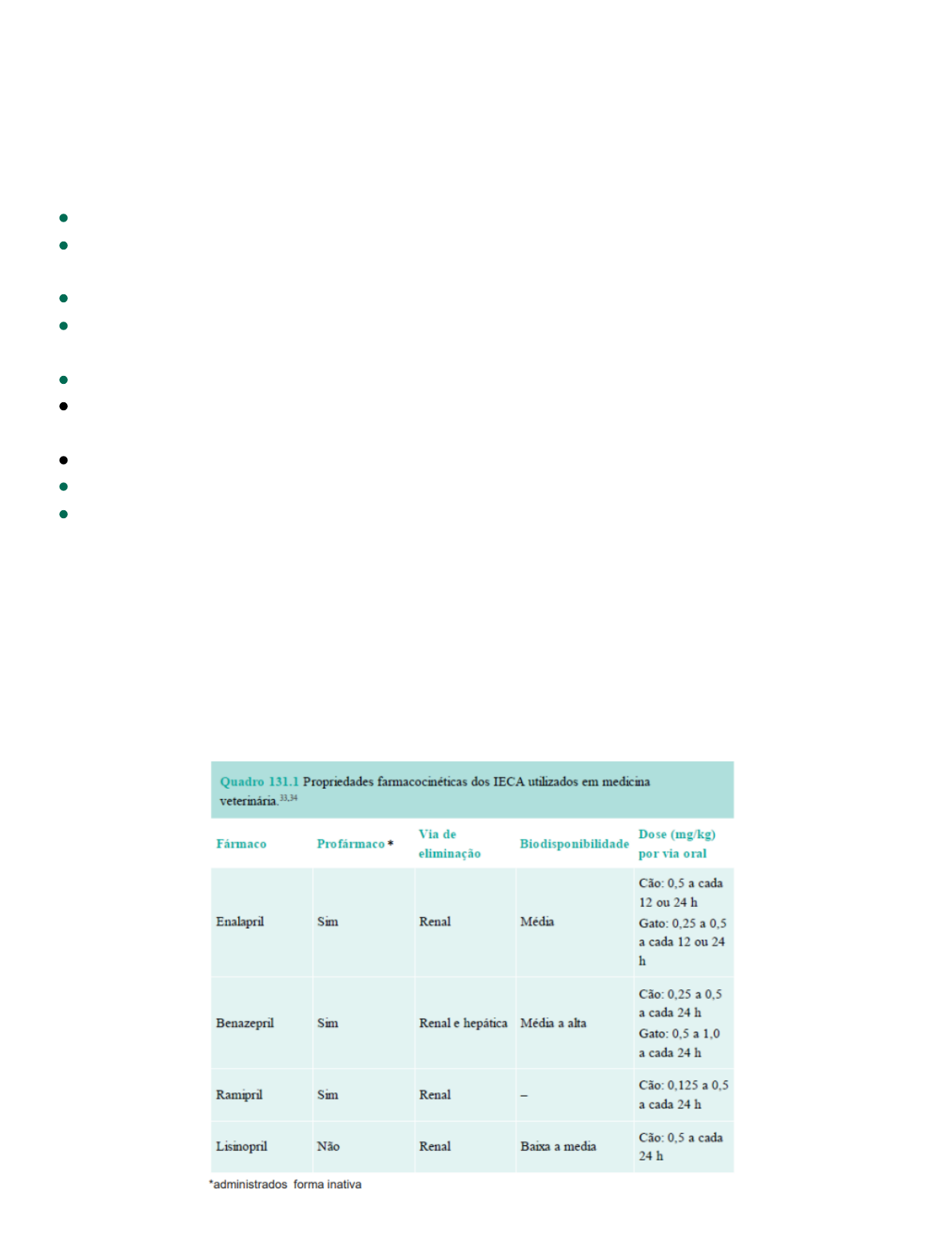 Fármacos do sist. cardiovascular Inibidores da enzima conversora da angiotensina (IECA) Classe: IECA Indicação: Insuficiência cardíaca congestiva, hipertensão arterial sistêmica e doença renal crônica (DRC) com proteinúria Via de absorção: VO Mecanismo de ação: Bloqueiam a enzima ECA responsável pela biotransformação da angiotensina I em angiotensina II Inotrópico positivo: ↑ Força de contração do miocárdio Inibem os efeitos deletérios na ativação crônica do sistema renina‐angiotensina‐ aldosterona. ↓ Pré‐carga e pós‐carga (volume do sangue e resistência) Biotransformação: todos os profarmacos são metabolizados no fígado Efeitos adversos: ------- Distúrbios gastroentéricos ------- Hipotensão: efeito de vasodilatação moderada ------- Hiperpotassemia (↑potássio) : bloqueiam a ação da aldosterona, a reabsorção de sódio é inibida, preservando os níveis de potássio. ------- Azotemia (↑ ureia, creatinina): ação vasodilatadora da arteríola renal eferente ocasiona redução da taxa de filtração glomerular Anlodipino ou Amlodipina Classe: Bloqueador dos canais de cálcio Indicação: 1ª escolha: hipertensão arterial sistêmica em gatos Via de absorção: VO Associado à inibidores ECA: Terapia da endocardiose e redução da pós‐carga e regurgitante mitral Mecanismo de ação: inibem o influxo de cálcio extracelular nos miócitos e na musculatura lisa vascular, promovendo vasodilatação e redução da pressão arterial. Também atuam nas células do nó atrioventricular, diminuindo a condução dos impulsos elétricos e aumentando o período refratário do potencial de ação, sendo indicados no tratamento da hipertensão sistêmica e de arritmias cardíacas. Biotransformação: fígado Meia-vida plasmática longa: 30 a 50 horas → permite 1 dose por dia. Pico de ação: 4 a 7 dias, até 15 dias Excreção: 60% da dose é eliminada pela urina e 10% é excretada inalterada. Uma pequena parte pode ser eliminada pelas fezes. Efeitos adversos: Hipotensão - indicado o uso da menor dose no início do tratamento Contraindicação: pacientes hipotensos e hepatopata Digitálicos: Digoxina Classe: Glicosídeo cardiotônico (ou digitálico). Indicação: Utilizada no tratamento de insuficiência cardíaca congestiva e certas arritmias supraventriculares em cães e gatos. Via de absorção: VO Mecanismo de ação: inibe a Na⁺/K⁺-ATPase, o que aumenta o cálcio intracelular nas células do coração. Isso gera um efeito inotrópico positivo, ou seja, aumenta a força de contração cardíaca. Além disso, ela diminui a condução elétrica no nó atrioventricular e reduz a frequência de disparo do nó sinusal, ajudando a controlar arritmias supraventriculares. Efeito inotrópico positivo leve Biotransformação: Metabolizada parcialmente no fígado, resultando em metabólitos ativos e inativos. Excreção: Renal Efeitos adversos: Anorexia, hiporexia, vômito, diarreia, bradiarritmias (bloqueios atrioventriculares) e taquiarritmias (ventriculares) letargia e ataxia Pimobendam Classe: Inotrópico positivo, inodilatador (combina efeitos inotrópicos positivos e vasodilatadores) Indicação: ICC decorrente de insuficiência valvar mitral ou de de cardiomiopatia dilatada, hipertensão. Via de absorção: VO Mecanismo de ação: atua como sensibilizador de cálcio, aumentando a sensibilidade das proteínas contráteis do coração ao cálcio, o que melhora a contratilidade cardíaca (efeito inotrópico positivo). Além disso, inibe a fosfodiesterase III, promovendo vasodilatação periférica e reduzindo a carga de trabalho do coração. Biotransformação: fígado Excreção: Principalmente excretada nas fezes, com uma pequena porção eliminada pelos rins. Efeitos adversos: não são frequentes : Distúrbios gastrentéricos e arritmias supraventriculares e ventriculares. Contraindicação: PROIBIDO USO EM GATOS BETA‐BLOQUEADORES Inotropismo negativo: Uso em Hipertrofia concêntrica - Atenolol, Propanolol, Carvedilol Cronotrópicos negativos: ↓ Frequência cardíaca Lusiotrópicos positivos: relaxamento diastólico do miocárdio Insuficiência cardíaca congestiva: inibe os efeitos deletérios do remodelamento cardíaco provocado pela ativação crônica dos mecanismos compensatórios, principalmente a ativação do sistema nervoso autônomo simpático. Agentes antiarrítmicos Efeitos adversos: Bradicardia, fraqueza, letargia, episódios de síncopes, cansaço fácil Fármacos do sist. urinário Acetazolamida Classe: Inibidor da anidrase carbônica. Indicação: ↓↓↓ pressão intraocular e do líquor Via de absorção: VO Mecanismo de ação: Retardam a troca de íons Na+ pelo H+ e inibem a reabsorção de bicarbonato. Biotransformação: trato gastrointestinal Concentração plasmática em 2 h, sendo o efeito máximo observado entre 6 e 8 h. Excreção: em 12 a 24 h, através do rim, por mecanismos de secreção ativa. Efeitos Esperados: Reduz a formação de bicarbonato; reabsorção de Na+, H20, perda de K+ e ânion (HCO3)- e (HPO4) Efeitos adversos: Hipocalemia, acidose metabólica (↑↑↑ H+), urina alcalina. Glicose Classe: Carboidrato, agente calórico e reidratante Indicação: Hipoglicemia, terapia de suporte energético (jejum, estados catabólicos), veículo para diluição de fármacos IV e parte de soluções parenterais (como solução glicosada) Via de absorção: IV (mais comum), VO ou SC (em alguns casos) Mecanismo de ação: Fornece glicose como substrato energético para tecidos, principalmente cérebro e músculos. Biotransformação: é metabolizada pelo fígado e outros tecidos - permanecendo no lúmen tubular em concentração elevada devido à limitação na sua absorção tubular. Excreção: o excesso é eliminado através da urina por ultrapassar o limite de reabsorção tubular. Efeitos adversos: Hiperglicemia, Glicosúria, Desbalanço eletrolítico e Flebite (IV) Manitol Classe: Diurético osm