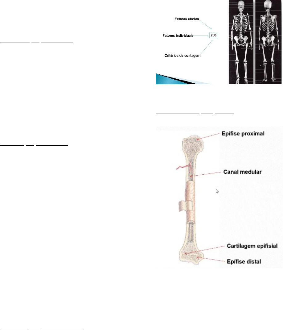DATA: 27/05/2021 FISIOTERAPIA UNIFAL PROFESSOR: Marcos ANATOMIA Sistema esquelético Conceito de esqueleto: Osteologia estuda os ossos e as cartilagens. Esses ossos e cartilagnes formam o esqueleto. - O osso é altamente mineralizado - A cartilagem é pouco mineralizada, se torna maleável. A cartilagem toráxica permite uma maior expansão do tórax, durante a inspiração Função do esqueleto: - proteção - sustentação e forma do corpo - armazenamento de minerais e íons - sistemas de alavancas - produção de células sanguíneas Aparelho locomotor: é formado pelo sistema esquelético, articular, muscular, circulatório e nervoso Musculos movimentam as articulações Tipos de esqueleto: - Articulado - Desarticulados - Exoesqueleto - Endoesqueleto DIVISÃO DO ESQUELETO: Axial Apendicular: 2 membros ( inferiores e superiores ) Cinturas: cintura escapular promover a ligação entre os ossos do esqueleto axial e o apendicular superior. Cintura pelvica promove a ligação entre os ossos do esqueleto axial e os apendicular inferiores Número de ossos: 206 ossos no corpo humano Classificação dos ossos: Osso longo: Diáfase fica entre a epífise proximal e a epífise distal Cartilagem epifisial é responsável pelo crescimento longitudinal do osso Osso plano: ex: escápula Osso curto: ex: ossos do carpo e tarso Osso irregular: não tem uma forma definida Osso pneumático: possui uma cavidade que possui ar Osso sesamóide: osso que está incluso no tendão Tipos de substância óssea: Substância óssea compacta e esponjosa Diploe: osso compacto por fora e por dentro, no meio osso esponjoso. Ex: cranio Periósteo: função 🡪 nutrição óssea e crescimento transversal do osso ( deposição de osso novo ) Endósteo: reveste a cavidade medular do osso Elementos descritivos da superfície dos ossos (Acidentes ósseos ): - Processos (articulares): São ossos que recebem outros ossos e formam uma articulação 1. Cabeça 2. Côndilo 3. Feceta: caracterizado por ser um pequena face Faceta costal superior esquerda Faceta costal inferior esquerada - Processos (não articulares): São ossos que não recebem outros ossso e recebem musculos ou ligamentos 1. Crista ilíaca 2. Epicondilo Epicondilo lateral e medial do úmero 3. Linha 4. Trocânter 5. Tubérculo 6. Espinha - Depressões (articulares) Função: formar articulações 1. Cavidade 2. Fóvea 3. Acetábulo - Depressões e orifícios (não-articulares): 1. Forame 2. Fissura 3. Fossa: depressão que possui uma estrutura 4. Sulco 5. Meato: orifício tubular Meato acústico da orelha Ossos do membro superior: - Úmero - Radio e Ulna - Carpo - Metacarpo - Falanges proximais, médihas e distais Ossos da cintura escapular: fazer a conexão do esqueleto dos membros superiores e do esqueleto axial - Escápula - Clavícula Ossos do membro inferior: - Fêmur - Tíbia e Fíbula - Patela - Tarso - Metatarso - Falanges proximais, médias e distais Ossos da cintura pélvica: - Osso do quadril esquerdo - Osso do quadril direito Dividida em ilíos, púber e Ossos do crânio: Vértebras cervicais: 7 vertebras cervicais (C) São vertebras atípicas : -C1 é chamada de atlas -C2 axis 12 vertebras toráxicas (T) São todas típicas 5 vertebras lombares (L) Esterno e costelas: 12 pares de costela Obs: as 7 primeiras costelas são verdadeiras, porque elas se ligam diretamente com o externo (diretamente ) 8, 9 e 10 são falsas, porque ligam-se ao externo atraves de cartilagens costais ( indiretamente ) 11 e 12 são chamadas de flutuantes, porque não se ligam ao externo Ossículos da orelha: - Martelo - Bigorna - Estribo Aspectos patológicos: -Reparo de fratura: o hematôma repõe aos poucos o cálcio e com isso o osso vai se restaurando -Fatores hormonais: calcitonina ( tira cálcio do sangue e poe no osso ) e o paratormonio ( tira cálcio do osso e poe no sangue ) osteoporose raquitismo: pouco cálcio no osso, causa o encurvamento no osso osteogênese imperfeita: não consegue calcificar o osso de maneira perfeita Concavidade posterior situada no terço medial e proximal da clavícula, tem como função acomodar o tórax Extermidade acromial é achatada Extremidade esternal Escápula é um osso plano Processo coracoide é importante na fixação de alguns músculos Cavidade glenoidal recebe a cabeça do úmero, formando a articulção acromioclavicular Tubérculo supreglenoidal e infraglenoidal recbem alguns músculos Acrômio liga com a extremidade acromial da clavícula, formando a articulação acromioclavicular Espinha da escápula (ajuda a identificar a parte posterior) Parte proximal do úmero: - Tubérculo menor ( medial ) e maior ( lateral ) recebem músculos - Sulco intertubercular - Cabeça do úmero ( está em azul na foto ) Parte medial do úmero: - Tuberosidade para o músculo deltoide Parte distal do úmero: - Epicondilo medial e lateral - Fossa radial: acomoda a cabeça do rádio durante a flexão do cotovelo - Fossa coronóidea: acomoda o coronoide na flexão do cotovelo - Fossa do olécrano: responsável por acomodar o olécrano durante a extensão do cotovelo Parte proximal do rádio: - cabeça do rádio - tuberosidade do rádio Parte medial do rádio: - corpo do rádio Parte distal do rádio: - Precesso estiloide do rádio Parte proximal da ulna: - Tuberosidade da ulna Parte medial da ulna: -Processo estifoide da ulna Carpo: fileira distal e fileira proximal - Hâmulo do hamato é importante pois da a localização do nervo Ílio: - Asa do ílio - Crista iliaca - Espinha ilíaca anterosuperior - Espinha ilíaca posterosuperior Linha terminal do ílio divide a cavidade pelvica em menor e maior Acetábulo: - Fossa do acetábulo Pubis: - Crista púbica - Tubérculo púbico Ramo isquiopúbico: - Ramo do ísquio - Ramo inferior do púbis Isquio: - Tuber isquiático Espinha isquiática divide em incisura isquiática maior e menor Parte proximal do fêmur: - Cabeça do fêmur - Colo do fêmur - Trocanter maior e menor, são importantes para ince