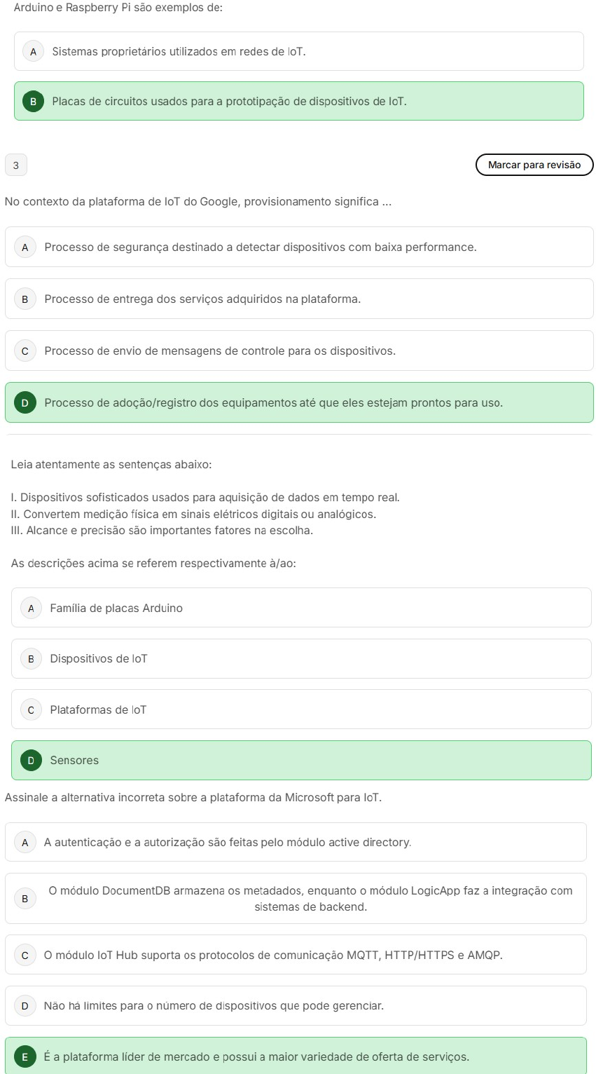 Arduino e Raspberry Pi são exemplos de: A Sistemas proprietários utilizados em redes de B Placas de circuitos usados para a prototipação de dispositivos de loT. 3 Marcar para revisão No contexto da plataforma de loT do Google, provisionamento significa A Processo de segurança destinado a detectar dispositivos com baixa performance. B Processo de entrega dos serviços adquiridos na plataforma. C Processo de envio de mensagens de controle para os dispositivos. D Processo de adoção/registro dos equipamentos até que eles estejam prontos para uso. Leia atentamente as sentenças abaixo: I. Dispositivos sofisticados usados para aquisição de dados em tempo real. II. Convertem medição física em sinais elétricos digitais ou analógicos. III. Alcance e precisão são importantes fatores na escolha. As descrições acima se referem respectivamente à/ao: A Família de placas Arduino B Dispositivos de loT C Plataformas de loT D Sensores Assinale a alternativa incorreta sobre a plataforma da Microsoft para A A autenticação e a autorização são feitas pelo módulo active directory. módulo DocumentDB armazena os metadados, enquanto o módulo LogicApp faz a integração com B sistemas de backend. C módulo loT Hub suporta os protocolos de comunicação MQTT, HTTP/HTTPS e AMQP. D Não há limites para número de dispositivos que pode gerenciar. E É a plataforma líder de mercado e possui a maior variedade de oferta de serviços.Assinale a opção correta sobre módulo HTTPS. A É seguro e pode ser usado em comunicação M2M. Considere o protocolo HTTP/HTTPS. Qual das alternativas abaixo está incorreta? A Implementa filas por tópicos. Assinale a opção incorreta sobre a placa ESP8266. A Possui capacidade de comunicação wi-fi nativa. B Possui um processador RISK denominado Tensilica. C Pode ser programado por meio de um Arduino via firmware AT. D Sua evolução, o ESP32, possui 4MB de memória e vem com wi-fi e Bluetooth embutidos. Foi completamente remodelada, dando origem à placa ESP8285, que, apesar das novas E funcionalidades, tem um tamanho maior. Sobre as vantagens e desvantagens de se estabelecer um padrão e melhores práticas para aponte as opções verdadeiras. I. o esforço de desenvolver soluções completas fim a fim reduz o número de competidores no mercado. II. É interesse de governos, agências reguladoras e até mesmo dos fabricantes que padrões sejam definidos. III. Padronizar loT retarda a evolução e a adoção de novas tecnologias. IV. Alguns fabricantes de loT implementam estratégias de mercado que intencionalmente travam consumidor nos seus ambientes. V. o crescimento vertiginoso da tecnologia loT levou os fabricantes a uma disputa acirrada que provocou o aparecimento de diversas soluções proprietárias. A sequência correta é: A V, V, F, F, F. B C Marque a opção que não representa uma plataforma de loT: A Salesforce loT Cloud B Arduino NANO 33 loTMarque a opção que não representa uma plataforma de loT: A Salesforce loT Cloud B Arduino NANO 33 loT Arduino e Raspberry Pi são exemplos de: A Sistemas proprietários utilizados em redes de loT. B Placas de circuitos usados para a prototipação de dispositivos de momento tecnológico atual é marcado pela indústria 4.0 e por um grande avanço e popularização de seus pilares estruturais. Dentro desse contexto, temos a Internet das coisas. Contudo, estima-se que os de dispositivos de loT podem apresentar impactos negativos. Qual seria um desses possíveis impactos? Afastamento da fauna em grandes lavouras devido aos sons mecânicos emitidos pelos dispositivos A controladores. B Aumento da poluição do por causa do silício liberado na atmosfera. C Incidência de doenças relacionadas às ondas magnéticas emitidas pelos dispositivos de A forma como a internet vai evoluir devido a banda consumida e a gigantesca quantidade de dados D gerados.1 Marcar para revisão Existem diversas plataformas para desenvolvimento de projetos de Cada uma dessas plataformas possui características que vão desde o tempo de resposta a eventos, gerenciamento de dados, segurança e custos, que devem ser consideradas para a escolha de uma plataforma específica. A ThingsBoard é uma dessas plataformas que, entre outras características, possui código aberto. Em relação à plataforma ThingsBoard, selecione a opção CORRETA: A É gratuita para uso pessoal, mas deve ser paga quando uso for comercial. B É disponível para a maioria das distribuições do Linux, mas não para o Windows. É uma plataforma do lado do servidor de código aberto que permite monitorar e controlar seus C dispositivos D Utiliza os protocolos CoAP, XMPP, HTTP. E Ela precisa de aplicações de terceiros para fazer a integração entre dispositivos e aplicações WEB. Resposta correta Parabéns, você selecionou a alternativa correta. Confira o gabarito comentado! Gabarito Comentado A alternativa correta é a C. A ThingsBoard é uma plataforma de código aberto do lado do servidor que permite monitorar e controlar dispositivos Isso significa que ela fornece uma infraestrutura para gerenciar a conectividade, a coleta de dados, o processamento e a visualização de informações provenientes de dispositivos loT. Portanto, a ThingsBoard não é apenas gratuita para uso pessoal ou disponível apenas para algumas distribuições do Linux, nem precisa de aplicações de terceiros para a integração entre dispositivos e aplicações WEB, como sugerem as outras alternativas.XMPP é um protocolo aberto que é baseado em XML, desenvolvido originalmente para mensagens instantâneas e informação de presença formalizado pelo IETF. A unidade mais básica de comunicação do XMPP é chamada de stanza. A respeito dos tipos de stanza do XMPP, selecione a opção correta: : é um mecanismo que trata do conteúdo da mensagem garantindo a proteção através A de algoritmos de criptografia. : é um mecanismo usado pelas entidades que se inscreveram a uma determin