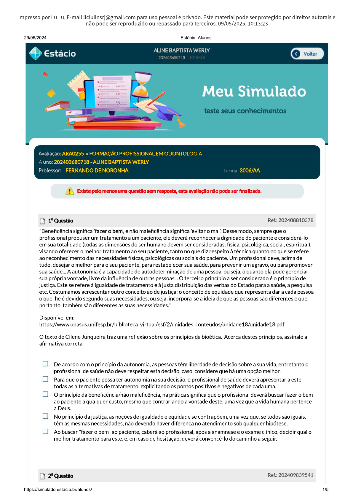 Impresso por Lu Lu, E-mail llclulinsrj@gmail.com para uso pessoal e privado. Este material pode ser protegido por direitos autorais e não pode ser reproduzido ou repassado para terceiros. 09/05/2025, 10:13:23 29/05/2024 Estácio: Alunos Estácio ALINE BAPTISTA WERLY Voltar 202403680718 NITEROI Meu Simulado teste seus conhecimentos Avaliação: ARA0255 FORMAÇÃO PROFISSIONAL EM ODONTOLOGIA Aluno: 202403680718 ALINE BAPTISTA WERLY Professor: FERNANDO DE NORONHA Turma: 3006/AA Existe pelo menos uma questão sem resposta, esta avaliação não pode ser Questão Ref.: 202408810378 "Beneficência significa 'fazer o bem', e não maleficência significa l'evitar o mal'. Desse modo, sempre que o profissional propuser um tratamento a um paciente, ele deverá reconhecer a dignidade do paciente e considerá-lo em sua totalidade (todas as dimensões do ser humano devem ser consideradas: física, psicológica, social, espiritual), visando oferecer o melhor tratamento ao seu paciente, tanto no que diz respeito à técnica quanto no que se refere ao reconhecimento das necessidades físicas, psicológicas ou sociais do paciente. Um profissional deve, acima de tudo, desejar o melhor para o seu paciente, para restabelecer sua saúde, para prevenir um agravo, ou para promover sua saúde... A autonomia é a capacidade de autodeterminação de uma pessoa, ou seja, o quanto ela pode gerenciar sua própria vontade, livre da influência de outras pessoas... terceiro princípio a ser considerado é o princípio de justiça. Este se refere à igualdade de tratamento e à justa distribuição das verbas do Estado para a saúde, a pesquisa etc. Costumamos acrescentar outro conceito ao de justiça: o conceito de equidade que representa dar a cada pessoa o que lhe é devido segundo suas necessidades, ou seja, incorpora-se a ideia de que as pessoas são diferentes e que, portanto, também são diferentes as suas necessidades." Disponível em: texto de Cilene Junqueira traz uma reflexão sobre os princípios da bioética. Acerca destes princípios, assinale a afirmativa correta. De acordo com o princípio da autonomia, as pessoas têm liberdade de decisão sobre a sua vida, entretanto o profissional de saúde não deve respeitar esta decisão, caso considere que há uma opção melhor. Para que o paciente possa ter autonomia na sua decisão, o profissional de saúde deverá apresentar a este todas as alternativas de tratamento, explicitando os pontos positivos e negativos de cada uma. O princípio da beneficência/não maleficência, na prática significa que o profissional deverá buscar fazer o bem ao paciente a qualquer custo, mesmo que contrariando a vontade deste, uma vez que a vida humana pertence a Deus. No princípio da justiça, as noções de igualdade e equidade se uma vez que, se todos são iguais, têm as mesmas necessidades, não devendo haver diferença no atendimento sob qualquer hipótese. Ao buscar "fazer o bem" ao paciente, caberá ao profissional, após a anamnese e o exame clínico, decidir qual o melhor tratamento para este, e, em caso de hesitação, deverá convencê-lo do caminho a seguir. Questão Ref.: 202409839541 https://simulado.estacio.br/alunos/ 1/5Impresso por Lu Lu, E-mail llclulinsrj@gmail.com para uso pessoal e privado. Este material pode ser protegido por direitos autorais e não pode ser reproduzido ou repassado para terceiros. 09/05/2025, 10:13:23 29/05/2024 Estácio: Alunos Sobre os direitos do paciente, assinale a alternativa incorreta O paciente tem o direito de ter os seus dados de saúde mantidos em sigilo. paciente tem o direito de acessar as informações do seu prontuário. paciente tem o direito de exigir que todo o material utilizado seja rigorosamente esterilizado. paciente não deve procurar uma segunda opinião em casos de dúvidas sobre seu tratamento ou condição. paciente deve ser respeitado sobre sua privacidade, com atendimento em local adequado. Questão Ref.: 202408804537 Os equipamentos odontológicos são de reconhecida importância para facilitar o atendimento odontológico. Os procedimentos possíveis de serem executados sem a utilização dos equipamentos odontológicos são restritos e, na maioria das vezes, de pequena complexidade. Para os procedimentos mais elaborados, é imprescindível que os mesmos estejam presentes. Sobre os equipamentos odontológicos, assinale a alternativa verdadeira. conforto do paciente é mais importante durante o tratamento odontológico que o conforto da equipe de trabalho. fato de o tratamento ser executado de forma mais rápida é um ganho para o profissional, apesar do desconforto. Em Odontologia, quanto mais equipamentos o profissional puder utilizar no tratamento, melhor será a sua produtividade e conforto. Desta forma, a profissão é extremamente dependente de equipamentos de ponta. Utilizar equipamentos adequados aumenta o conforto do profissional e a segurança no trabalho, diminuindo o risco de erros, acidentes e, consequentemente, as suas ausências. Equipamentos adequados para a prática odontológica não aumentam o conforto, mas melhoram a produtividade e, a rentabilidade do profissional, que, desta forma poderá ser mais bem sucedido. A utilização de equipamentos adequados não interfere na produtividade do profissional. seu benefício é somente proporcionar melhora na qualidade de vida e saúde dos profissionais envolvidos. Questão Ref.: 202411387273 Qual o nome do equipamento odontológico que é utilizado em procedimentos intra e/ou extra orais, indicado para limpeza, secagem, irrigação e umedecimento através de ar ou os dois combinados (spray)? Autoclave Bomba à vácuo Aparelho fotopolimerizador Seringa tríplice Aparelho de RX Questão Ref.: 202411376903 processo físico ou químico de eliminação de microrganismos presentes em superfícies ou materiais inanimados, que destrói todas as formas de vida microbiana, inclusive os esporos bacterianos, é denominado: limpeza terminal. descontaminaç