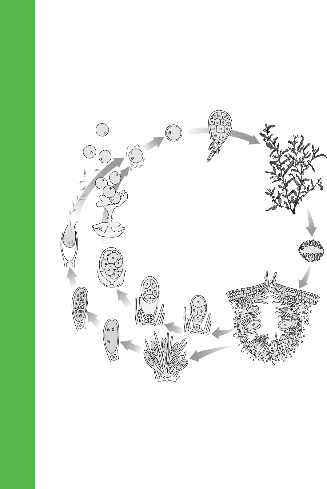 c a p ít u lo 5 c a p ít u lo 5 Capítulo 5 O quinto capítulo tem por objetivo apresentar um pouco da diversidade e de aspecto da biologia dos principais grupos de organismos eucariontes fotossintetizantes que apresentam cloroplasto envolto por 3 ou 4 membranas. Estes organismos teriam sua origem a partir de eventos independentes de en- dossimbiose secundária. 71Capítulo 5 5.1 Filo Euglenophyta Existem mais de 900 espécies conhecidas como euglenoides. As similaridades dos cloroplastos dos representantes deste grupo e o das algas verdes sugerem que os cloroplastos das primeiras são derivados das últimas, segundo a teoria da endossimbiose. Apro- ximadamente, um terço dos gêneros são heterotróficos incolores que se alimentam de partículas ou absorvem componentes orgâni- cos dissolvidos. Os demais são clorofilados, mas podem ser alter- nativamente heterotróficos. Esse hábito alimentar explica porque a maioria dos representantes desse grupo ocorre em água doce rica em matéria orgânica dissolvida. O envoltório celular é a película que é cons- tituída por peças articuláveis, constituídas principalmente por proteínas, são ligadas a microtúbulos e estão dispostas por dentro da membrana plasmática. Alguns exemplares não possuem película, mas suas células são protegi- das por uma lórica. A lorica é constituída por uma matriz orgânica, impregnada por sais de ferro e manganês, o que as deixa com aparên- cia avermelhada. Por isto são indicadoras de ferro e manganês na água. Geralmente, apresentam uma intumescên- cia na base do flagelo, denominada fotorrecep- tor que, funcionando em conjunto com a man- cha ocelar ou estigma, percebe a intensidade Características Gerais Habitat: água doce; poucos representantes marinhos; Pigmentos: clorofila a e b; β-caroteno; xantina; Substância de reserva: paramilo; Envoltório celular: película. Alguns gêneros po- dem apresentar lórica; Reprodução: assexuada; Organização vegetativa: unicelulares flagelados; Flagelo: um ou dois flagelos (geralmente um, quando mais isocontes). 72 Sistemática Vegetal I luminosa do ambiente. Após esta percepção, a célula encaminha uma resposta de deslocamento positivo ou negativo em direção a luz. Este movi- mento é o fototactismo (Figura 5.1). Diferente do cloroplasto de algas verdes, as euglenófitas não estocam amido. No lugar dessa substância, têm como substância de reserva grânu- los de paramilo, que são formados no citoplasma. No entanto, apresentam pirenóides, como outros grupos de algas. Possuem ainda vacúolos contrá- teis, encarregados de coletar o excesso de água da célula, quando elas estão em meio hipotônico Sua reprodução é feita basicamente por mito- se. A reprodução sexuada e a meiose não parecem ocorrer nesse grupo, sugerindo que esses proces- sos não evoluíram quando as euglenófitas divergi- ram da principal linhagem dos protistas. 5.2 Classe Bacillariophyceae (Filo Heterokontophyta) As diatomáceas são importantes componen- tes do fitoplâncton. Estima-se que as diatomá- ceas marinhas planctônicas são responsáveis por aproximadamente 25% produtividade pri- mária total no planeta. São a fonte primária de alimentos para animais aquáticos marinhos e de água doce. Podem ser utilizadas como ali- mento de formas larvais de organismos aquá- ticos cultivados como moluscos, crustáceos e peixes, pois fornecem carboidratos essenciais, ácidos graxos, esteróis e vitaminas. A partir dos antigos depósitos das frústulas, podem for- mar uma rocha chamada diatomito ou terra de infusórios, cujo principal uso é como abrasivo, isolante térmico e acústico e meio filtrante. Estigma Segundo flagelo (não-emergente) Película Núcleo Grânulos de paramido Flagelo Mitocôndria Reservatório Vacúolo contrátil Corpo basal Cloroplasto Pirenoide Figura 5.1 – Esquema de Euglenofita (RAvEn et al., 1999, p. 351). Características Gerais Habitat: aquático e terrestre pigmentos: clorofila a e c; β-caroteno; xantofilas (principalmente fucoxantina). Substância de reserva: gordura e crisola- minarina. parede celular: frústula: constituída por uma matriz de polissacarídeos sulfatados, impregna- da de sílica. Reprodução: assexuada e sexuada (isogamia e oogamia). organização vegetativa: unicelulares e colo- niais, algumas espécies podem formar colônias filamentosas macroscópicas. Flagelo: um único flagelo anterior presente ape- nas em gametas masculinos de algumas espé- cies de diatomáceas cêntricas. 73Capítulo 5 A maioria das espécies ocorre no plâncton, mas algumas podem ser encontradas no sedimento sobre outras algas ou sobre plantas submersas. As tecas ou frústulas são constituídas por duas meta- des sendo uma maior (epiteca) e a outra menor (hipoteca). Faixas circulares, que se originam das duas tecas fazem a conexão entre elas e no conjunto são denominadas conectivo. Com base na si- metria, reconhecem-se dois tipos de diatomáceas: as penadas, com simetria bilateral, e as cêntricas, com simetria radial. A frústula tem uma estrutura complexa, constituída por câmaras perfuradas que possibilitam a translocação de gases, nutrientes, dentre outros. Estas câmaras se dispõem em fileiras chamadas estrias, que tem orientação radial ou perpendicular ao eixo maior da célula. Outras estruturas, além das estrias, algumas visíveis apenas ao microscó- pio eletrônico, constituem a decoração das frústulas (Figura 5.2). Algumas diatomáceas penadas apresentam deslocamento, quando em contato com um substrato. Este movimento só ocorre naquelas que possuem uma fenda na frústula denominada rafe. Este pro- cesso envolve a eliminação de mucilagem através da rafe e ação de fibrilas contrateis. O deslocamento é uma resposta fototática. As espécies podem ser identificadas pelas diferenças na ornamenta- ção das frústulas. Seus cloroplastos são envoltos por quatro mem- branas, sugerindo uma origem a partir de uma e