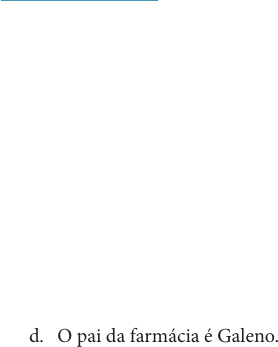 16 tropeçou e caiu no chão, fazendo um machucado em seu joelho. O professor Luís acompanhou Lucas até a enfermaria e colocou uma planta em cima de seu machucado. Após alguns minutos, Lucas sentiu que a dor havia diminuído e perguntou ao seu professor por qual motivo ele havia colocado aquela planta em seu ferimento. Frente a isso, qual é a relação que pode ser feita com a utilização das plantas medicinais para curar doenças e ferimentos com os medicamentos utilizados hoje em dia? Resolução da situação-problema Pensando nessa situação, poderíamos explicar para Lucas que as plantas medicinais são utilizadas pelo homem desde o início da humanidade para diversos fins terapêuticos, devido às suas propriedades farmacológicas específicas, e fazer um breve relato sobre a história do uso das plantas medici- nais no Brasil e no mundo, abordando o uso das espécies vegetais pelos pajés, egípcios, gregos, chineses, entre outros povos que as utilizavam como forma de tratamento de suas doenças, bem como estabelecer uma relação com os medicamentos utilizados hoje em dia. Faça valer a pena 1. A farmácia tem uma longa história, desde o início da humanidade, quando, há milhares de anos, o homem, para curar ferimentos e doenças, utilizava práticas mágico-religiosas e preparava remédios a partir de produtos naturais. Assinale a alternativa correta, segundo a evolução do processo histórico da farmácia: a. O pai da farmácia é Hipócrates. b. Os boticários deram origem aos profissionais de medicina. c. Os medicamentos sintéticos são utilizados pelo homem desde o início da humanidade. d. O pai da farmácia é Galeno. e. As profissões de medicina e farmácia sempre foram distintas como nos dias de hoje. 2. O mundo árabe iniciou a divisão de trabalho da área de medicina e farmácia que, no século X, ainda eram uma só profissão. Valdineia Kasiski Highlight 17 Nesse período, foram criadas as primeiras ____________ ou apotecas, como eram conhecidas na época, na Espanha e na França, que foram as precur- soras das farmácias atuais. Nessa época, os pró-farmacêuticos eram denomi- nados “____________” (ou boticários), um termo oriundo do termo grego apotheca, que significa depósito ou armazém. Analise a sentença que completa as lacunas corretamente: a. boticas; apotecários. b. boticários; farmacêuticos. c. drogarias; botica. d. caixas botical; apotecas. e. oficinas magistrais; farmacêuticos. 3. As práticas farmacêuticas existem desde o início da humanidade, quando indivíduos pré-históricos coletavam plantas para fins medicinais. Os ingre- dientes ativos eram coletados, processados e preparados para a sua incorpo- ração em preparações medicamentosas, e essa atividade realizada desde o início da humanidade ainda é o foco central da farmácia. Sobre o processo de evolução da profissão farmacêutica: I. A farmácia é a ciência de se criar medicamentos. II. As atividades relacionadas à farmácia tiveram início com as boticas ou apotecas. Nesse período, a medicina e a farmácia eram profissões distintas. III. O primeiro boticário no Brasil foi Thomé de Souza; ele foi trazido da França após a coroa decretar que o acesso aos medicamentos só aconteceria se nas expedições tivesse um boticário carregando uma caixa botical cheia de drogas e medicamentos. Leia o texto base, analise as afirmativas e assinale a alternativa correta: a. Somente a afirmativa II está correta. b. As afirmativas I, II e III estão corretas. c. Somente a afirmativa III está correta. d. Somente a afirmativa I está correta. e. Somente as afirmativas I e II estão corretas. Valdineia Kasiski Highlight Valdineia Kasiski Highlight Valdineia Kasiski BOTICAS Valdineia Kasiski APOTECÁRIOS 26 Assim, a candidata deve conhecer bastante das práticas de análises micro- biológicas, preferencialmente, ter uma especialização voltada a esse contexto, deve estar bastante atualizada sobre as legislações que incidem neste contexto e fluente em outros idiomas, essas e outras considerações devem ser conside- radas. Busque complementar essas observações em seus estudos. Faça valer a pena 1. O farmacêutico é um profissional da área da saúde que, além do trabalho direto na farmácia, também atua em outras diferentes especialidades. Sobre as áreas de atuação da profissão farmacêutica, assinale a alternativa correta: a. O farmacêutico pode atuar na dispensação de medicamentos, sendo uma atribuição privativa dos profissionais farmacêuticos. b. Na área de alimentos, o farmacêutico pode atuar especialmente no controle de qualidade, e essa é uma atribuição privativa do farmacêutico. c. Nas Análises Clínicas, o farmacêutico pode ser responsável pelo banco de sangue, sendo uma atribuição exclusiva do profissional farmacêutico. d. A área de medicamentos é um campo dividido entre farmacêuticos e outras profissões, pois o farmacêutico não é o profissional do medicamento. e. Uma área de atuação nova do profissional farmacêutico é a saúde estética, e isso está ampliando o mercado de trabalho, pois é uma área exclusiva de atuação do farmacêutico. 2. Na saúde pública, o farmacêutico participa do contexto das políticas públicas de saúde, suas atribuições vão desde a _________ até a garantia da qualidade dos processos. Ele também atua no ____________ do paciente dando todas as orientações necessárias para uma condução correta, segura e ___________ do uso dos medicamentos, garantindo melhores resultados terapêuticos. Analise a sentença e complete as lacunas. a. negociação; auxílio; racional. b. aquisição; atendimento; racional. c. compra; manuseio; analítica. Valdineia Kasiski Highlight Valdineia Kasiski Highlight Valdineia Kasiski aquisição Valdineia Kasiski atendimento Valdineia Kasiski racional 27 d. manuseio; eficaz; atendimento. e. obtenção; negociação; eficaz. 3. A Farmácia é uma área da saúde 