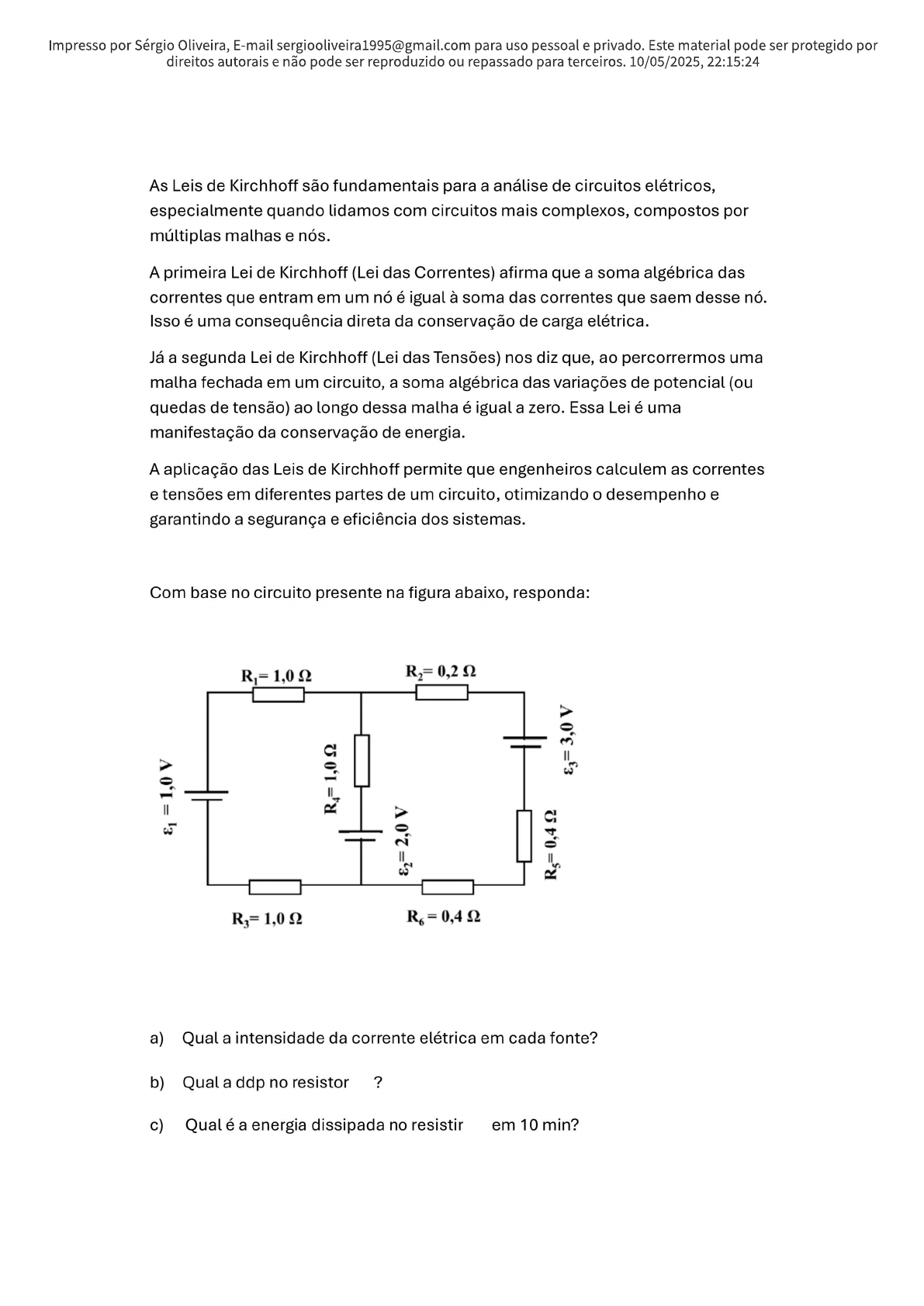 Impresso por Sérgio Oliveira, E-mail sergiooliveira1995@gmail.com para uso pessoal e privado. Este material pode ser protegido por direitos autorais e não pode ser reproduzido ou repassado para terceiros. 10/05/2025, 22:15:24 As Leis de Kirchhoff são fundamentais para a análise de circuitos elétricos, especialmente quando lidamos com circuitos mais complexos, compostos por múltiplas malhas e nós. A primeira Lei de Kirchhoff (Lei das Correntes) afirma que a soma algébrica das correntes que entram em um nó é igual à soma das correntes que saem desse nó. Isso é uma consequência direta da conservação de carga elétrica. Já a segunda Lei de Kirchhoff (Lei das Tensões) nos diz que, ao percorrermos uma malha fechada em um circuito, a soma algébrica das variações de potencial (ou quedas de tensão) ao longo dessa malha é igual a zero. Essa Lei é uma manifestação da conservação de energia. A aplicação das Leis de Kirchhoff permite que engenheiros calculem as correntes e tensões em diferentes partes de um circuito, otimizando o desempenho e garantindo a segurança e eficiência dos sistemas. Com base no circuito presente na figura abaixo, responda: R6 a) Qual a intensidade da corrente elétrica em cada fonte? b) Qual a ddp no resistor ? c) Qual é a energia dissipada no resistir em 10 min?