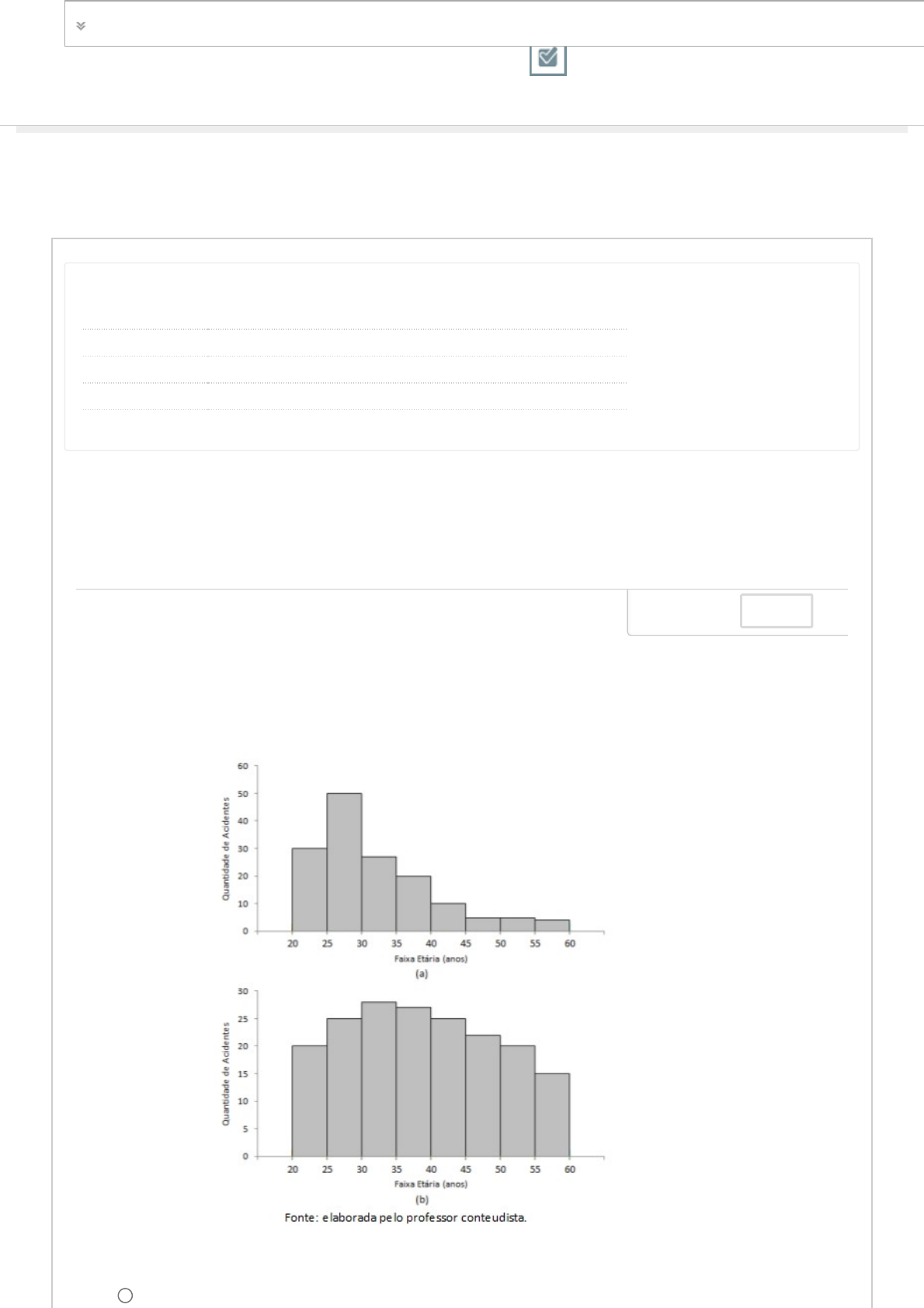 Fazer teste: AS I Bioestatística - 80h_Turma_04_112021_(4.0) Material Referencial ATIVIDADES DA DISCIPLINA Fazer teste: AS I Informações do teste Descrição Instruções Várias tentativas Este teste permite 2 tentativas. Esta é a tentativa número 1. Forçar conclusão Este teste pode ser salvo e retomado posteriormente. Suas respostas foram salvas automaticamente. a. PERGUNTA 1 A secretaria de saúde coletou dados de pacientes socorridos em acidentes de trânsito e suas respectivas idades. A seguir figura o histograma de frequências de casos quando o acidente envolveu pessoas embriagadas (a) e quando não houve relato de pessoas embriagadas (b): Com base na análise dos dois perfis de histograma, assinale a alternativa CORRETA: Quando o acidente não envolve embriagados, a faixa etária 0,15 pontos Salva ? Estado de Conclusão da Pergunta: https://bb.cruzeirodosulvirtual.com.br/webapps/blackboard/execute/courseMain?course_id=_759660_1 https://bb.cruzeirodosulvirtual.com.br/webapps/blackboard/content/listContent.jsp?course_id=_759660_1&content_id=_10275533_1&mode=reset https://bb.cruzeirodosulvirtual.com.br/webapps/blackboard/content/listContent.jsp?course_id=_759660_1&content_id=_10275550_1&mode=reset b. c. d. e. predominante é a de 25 a 30 anos. Os perfis de casos por tipo de acidente (com/sem embriagados) não parecem estar relacionados à faixa etária, uma vez que ambos são bem parecidos. Quando se trata de acidentes envolvendo embriagados, a faixa etária de maior frequência é a de 55 a 60 anos. Quando se trata de acidentes envolvendo pessoas embriagadas existe maior concentração de casos nas faixas etárias mais jovens, o que não ocorre para outros tipos de acidente. Os mais velhos sempre causam mais acidentes, dado o perfil de ambos os histogramas apresentados. a. b. c. d. e. PERGUNTA 2 O seguinte gráfico mostra a quantidade média de pacientes atendidos em um posto de vacinação logo após a divulgação de uma campanha para combate ao sarampo: A campanha não surtiu nenhum efeito, uma vez que a procura pelo posto de saúde se manteve estável. A campanha deve ser feita com intervalo mínimo de 4 dias para não sobrecarregar o posto de saúde, dada a sua capacidade máxima de 200 atendimentos por dia. A campanha deu certo e deveria ser feita diariamente, uma vez que não foi atingida a capacidade máxima de atendimentos do posto de saúde. Os dados mostram que a campanha sobrecarregou o posto de saúde no dia de lançamento, porém, no dia seguinte a situação já estava sob controle. A população demorou a responder à campanha, uma vez que o pico de pacientes ocorre ários dias após a referida campanha 0,15 pontos Salva Estado de Conclusão da Pergunta: Clique em Salvar e Enviar para salvar e enviar. Clique em Salvar todas as respostas para salvar todas as respostas. de pacientes ocorreu vários dias após a referida campanha. a. b. c. d. e. PERGUNTA 3 A média aritmética, mediana e moda são tipos diferentes de gráficos estatísticos. medidas de tendência central e servem para resumir uma série de dados. medidas de variação e servem para medir a dispersão de uma série de dados. medidas de tendência central e servem para medir a dispersão de uma série de dados. medidas de variação e servem para resumir uma série de dados. 0,15 pontos Salva a. b. c. d. e. PERGUNTA 4 Um pesquisador deseja verificar a efetividade do uso de medicamento homeopático no tratamento de câncer de mama. Para isso, ele planeja fazer um experimento usando dois grupos de camundongos, ambos com células cancerígenas nas mamas. O Grupo A receberá o tratamento homeopático diário, enquanto o Grupo B não receberá tratamento algum (controle). Após a morte dos camundongos será analisado o tamanho dos tumores (em milímetros), o tempo de sobrevivência (em dias completos) e a presença de metástase (com metástase/sem metástase). As variáveis de tamanho do tumor, tempo de sobrevivência e presença de metástase são, RESPECTIVAMENTE: Qualitativa nominal, qualitativa ordinal, qualitativa nominal. Todas quantitativas discretas. Quantitativa contínua, quantitativa discreta, qualitativa ordinal. Todas qualitativas contínuas. Quantitativa contínua, quantitativa discreta, qualitativa nominal. 0,15 pontos Salva Salvar todas as respostas Salvar e Enviar Estado de Conclusão da Pergunta: